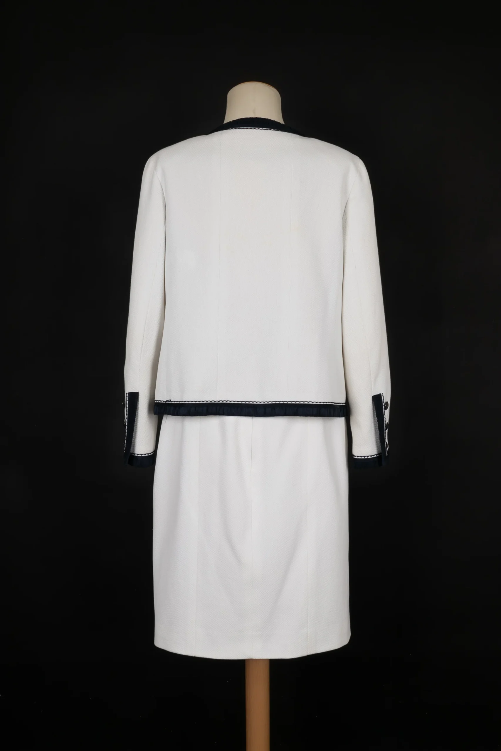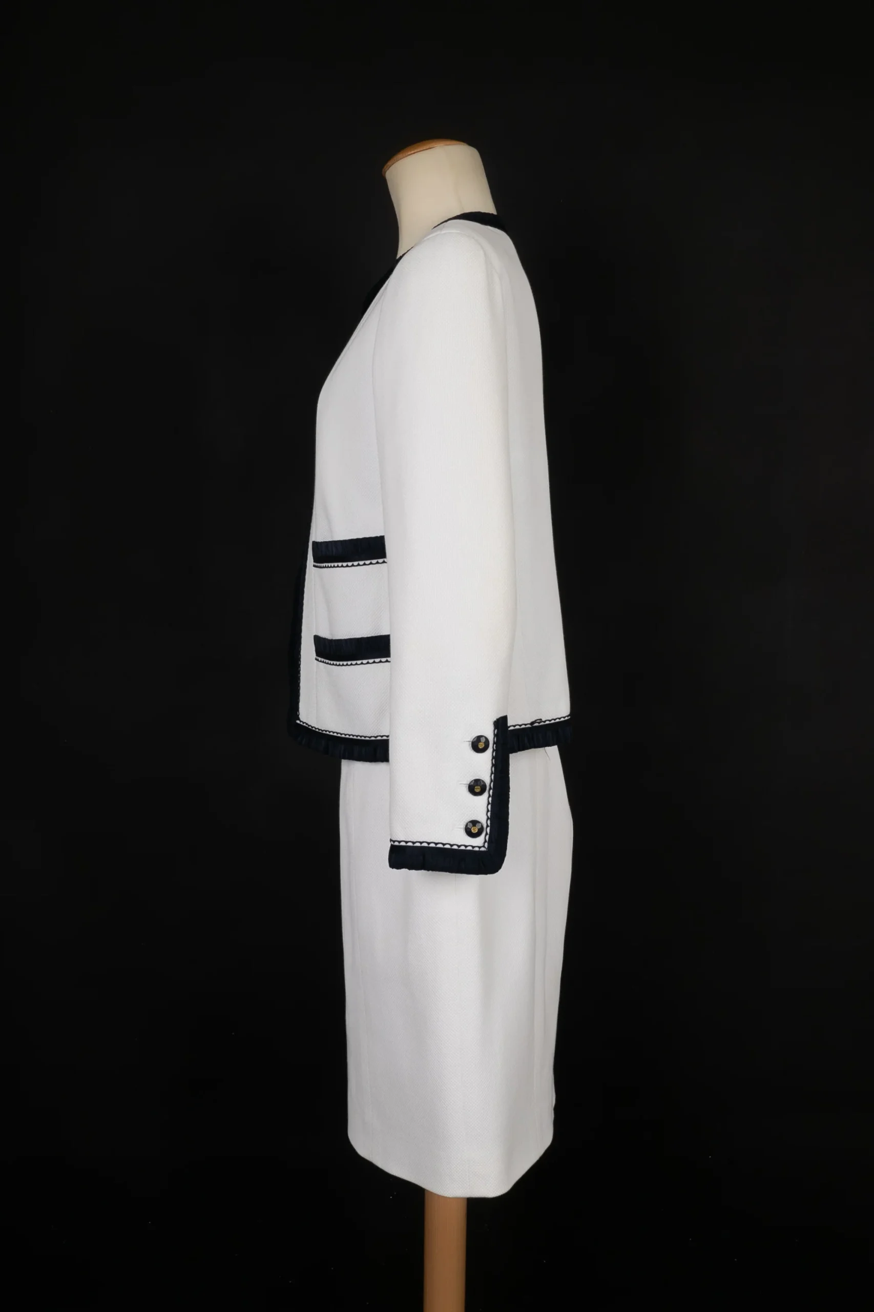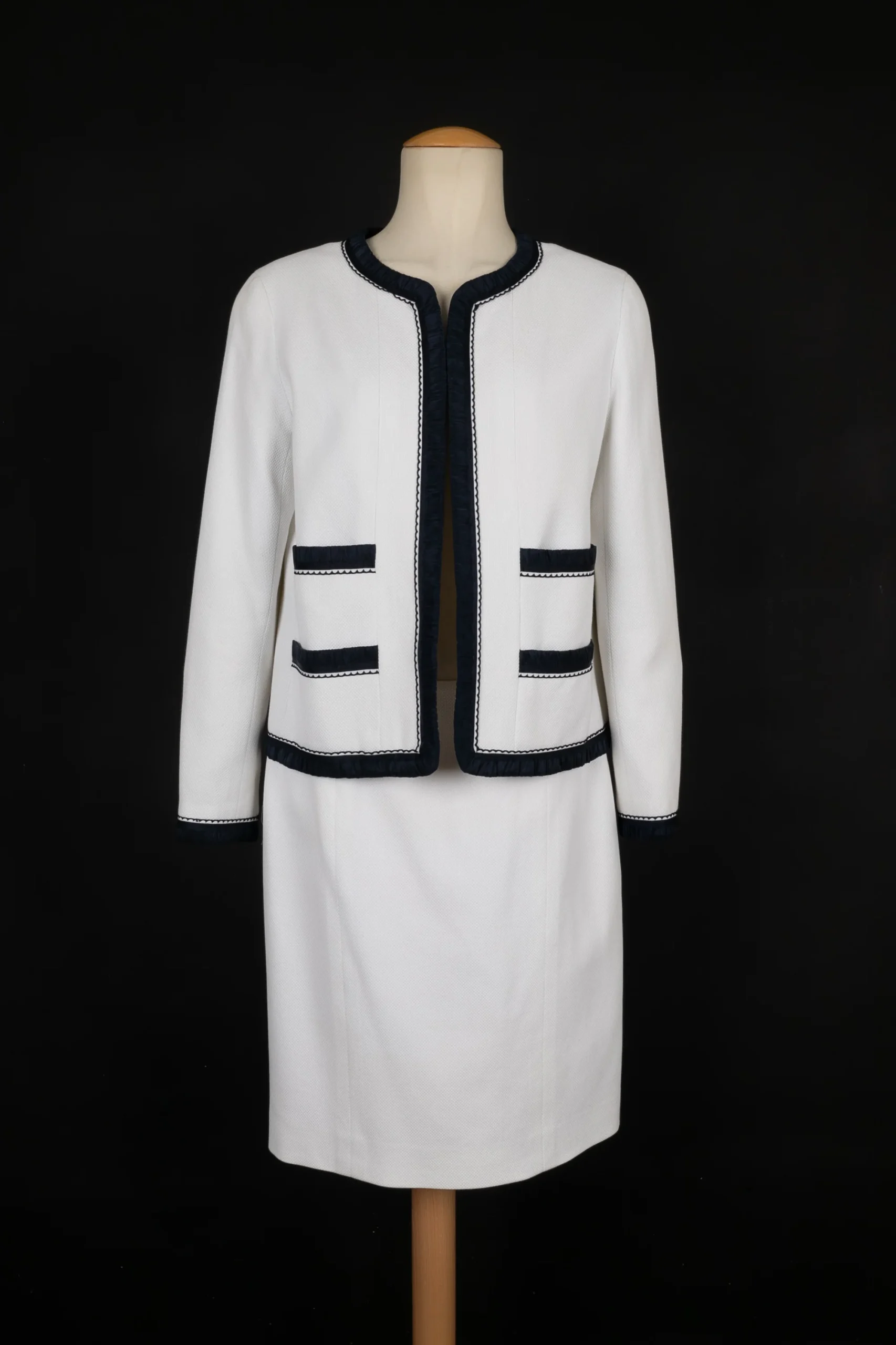 CHANEL -Ensemble composé d’une veste et jupe en coton blanc bordé de soie bleu marine. Doublure en soie. Taille indiquée 42FR.