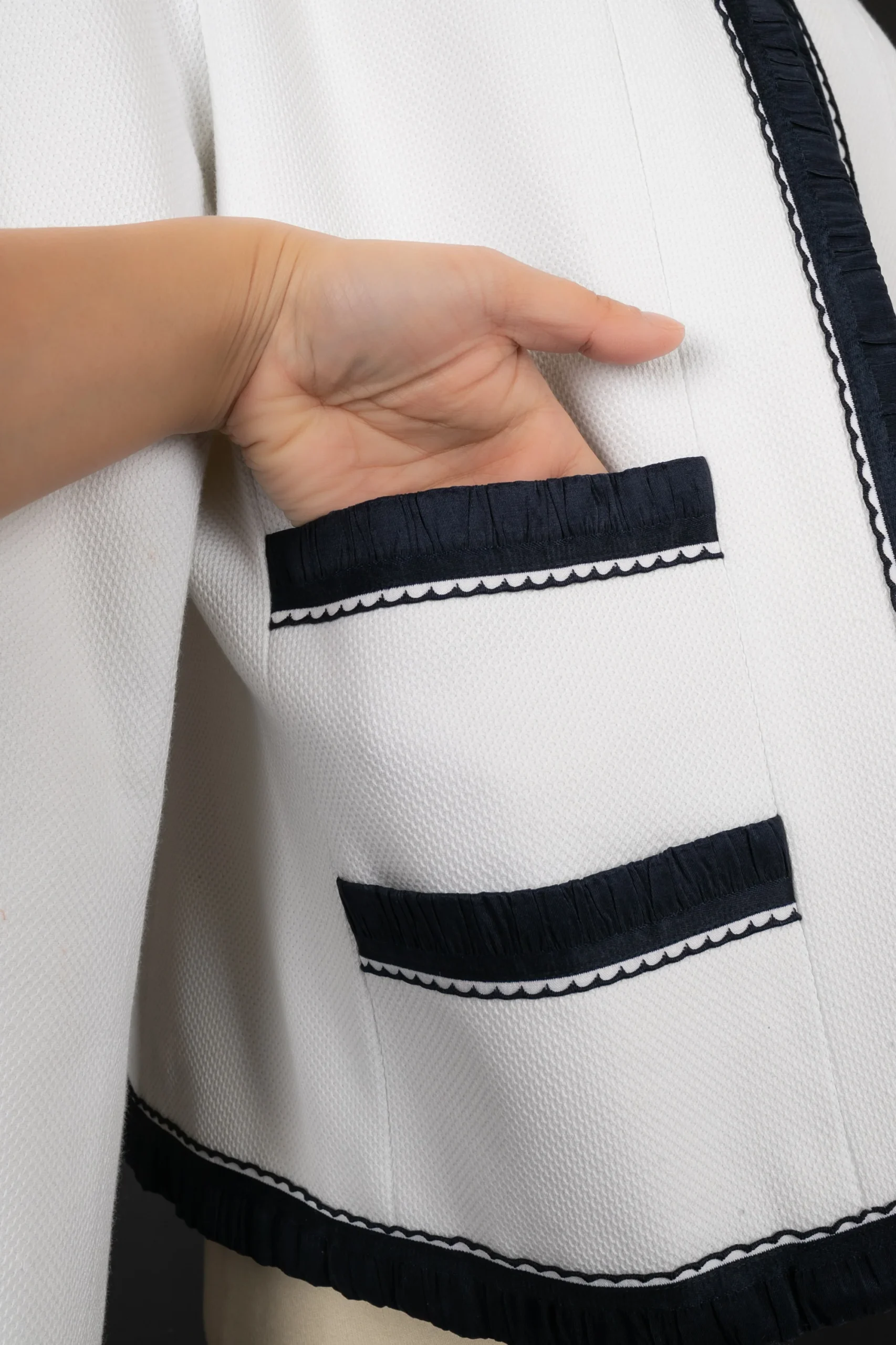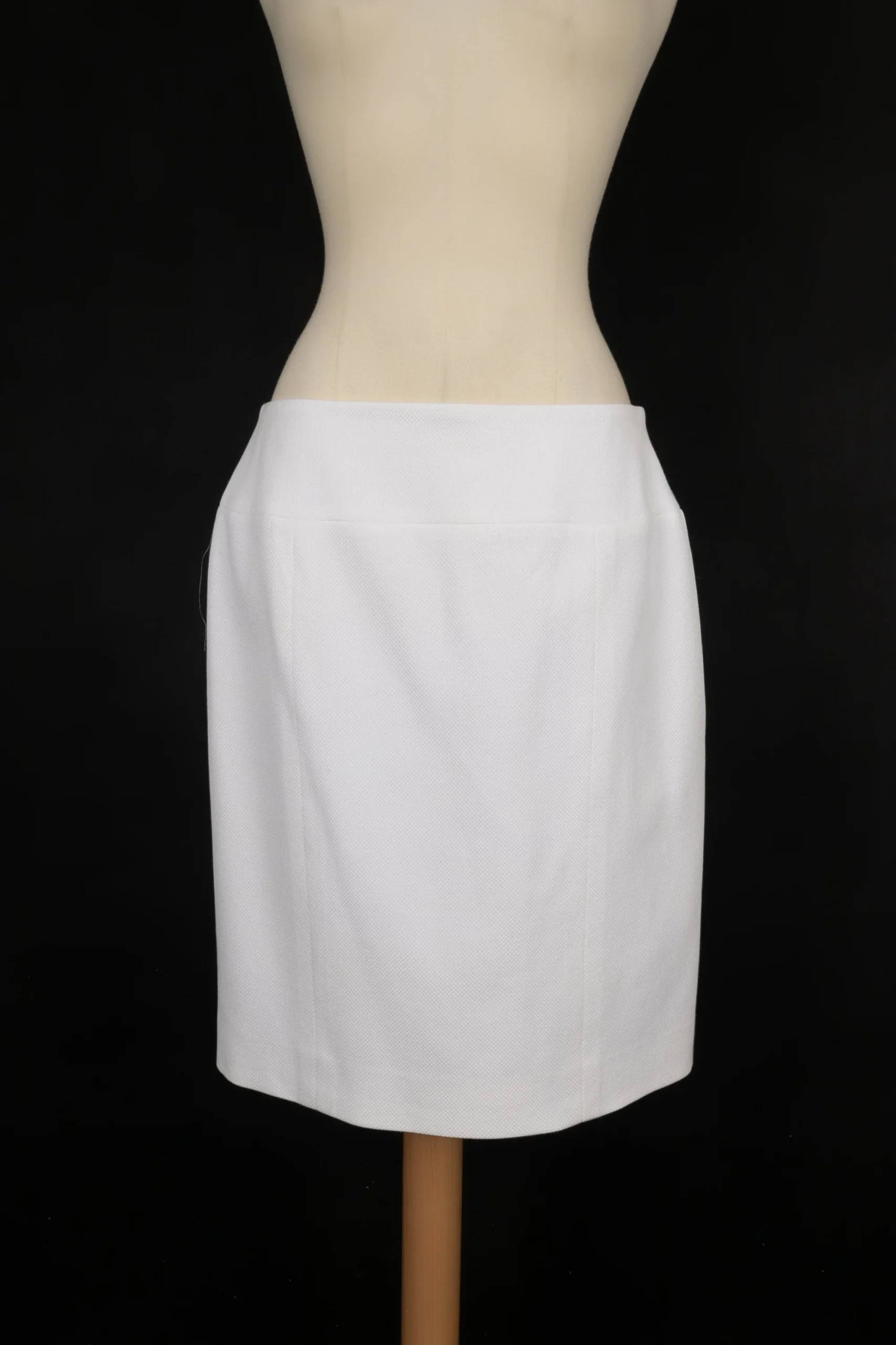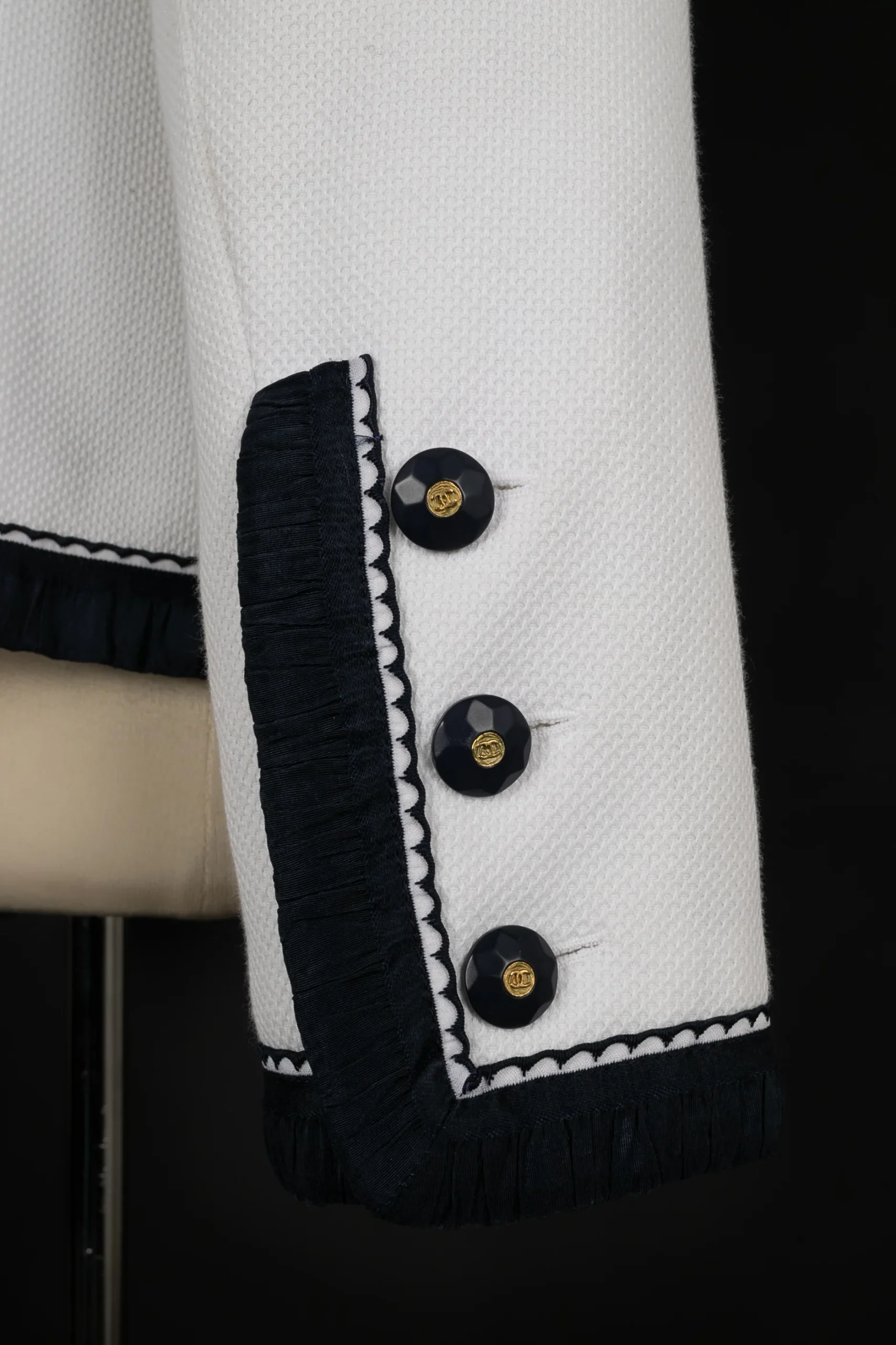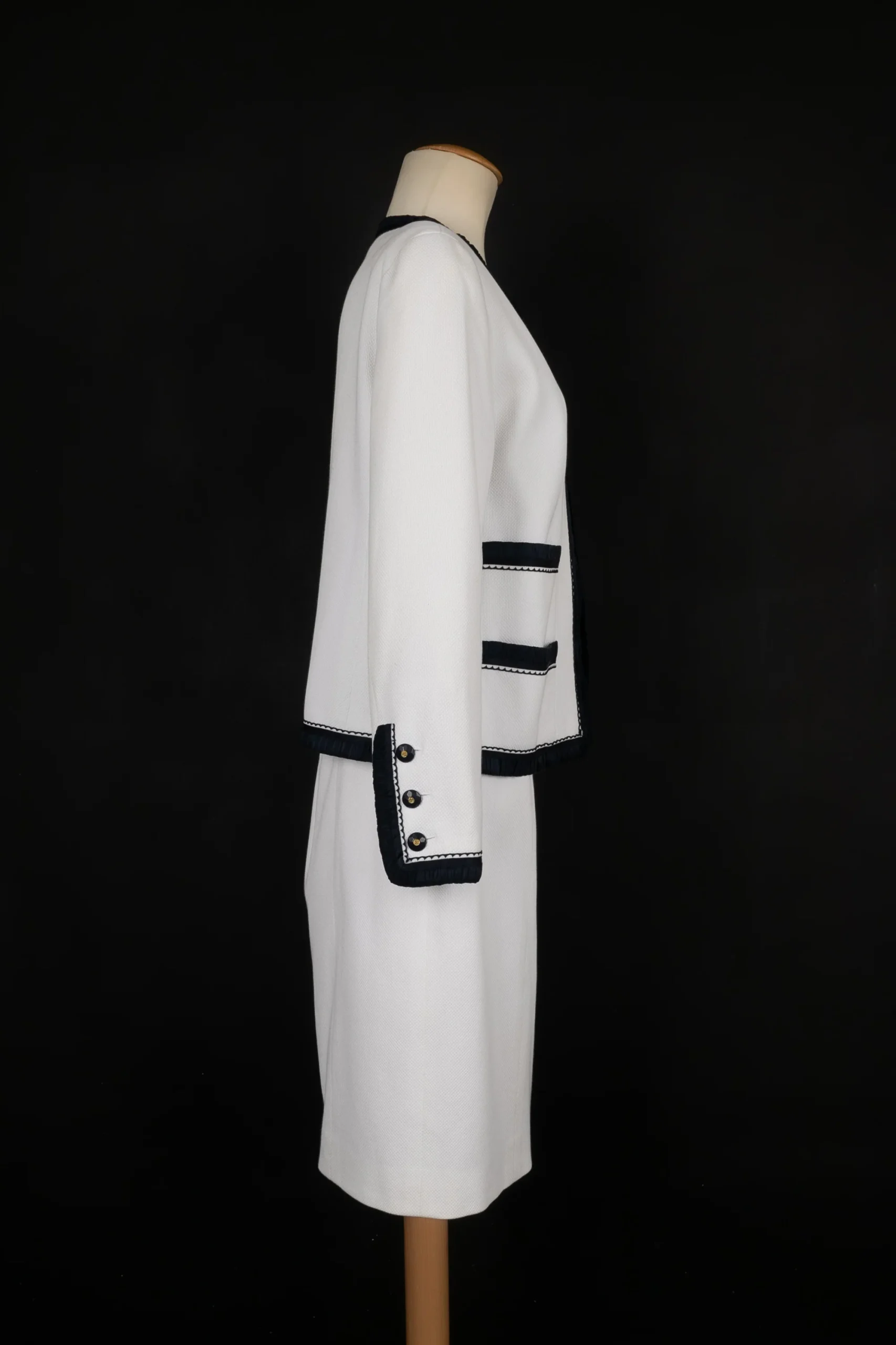 CHANEL -Ensemble composé d’une veste et jupe en coton blanc bordé de soie bleu marine. Doublure en soie. Taille indiquée 42FR.