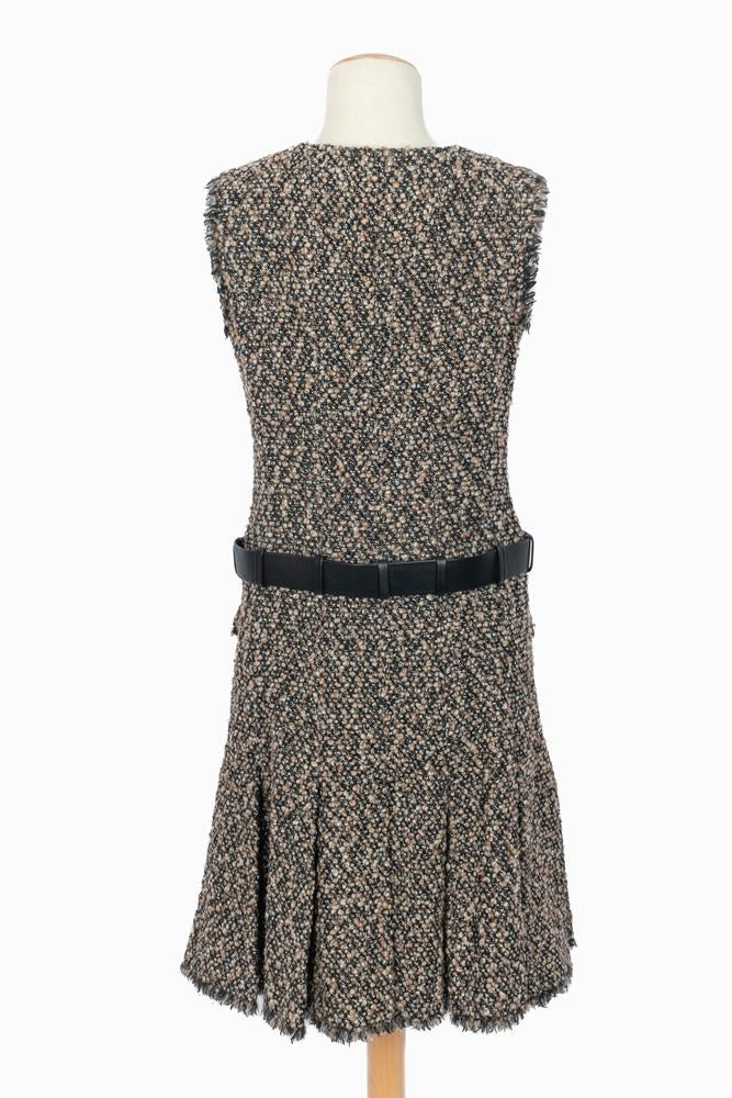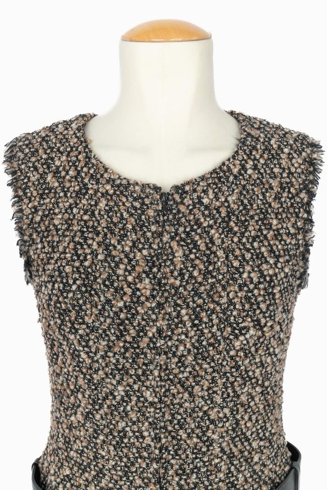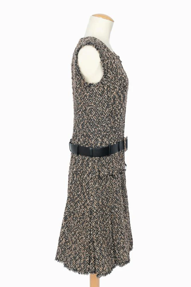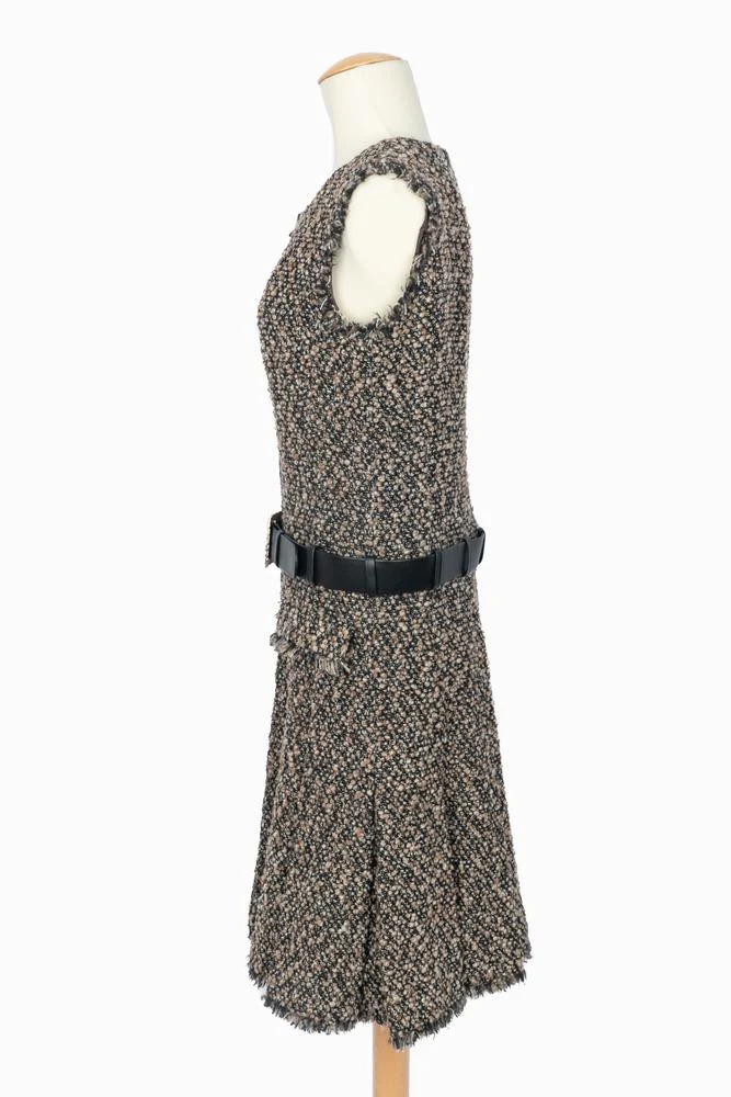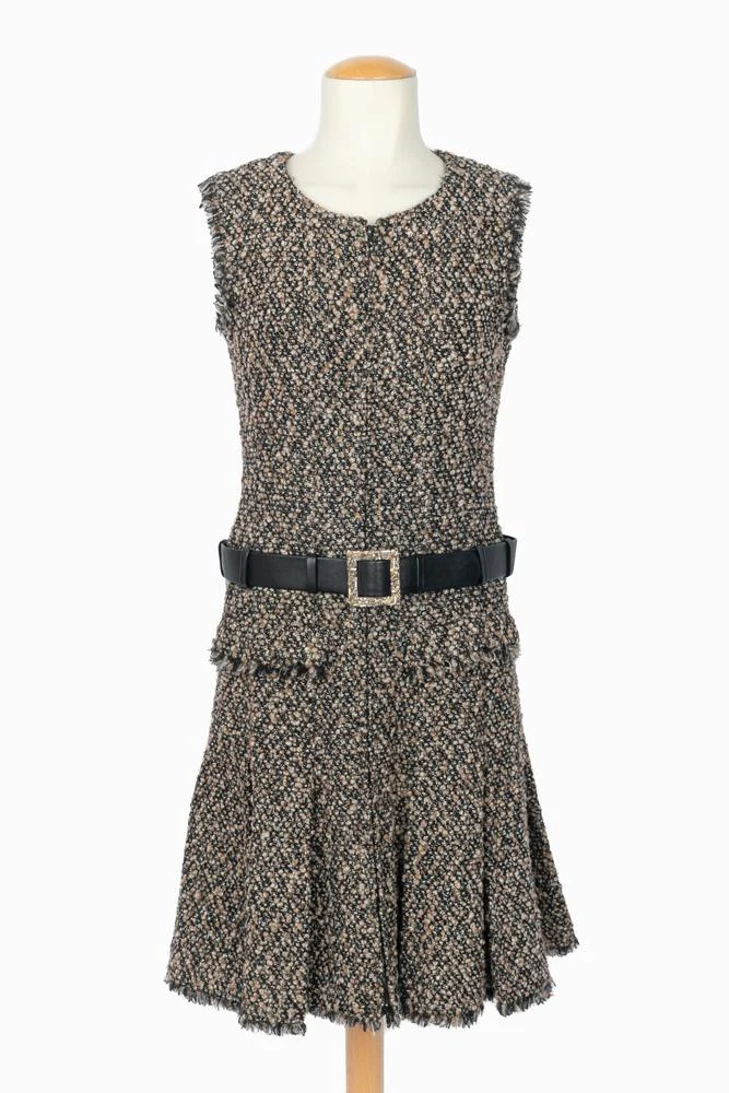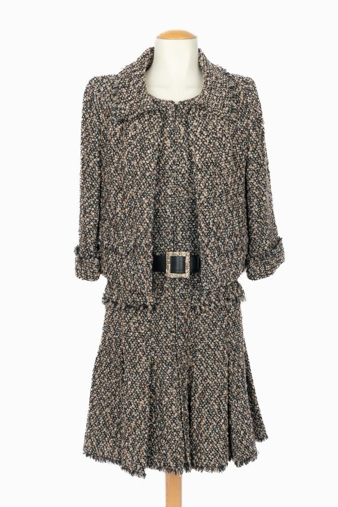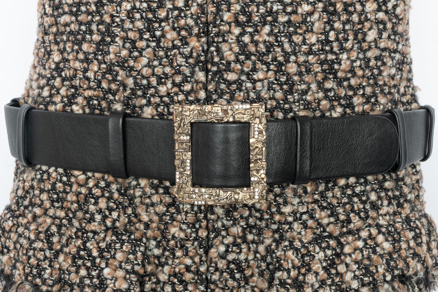 CHANEL – Ensemble composé d’une veste et d’une robe en tweed dans les tons de brun et de noir. La robe est agrémentée d’une ceinture en cuir noir et d’une boucle en métal doré et strass. Pas de taille indiquée, il convient à un 36FR/38FR. Collection haute Couture Automne-Hiver 2004 sous la direction artistique de Karl Lagerfeld.