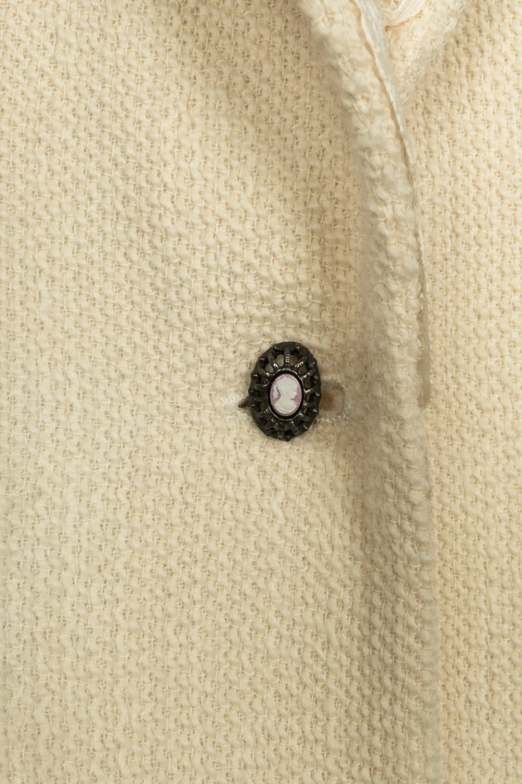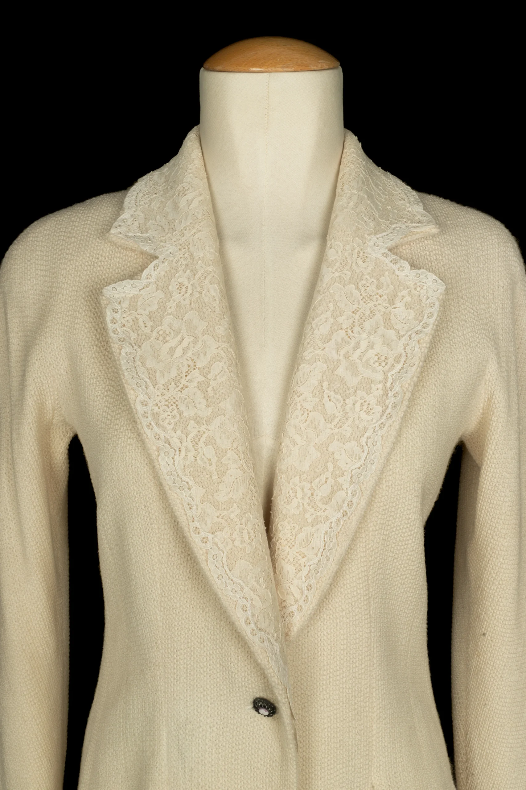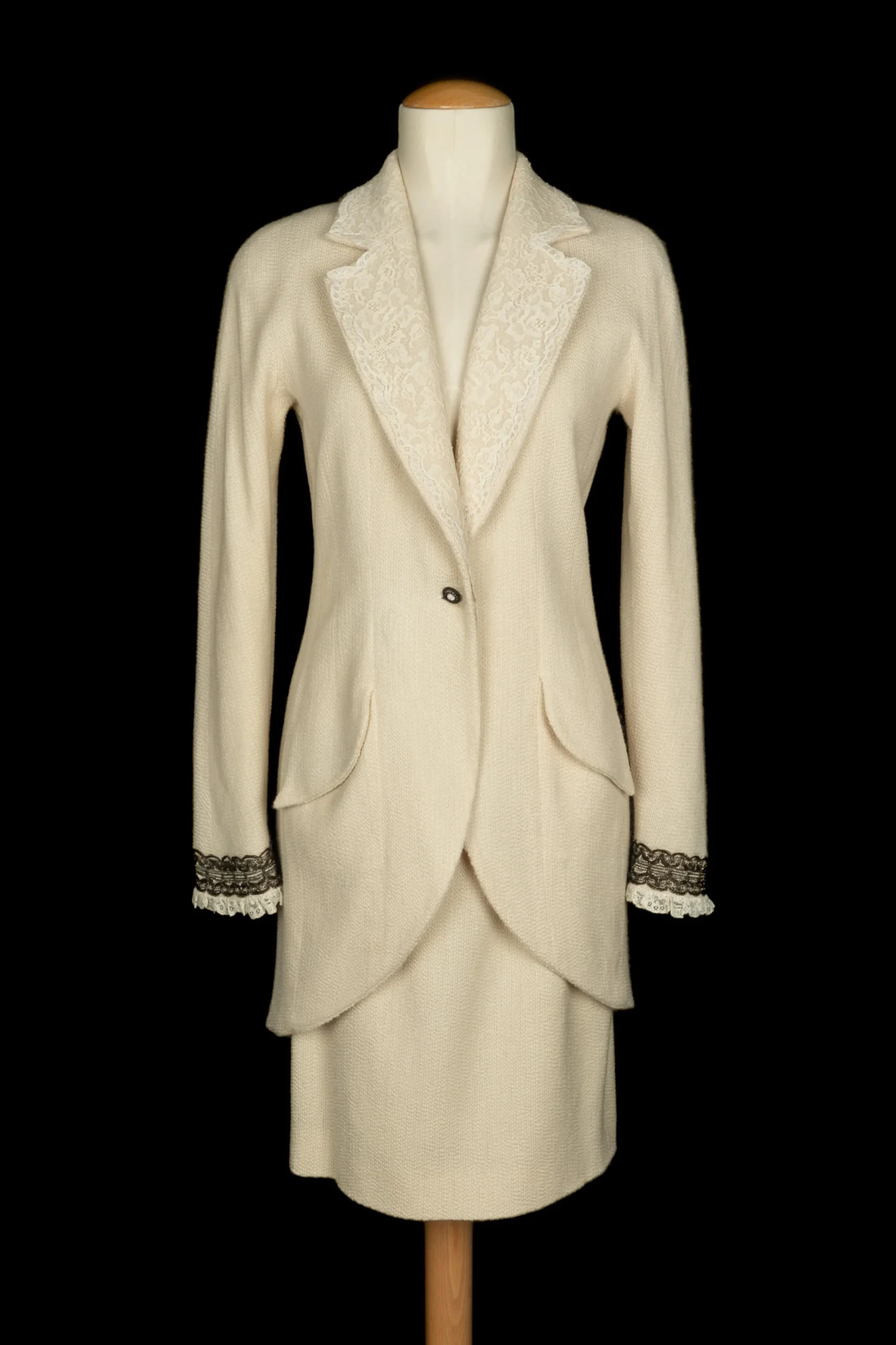 DIOR -(Made in France) Ensemble composé d’une jupe et d’une veste en laine beige, doublure en soie. Le col est surmonté d’une dentelle blanche. Le bas de manches est décoré d’un gallon et de dentelle. Taille indiquée 40 FR. Collection Printemps-Eté 1998 sous la direction artistique de John Galliano.