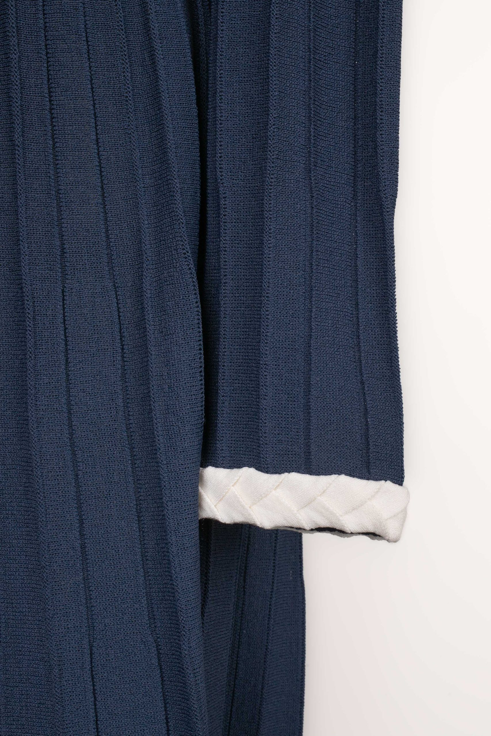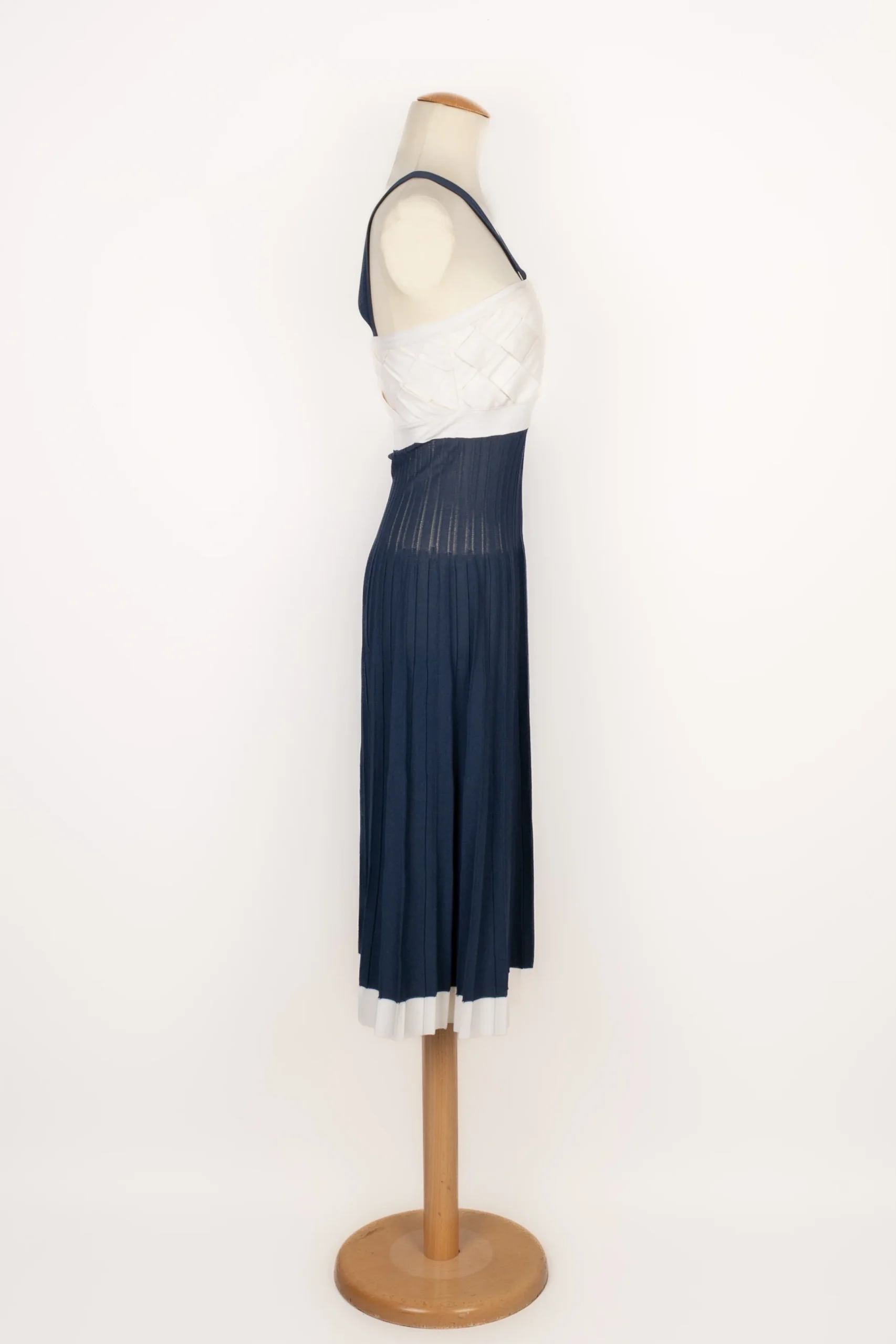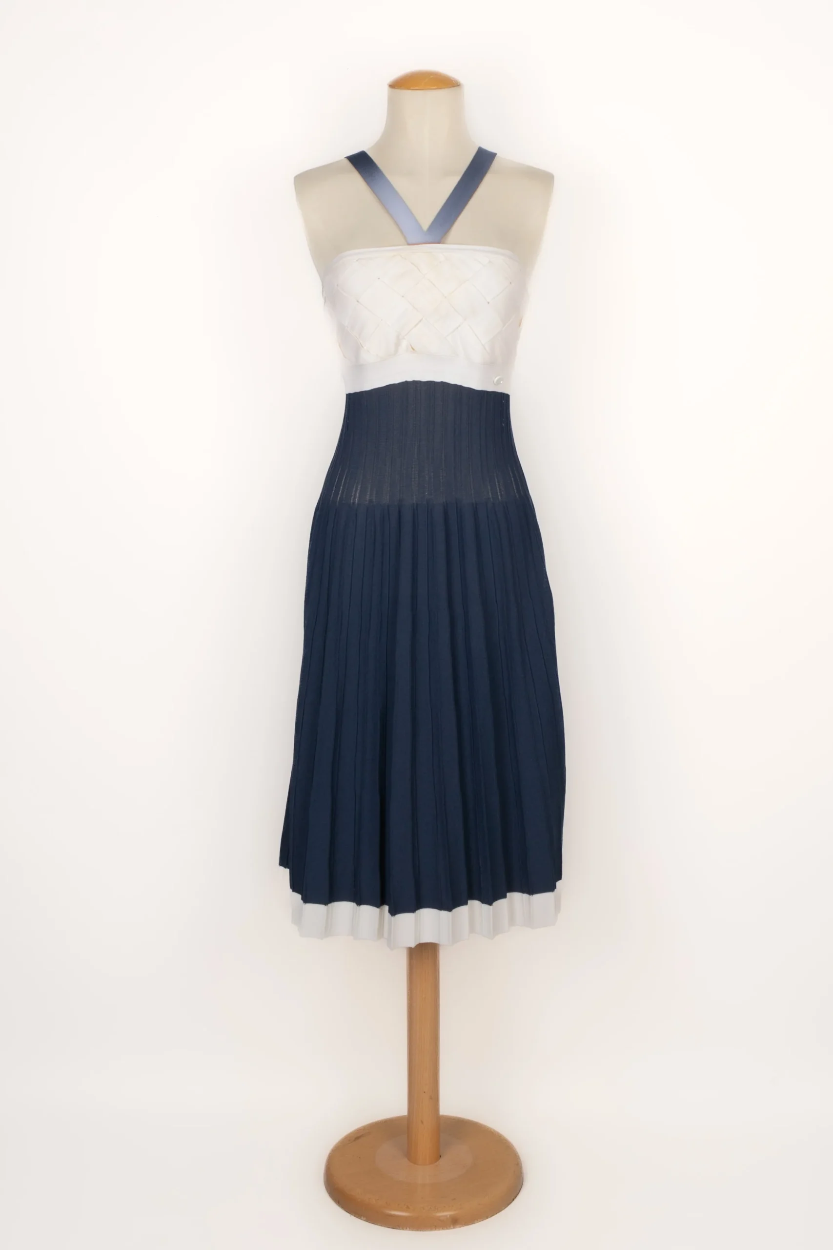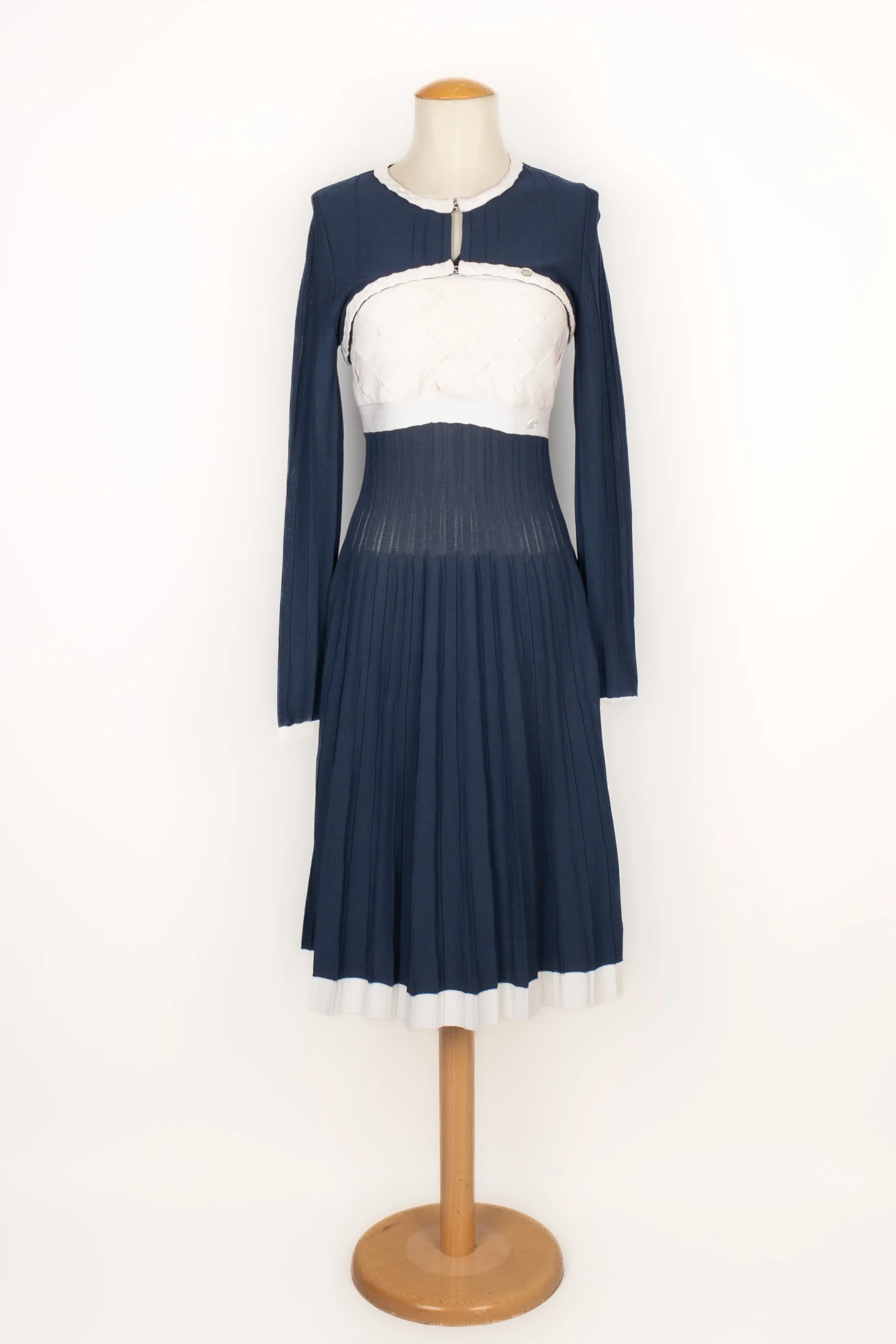 CHANEL -(Made in France) Ensemble robe mi-longue et top court bleu marine et blanc. Taille indiquée 40FR. Collection Croisière 2008.
