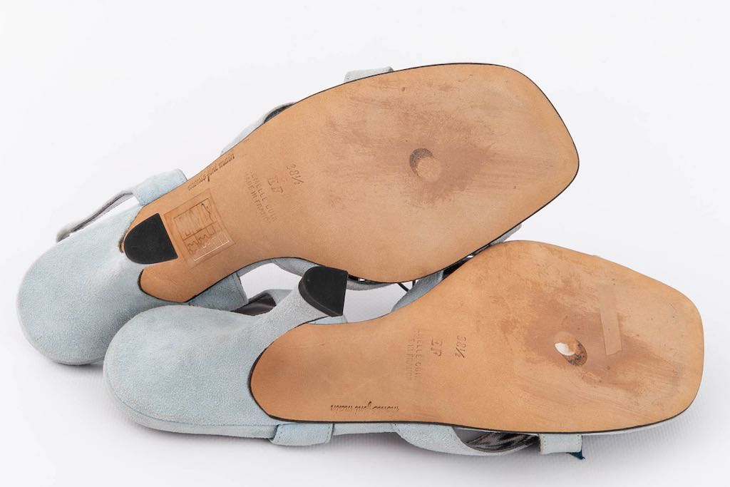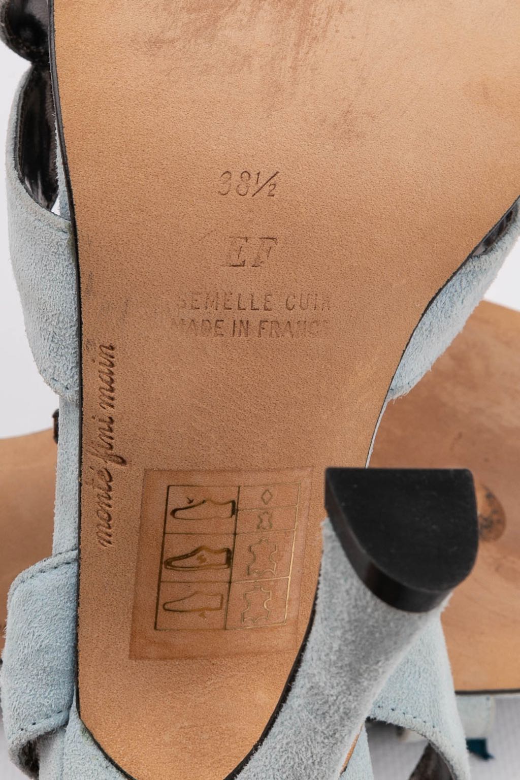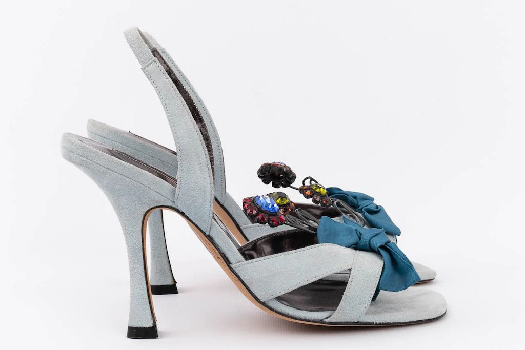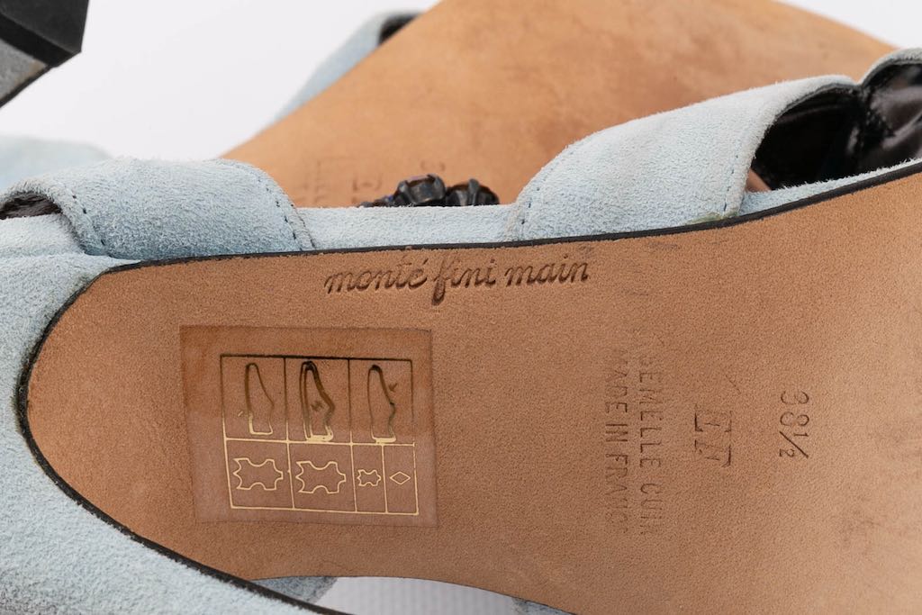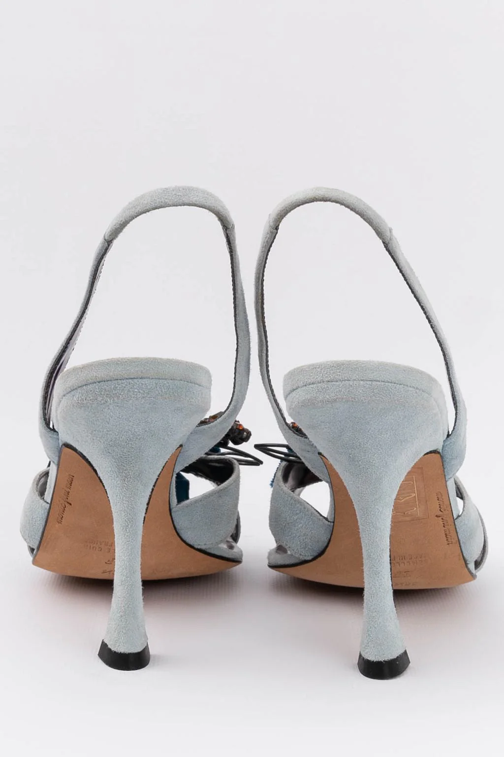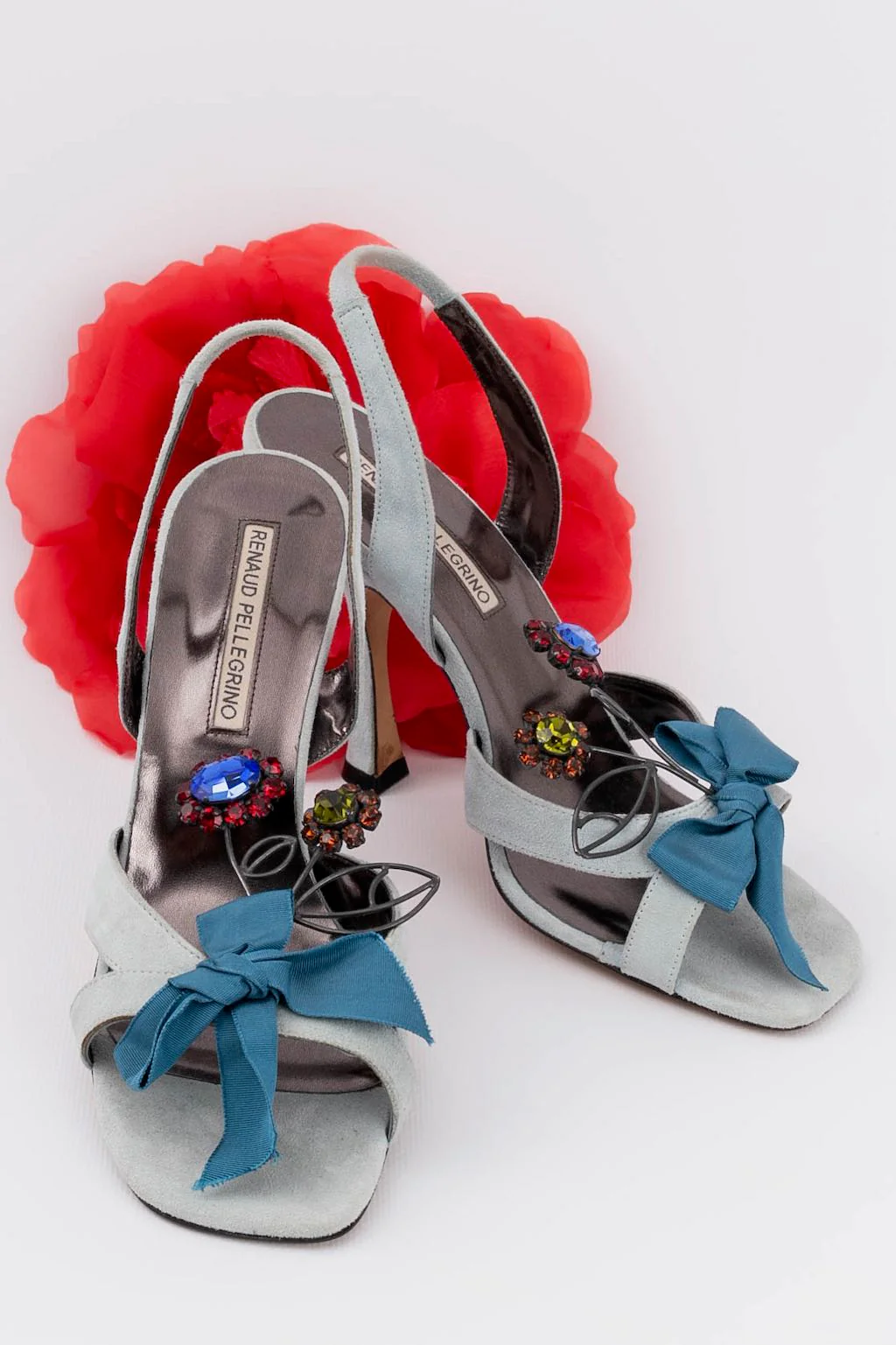 RENAUD PELLEGRINO -(Made in France) Escarpins en cuir bleu ornés d’éléments floraux. Pointure 38 1/2