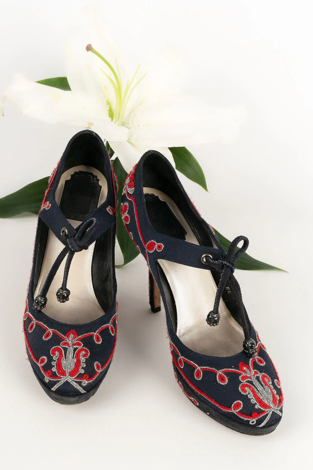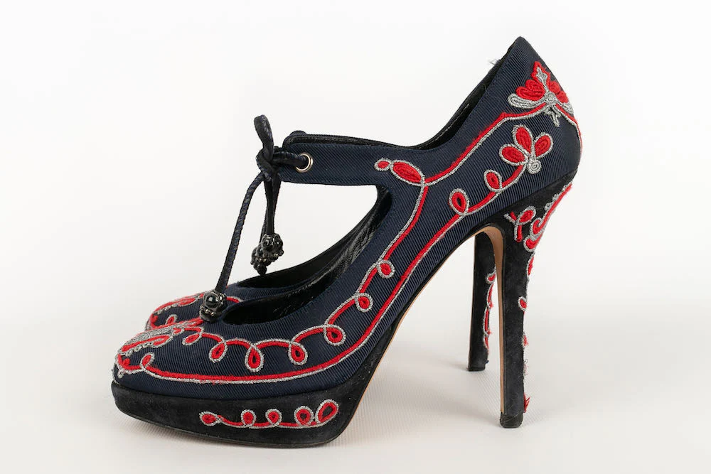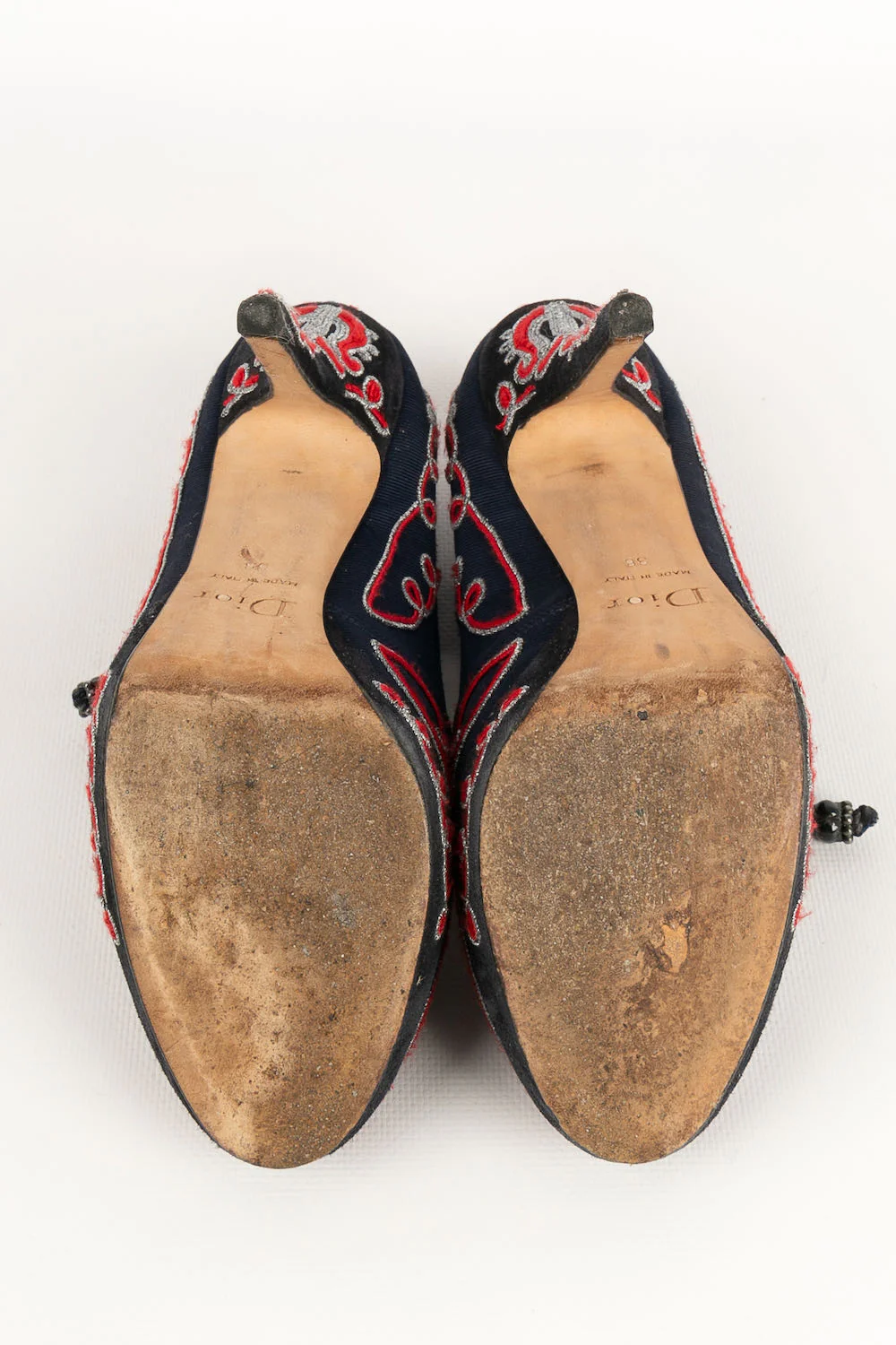DIOR -(Made in Italy) Escarpins en cuir et passementeries bleu, rouge et argenté. Pointure 36FR.