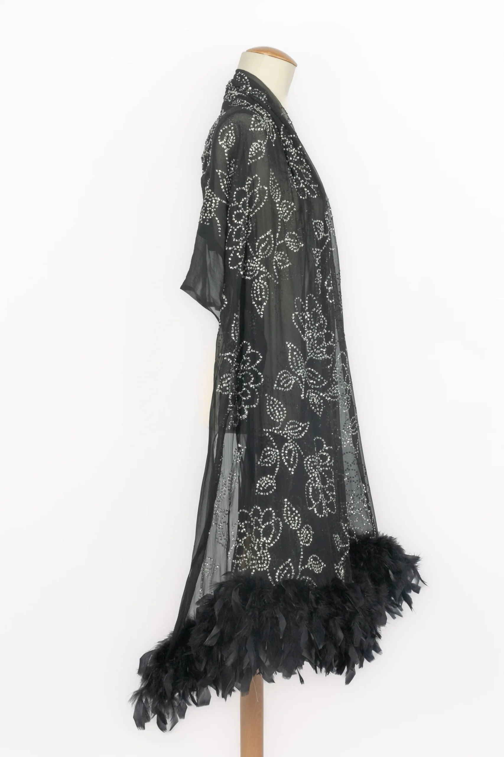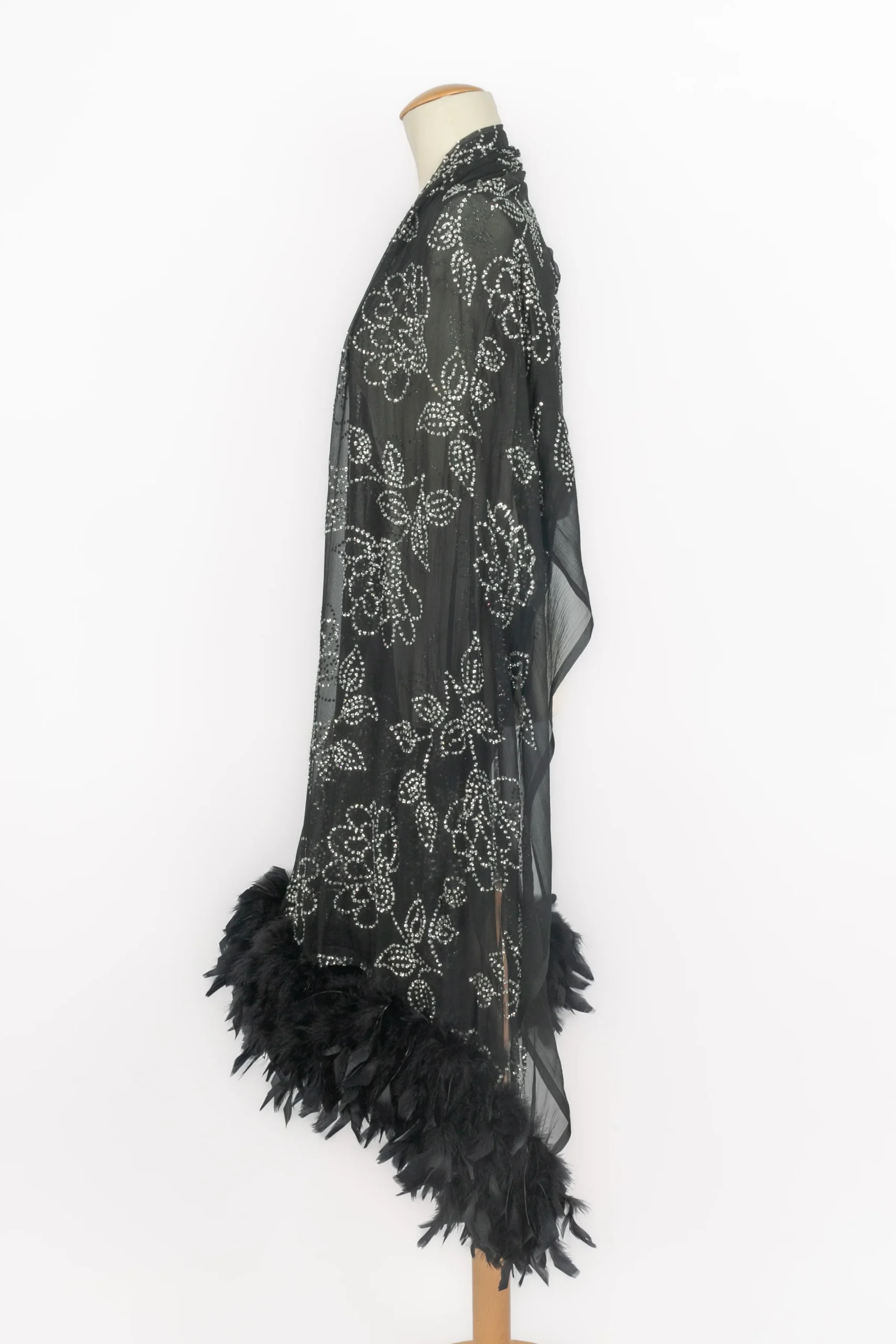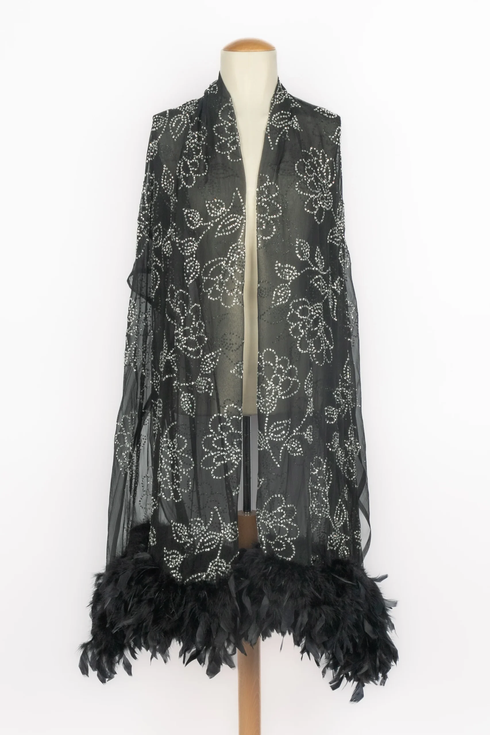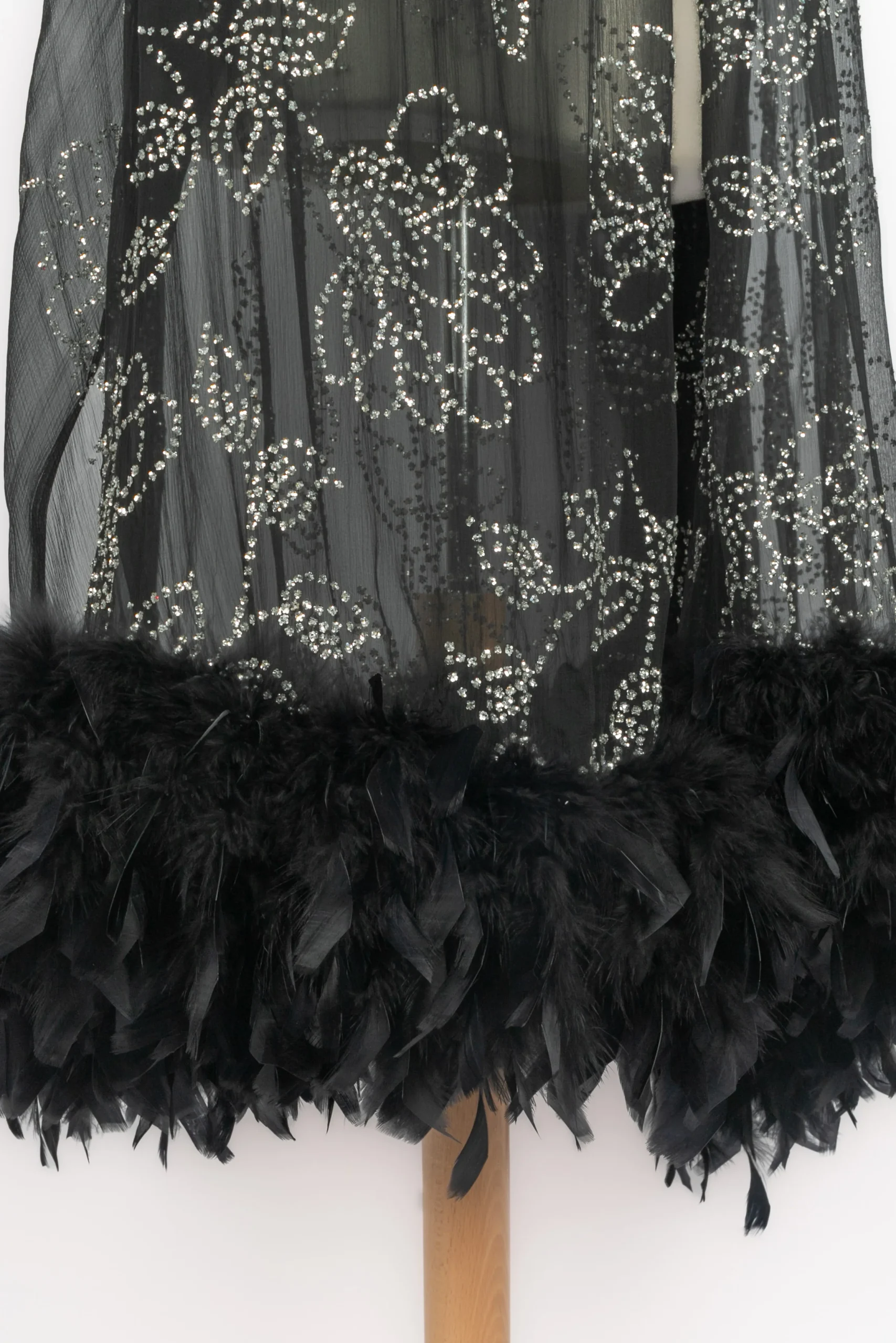 ANONYME – Longue étole en mousseline noire, strass et plumes. Pièce datant des années 1950.