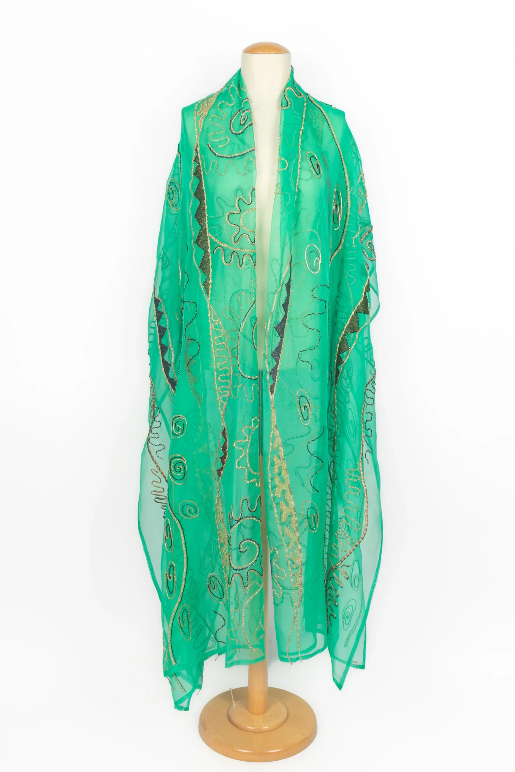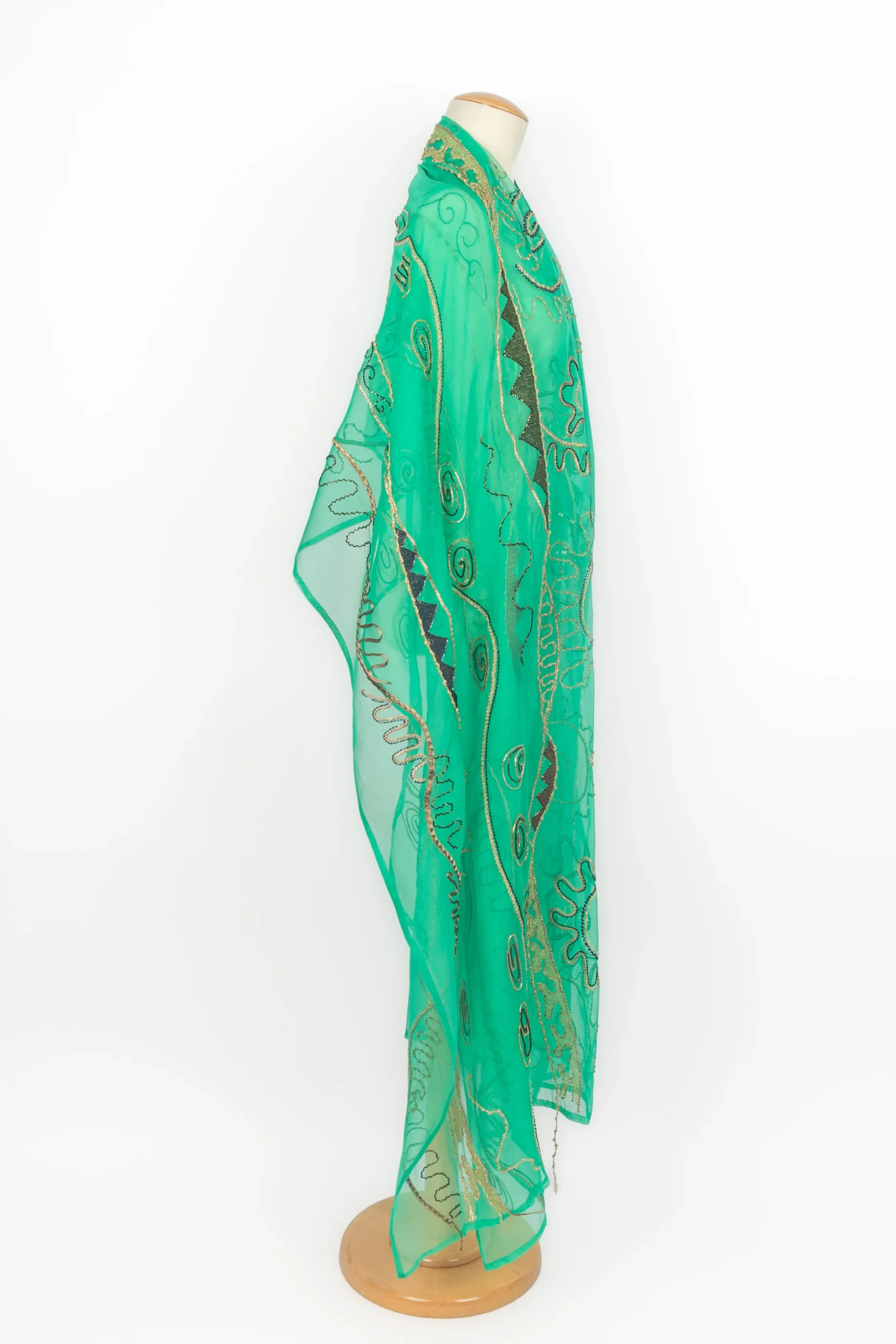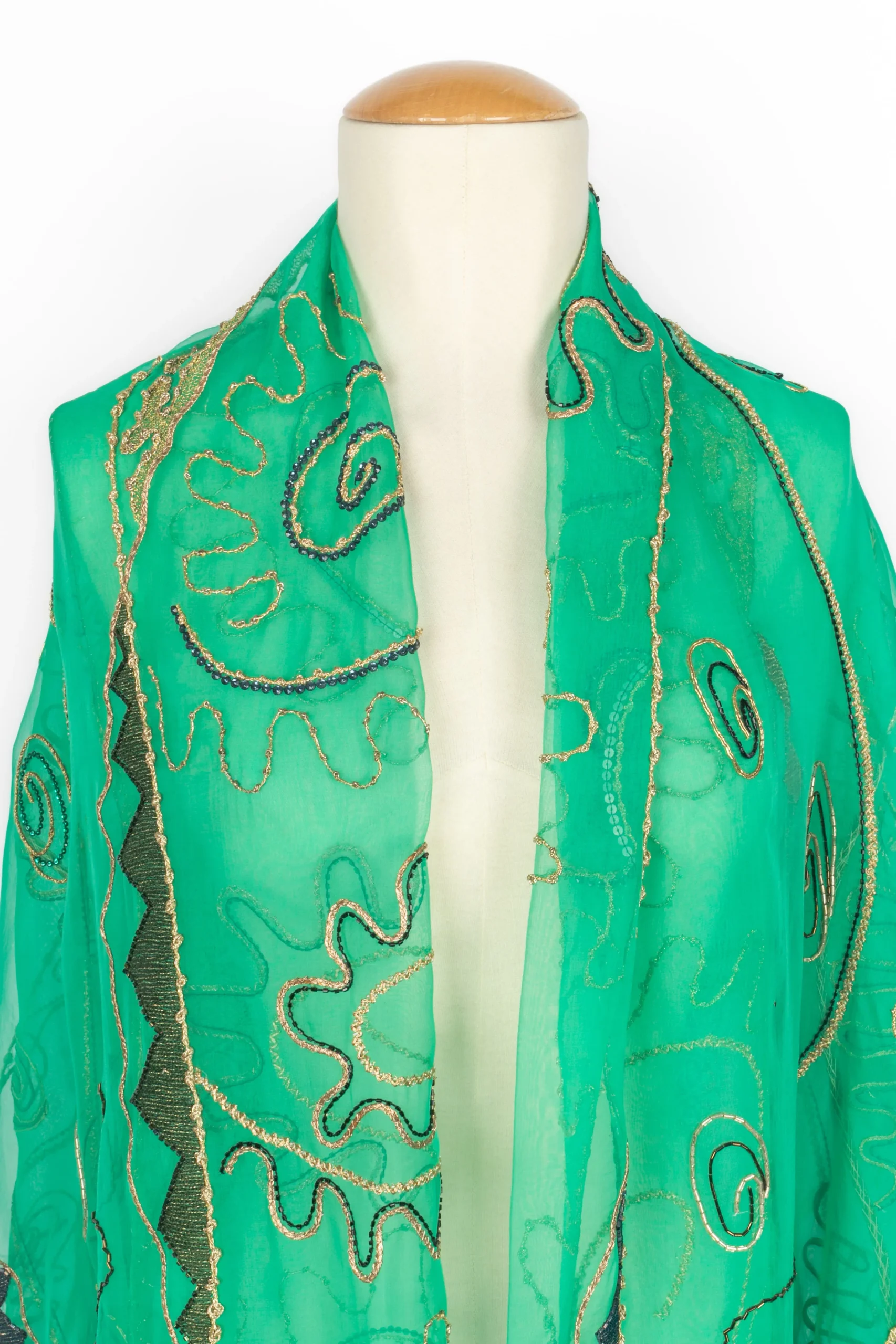 LOUIS FERAUD – Longue étole en organza verte cousue de fils doré et de paillettes. Non signée. Collection Haute Couture. Condition : Très bon état Dimensions : Longueur : 280 cm – Largeur : 118 cm