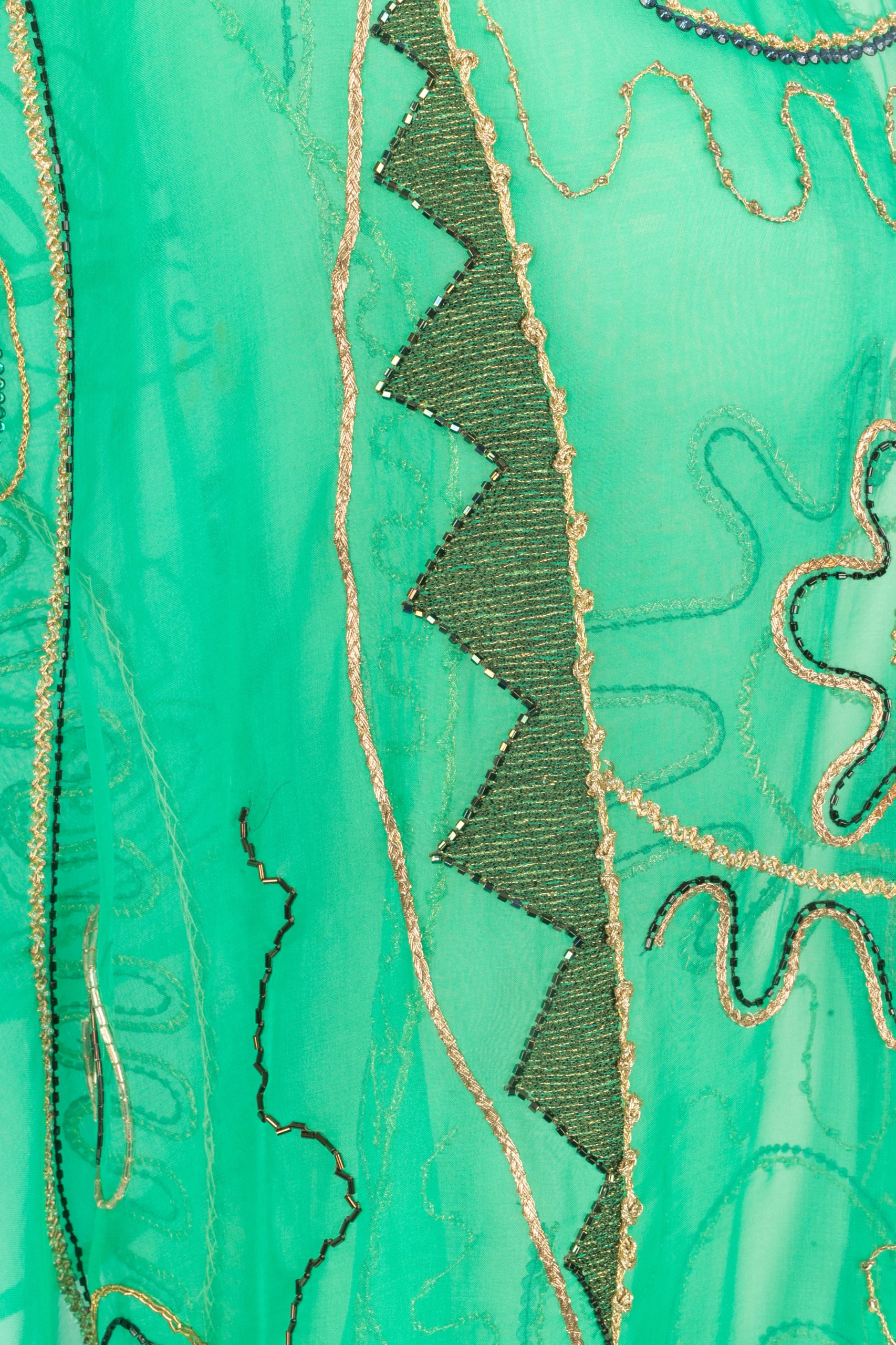 LOUIS FERAUD – Longue étole en organza verte cousue de fils doré et de paillettes. Non signée. Collection Haute Couture.