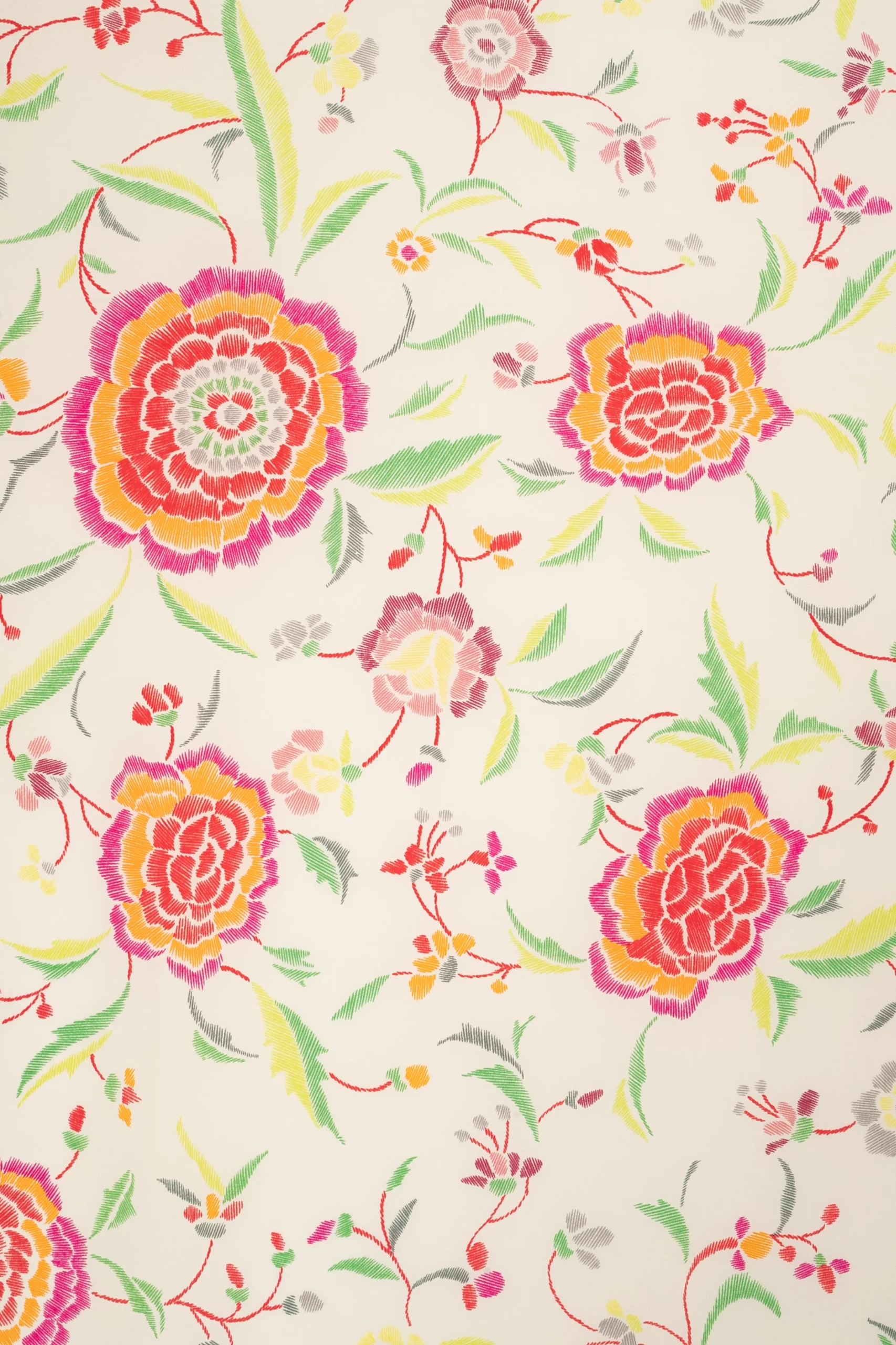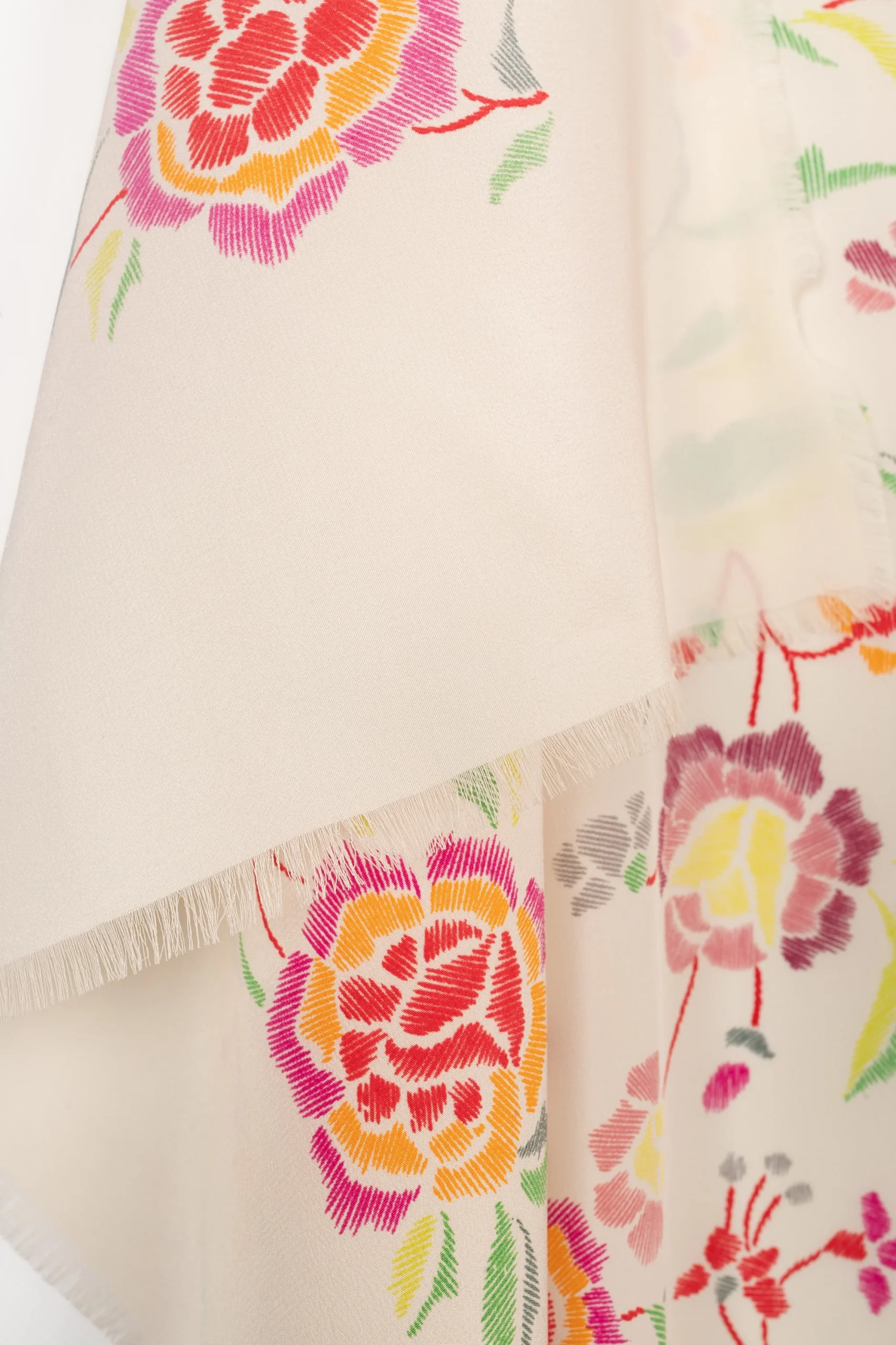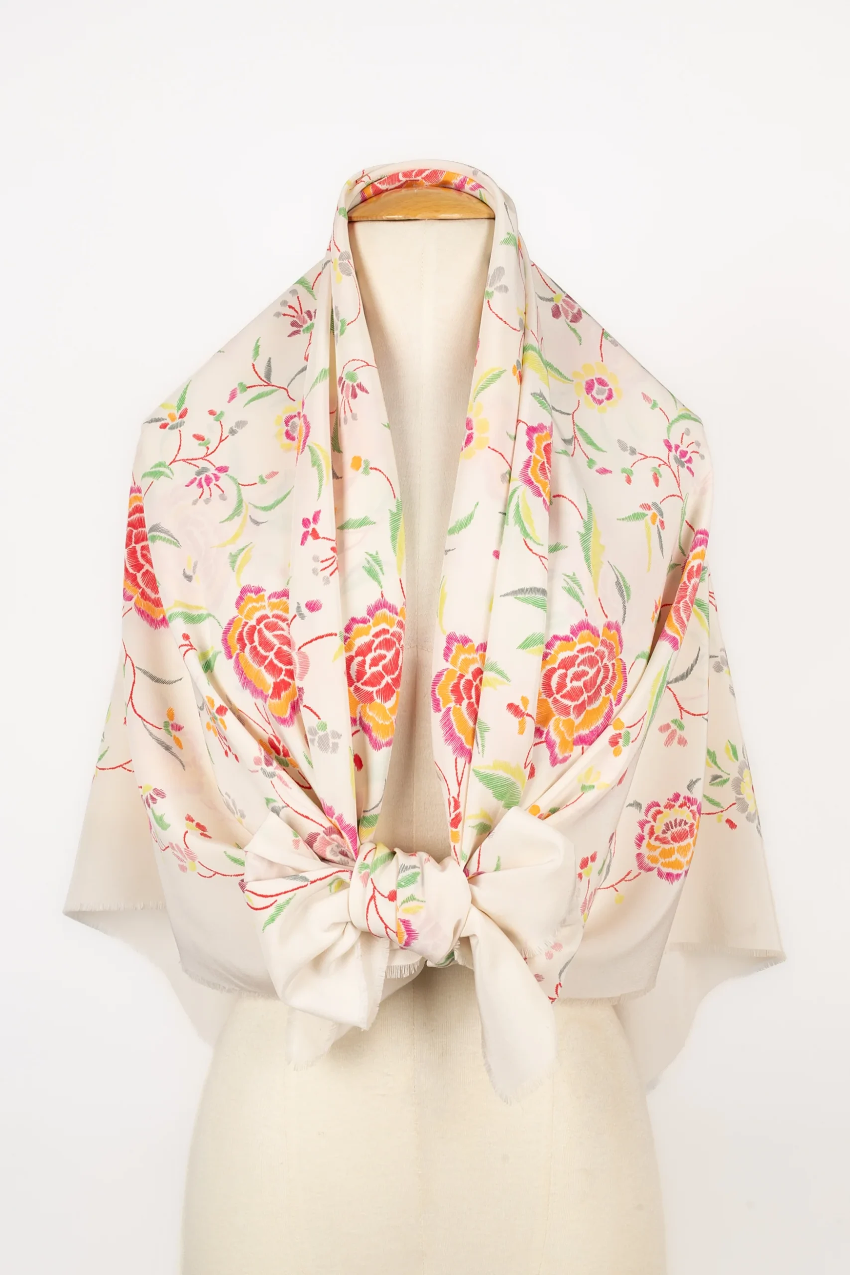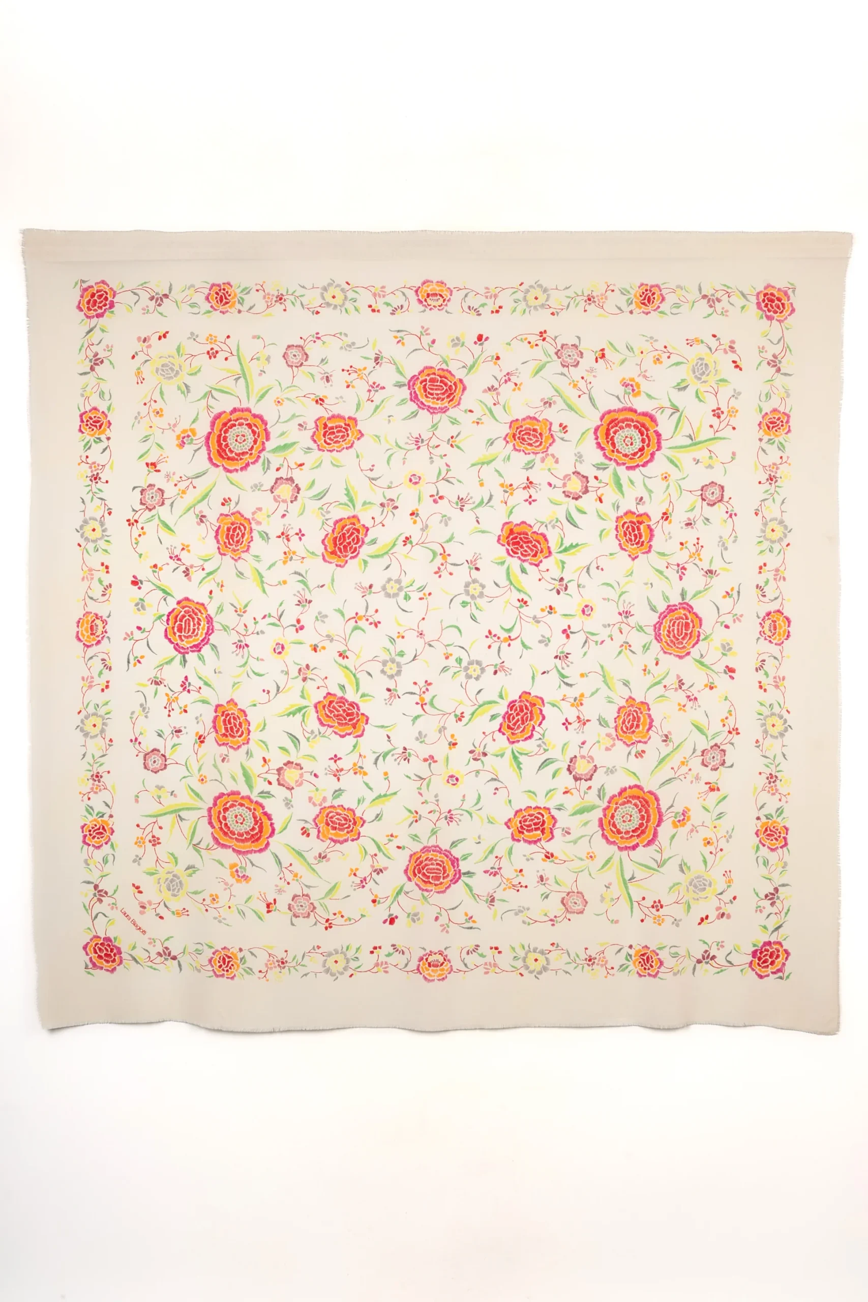 LAURA BIAGIOTTI -Grande étole en soie beige imprimée de fleurs multicolores signée Laura Biagiotti.