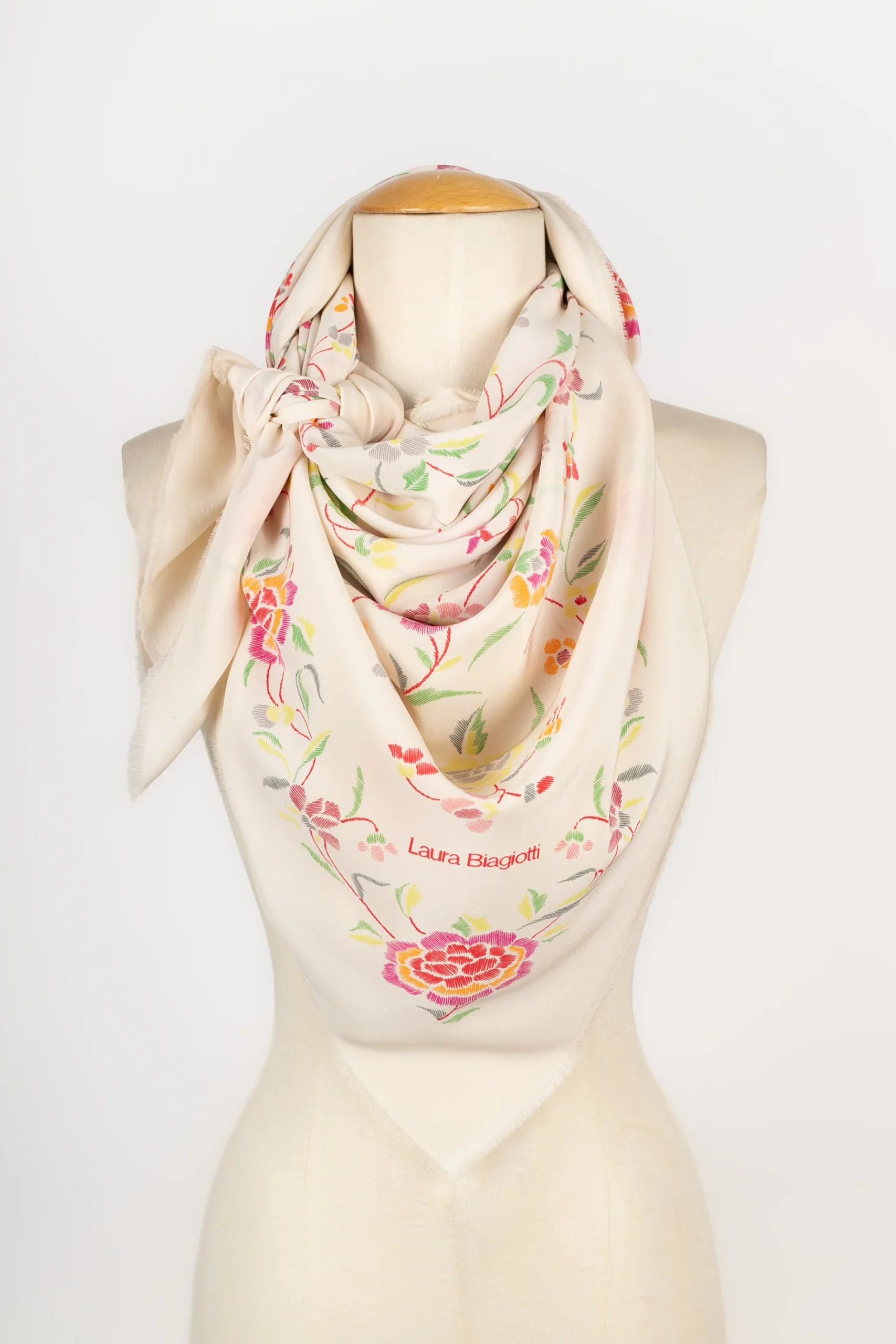 LAURA BIAGIOTTI -Grande étole en soie beige imprimée de fleurs multicolores signée Laura Biagiotti. Condition : Très bon état Dimensions : 140 cm x 140 cm