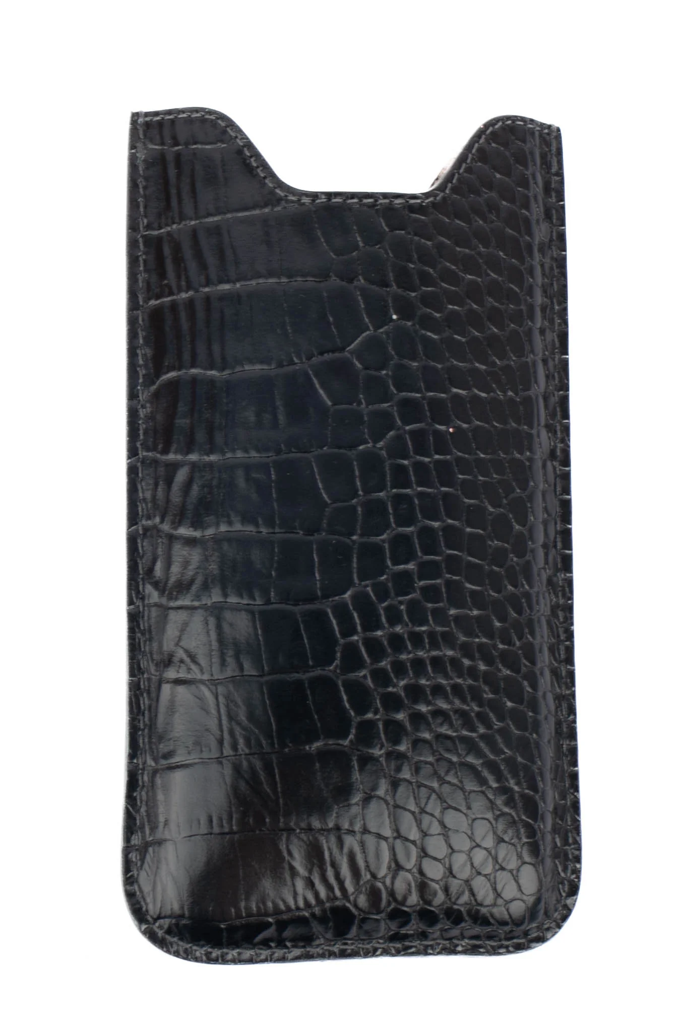 MONT BLANC – (Made in Italy) Étui/pochette pour téléphone en cuir de veau effet crocodile noir. Logo de la maison en métal doré. Condition : Très bon état Dimensions : Hauteur : de 11,5 cm à 13 cm – Largeur : 8,7 cm