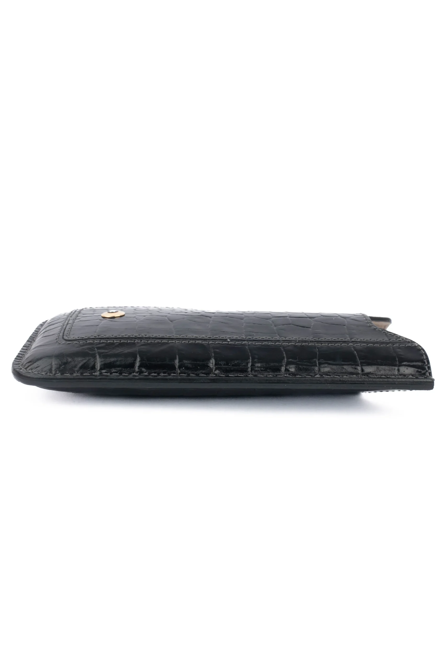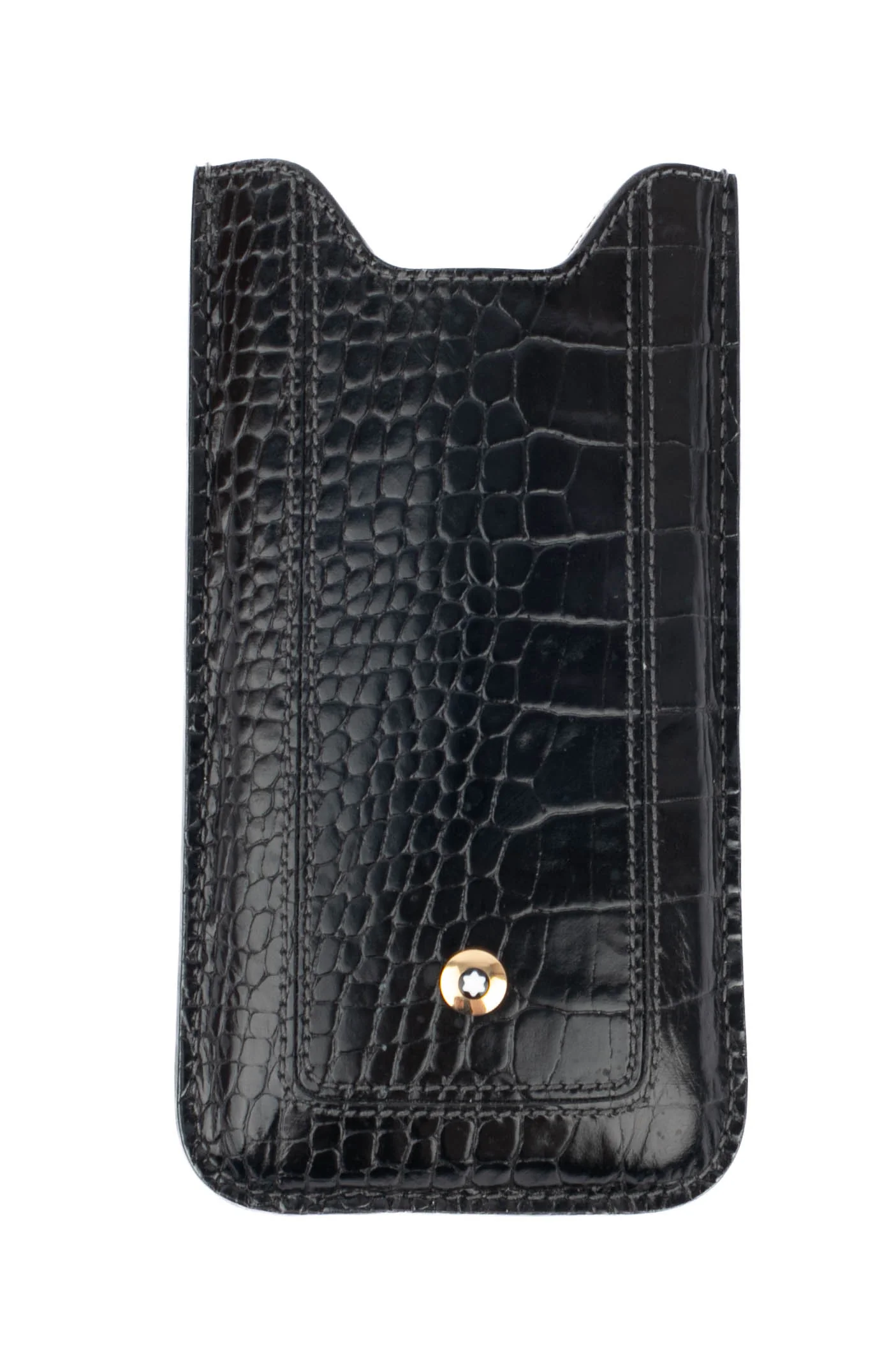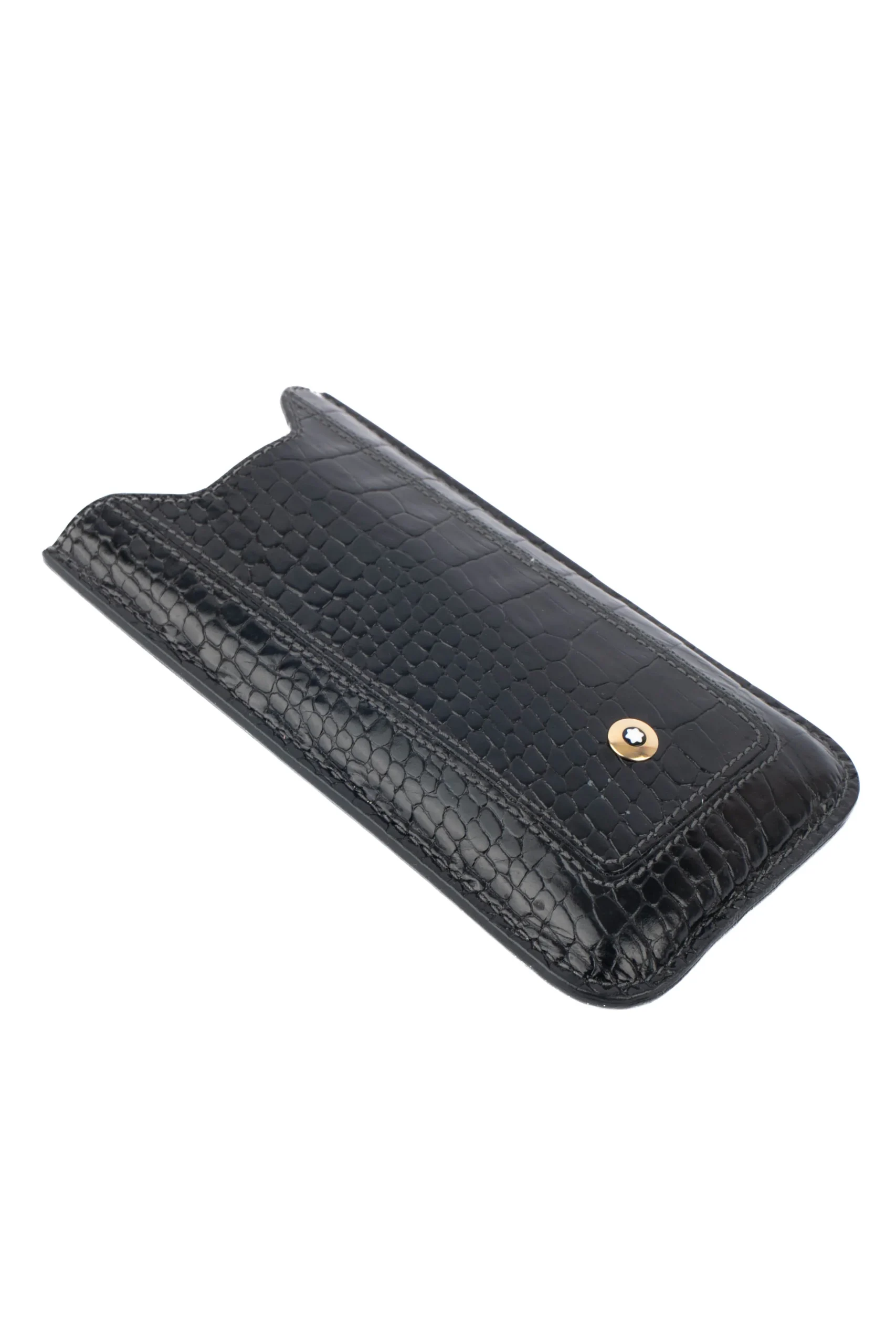 MONT BLANC – (Made in Italy) Étui/pochette pour téléphone en cuir de veau effet crocodile noir. Logo de la maison en métal doré.