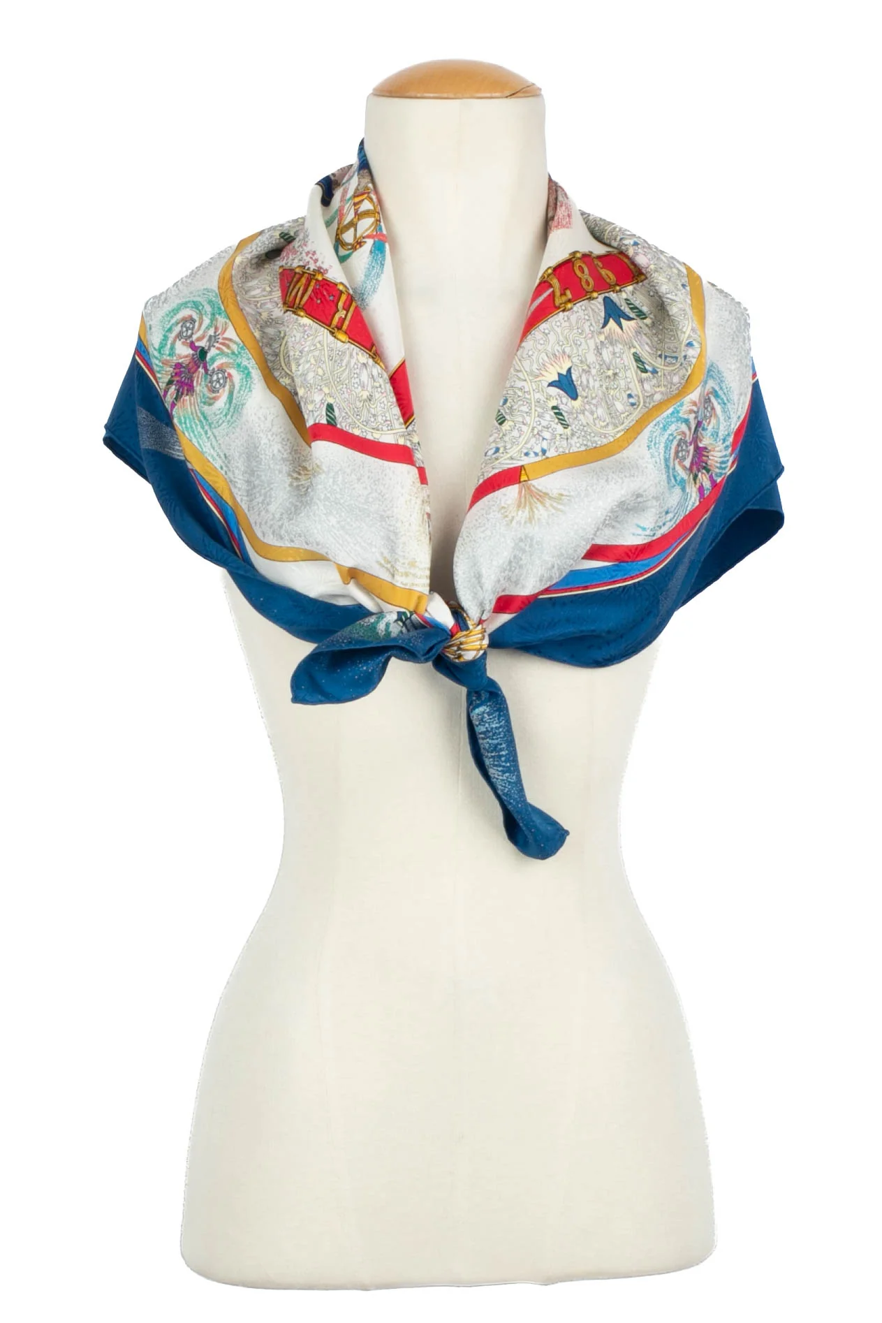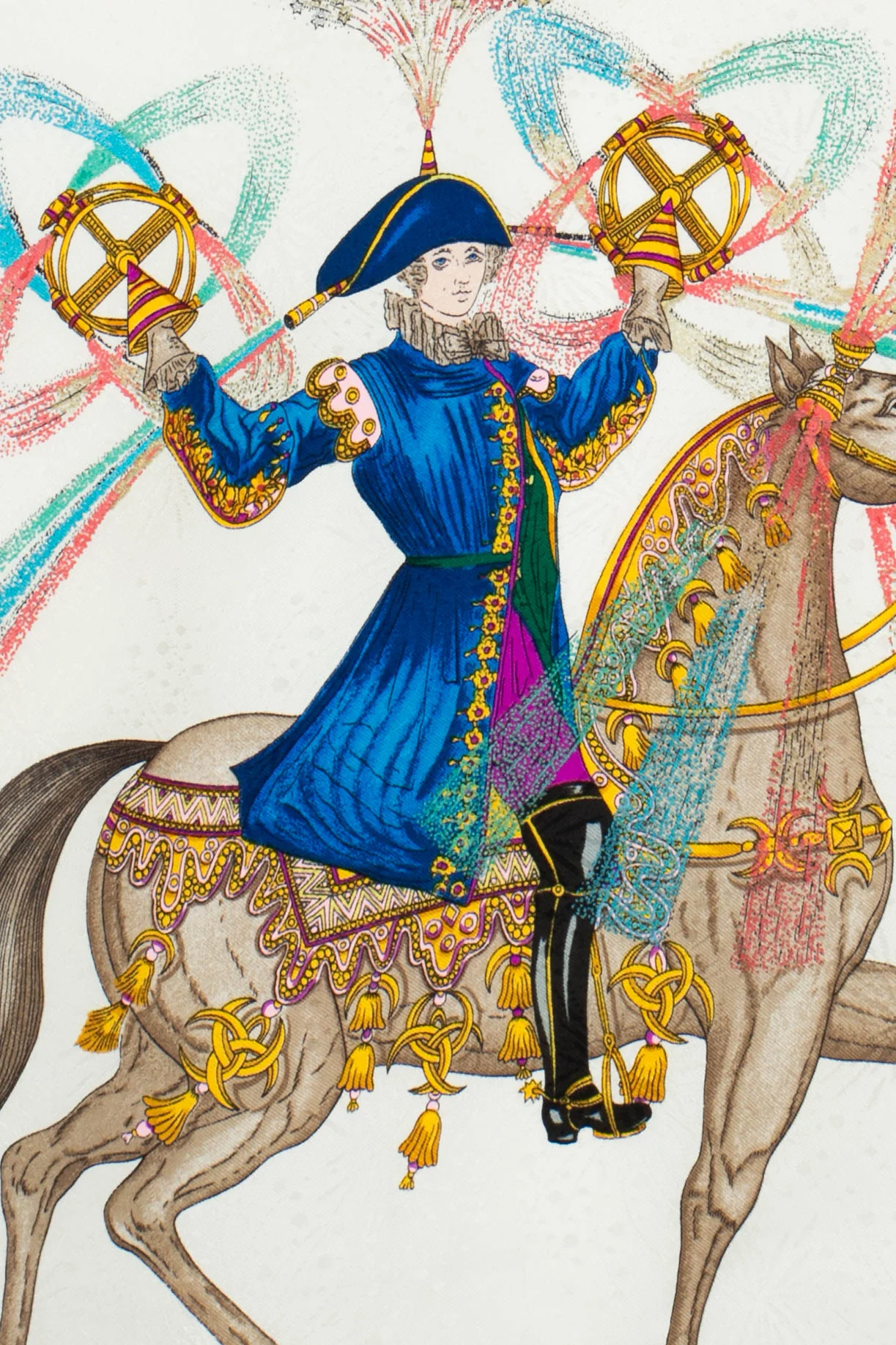 HERMÈS – (Made in France) Foulard en soie brochée roulotté à la main « Feux d’artifice » dessiné par Michel Duchêne. Edité en 1987, réédité en 1993. Carré spécial édité pour commémorer les 150 ans de la maison Hermès. Il est en soie brochée, ce qui est rare chez Hermès et ajoute de la valeur au carré.