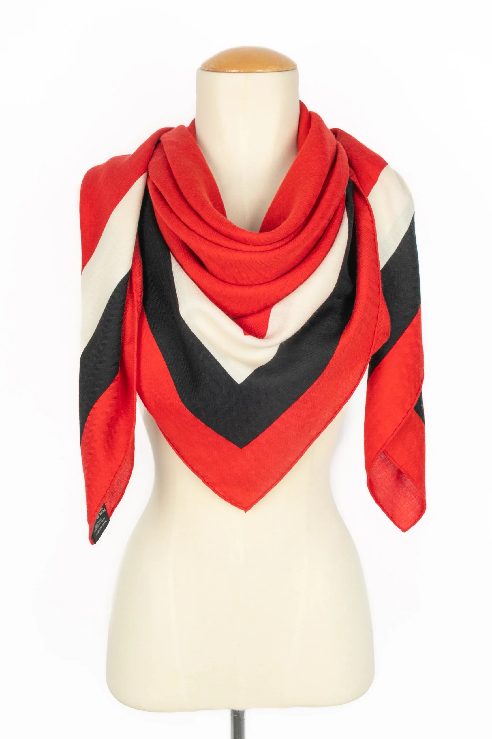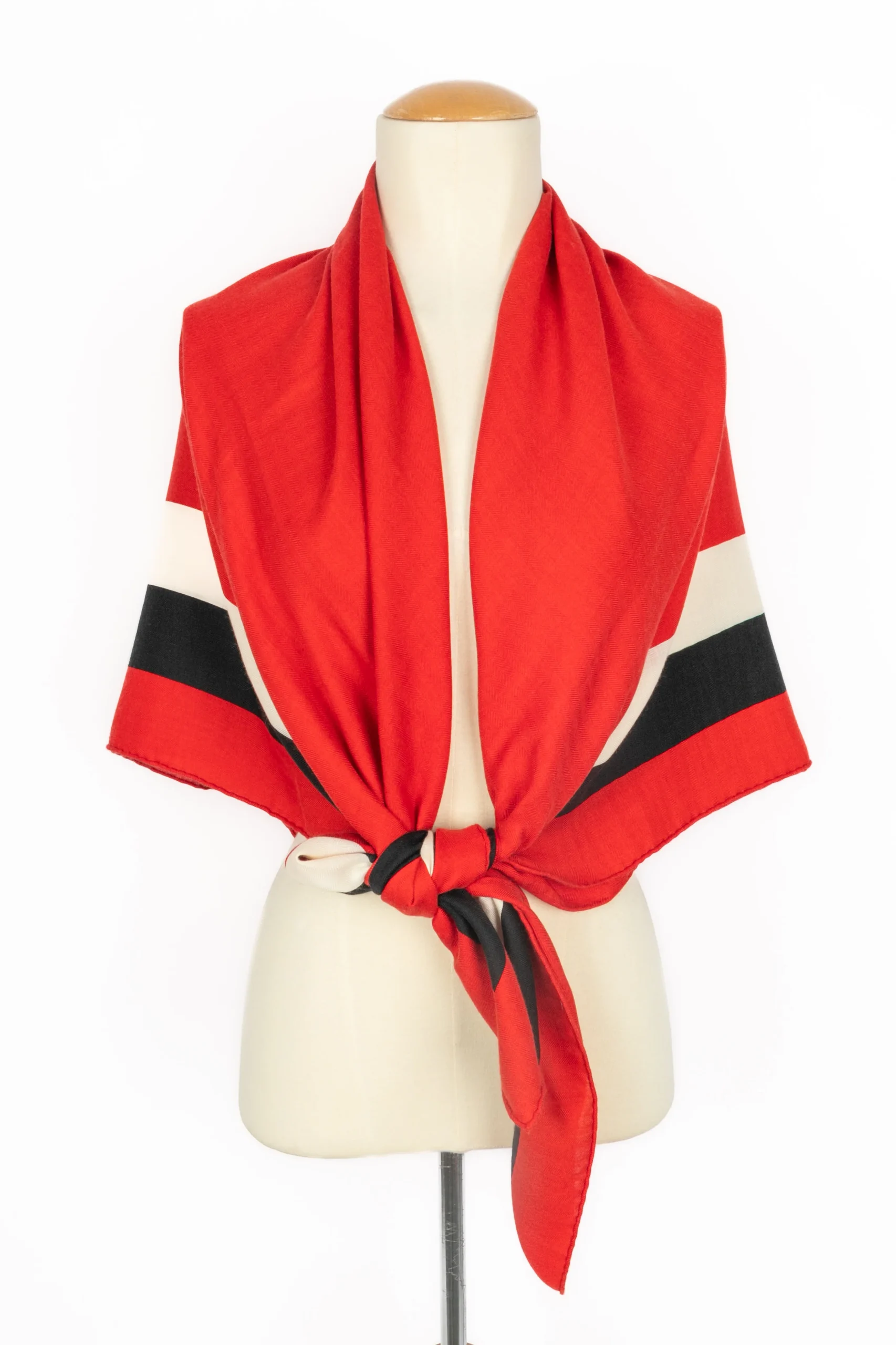 HERMÈS -(Made in France) Foulard en cachemire et soie intitulé “Encadré Équestre” dans les tons de rouge, de blanc et de noir. Condition : Très bon état Dimensions : 140 cm x 140 cm