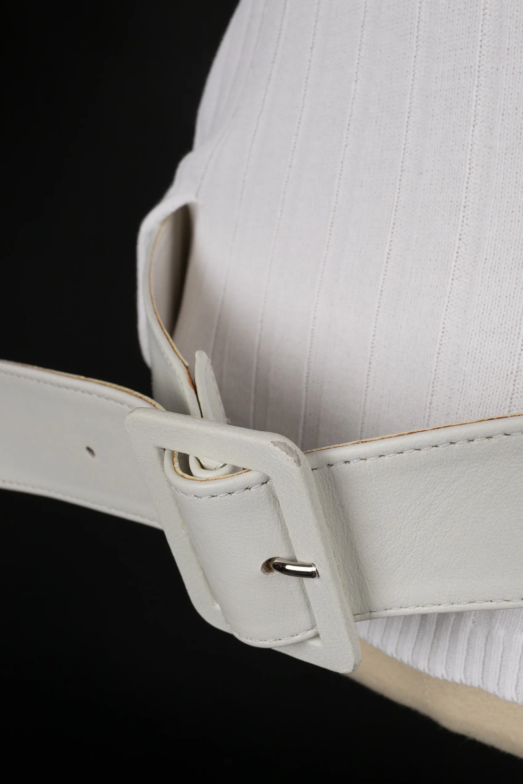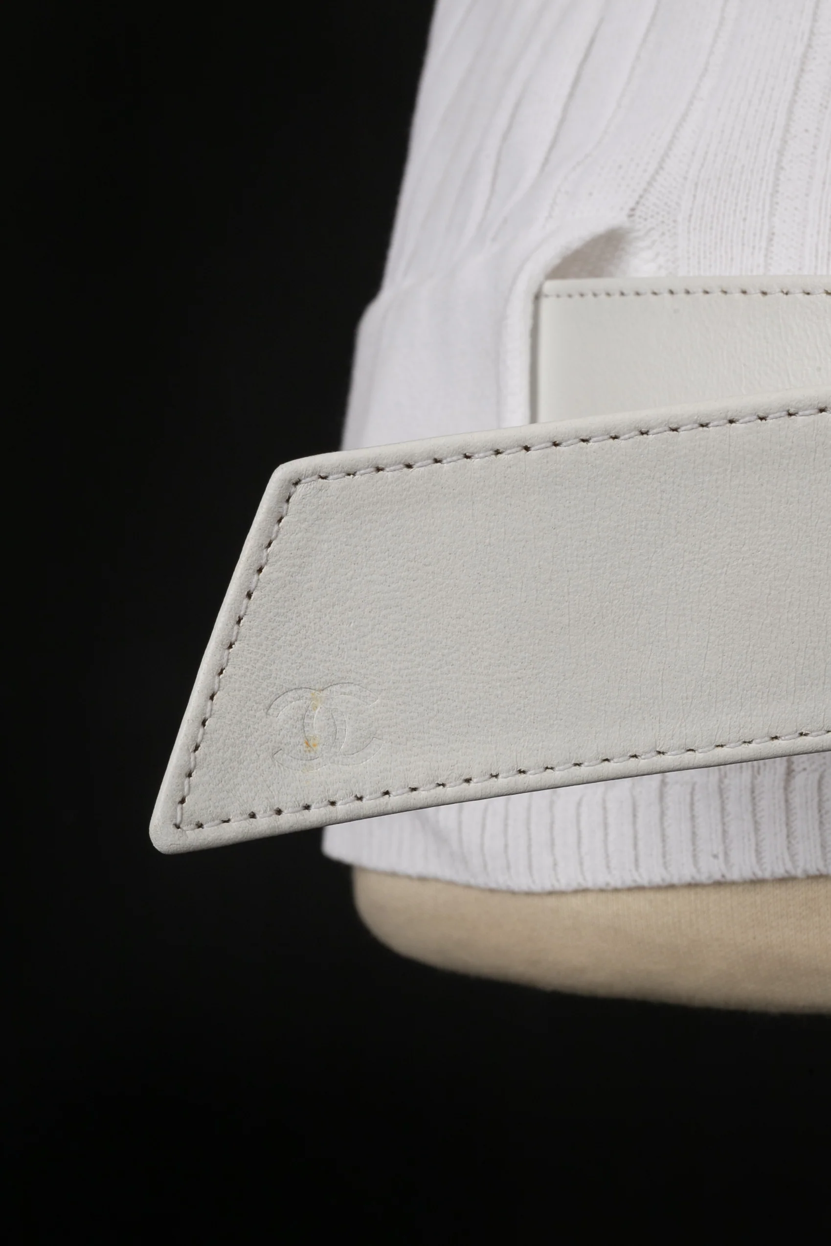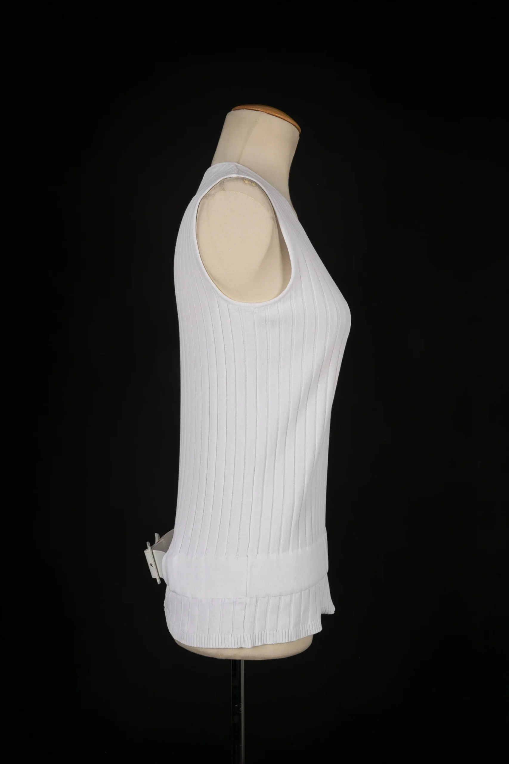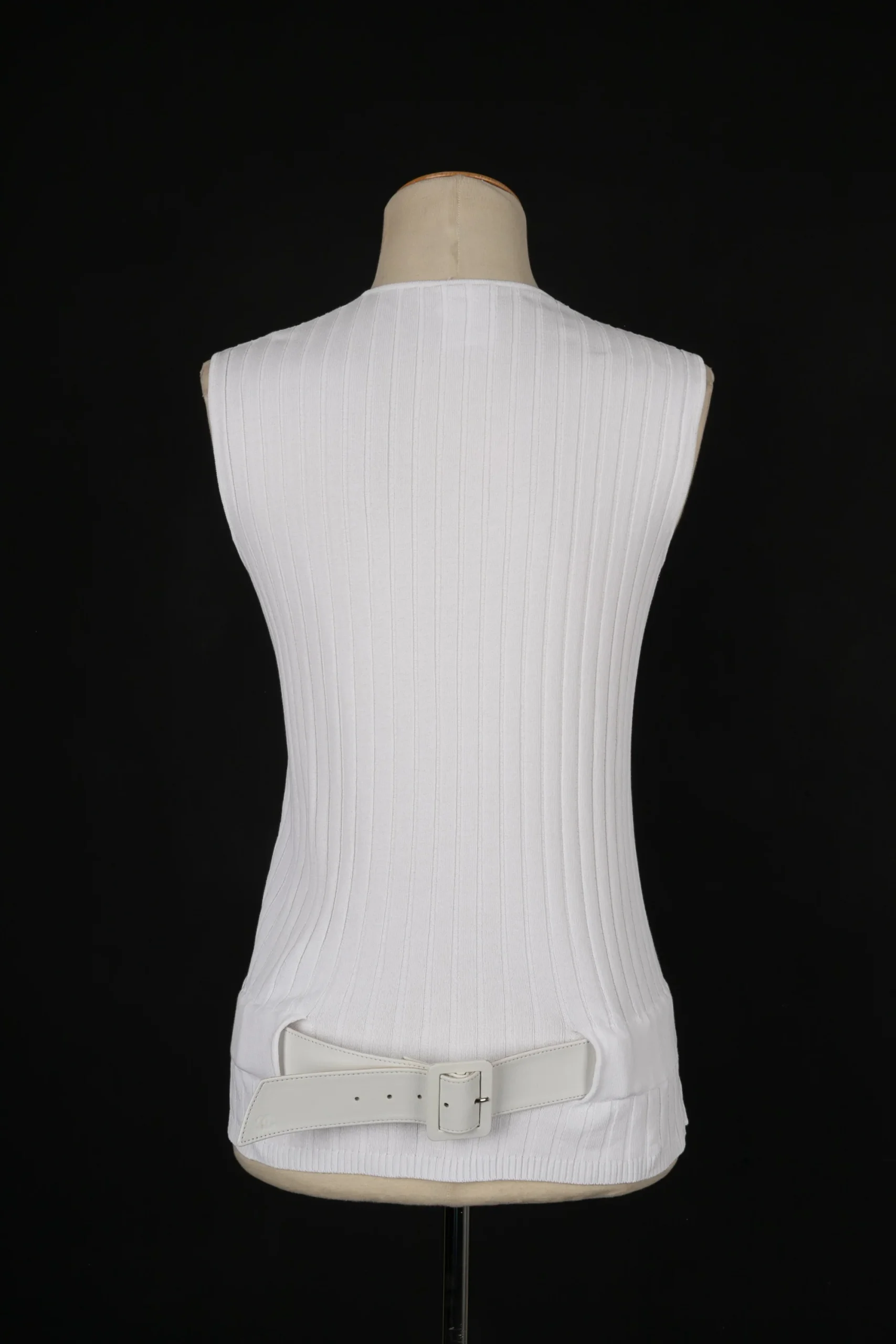 CHANEL -(Made in France) Haut en coton blanc dont les hanches sont marquées par une ceinture en cuir. Taille 44FR. Collection Printemps-Eté 2002 sous la direction de Karl Lagerfeld.