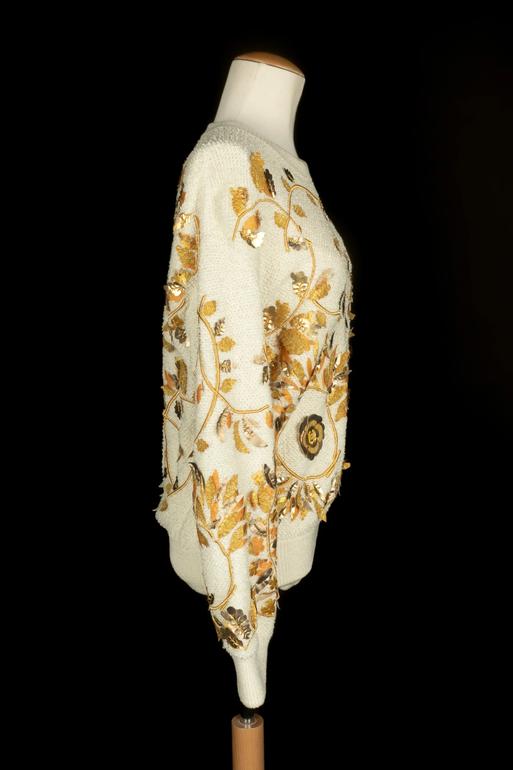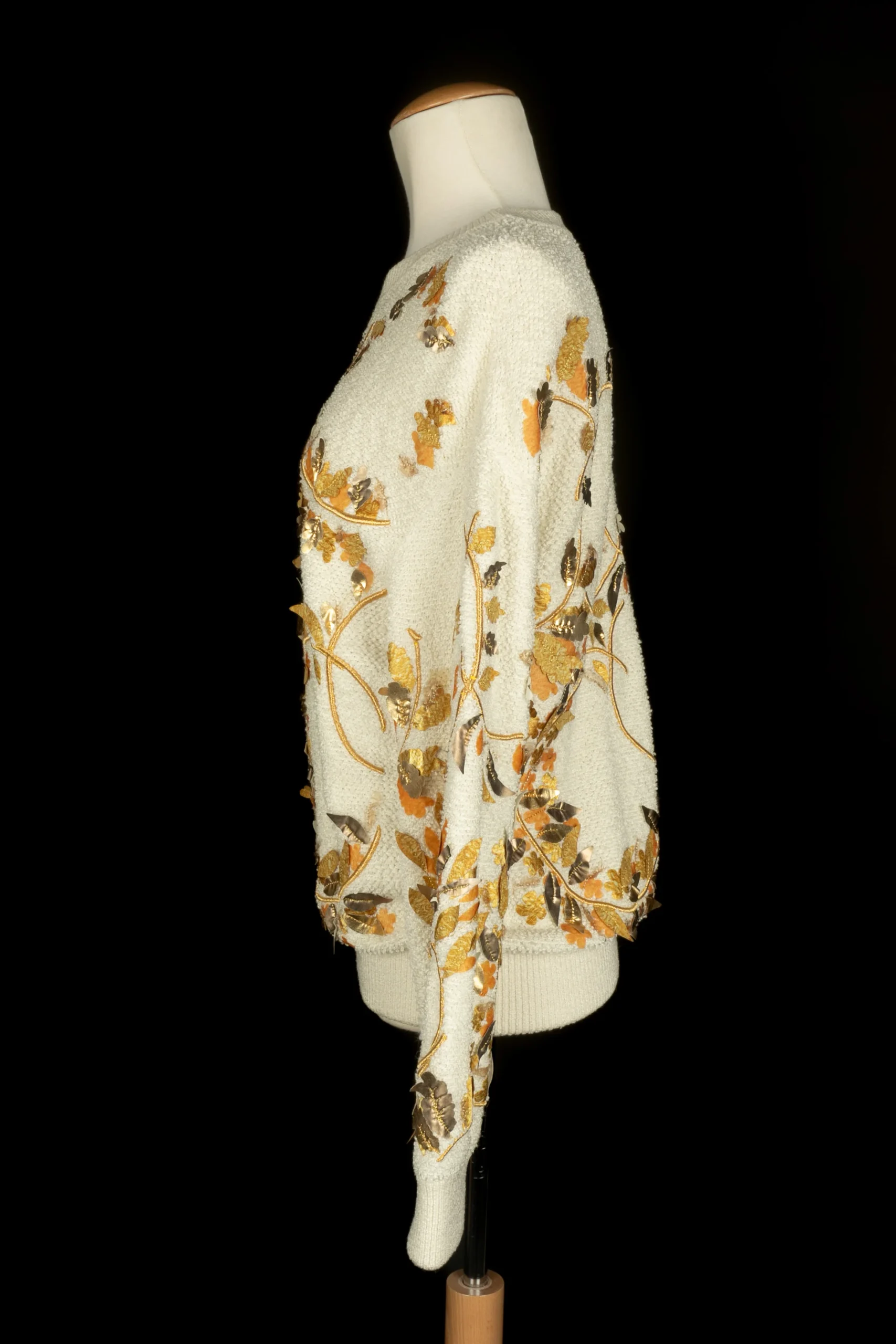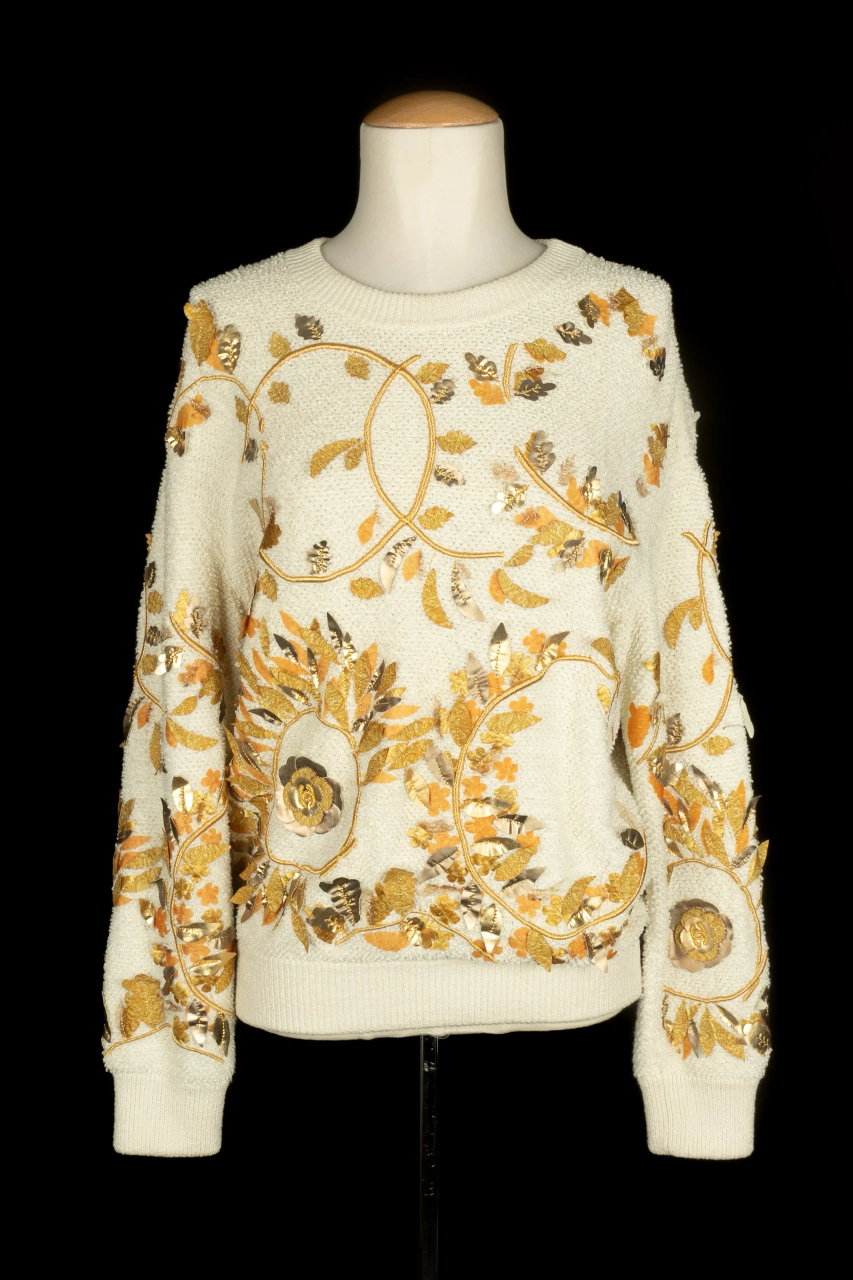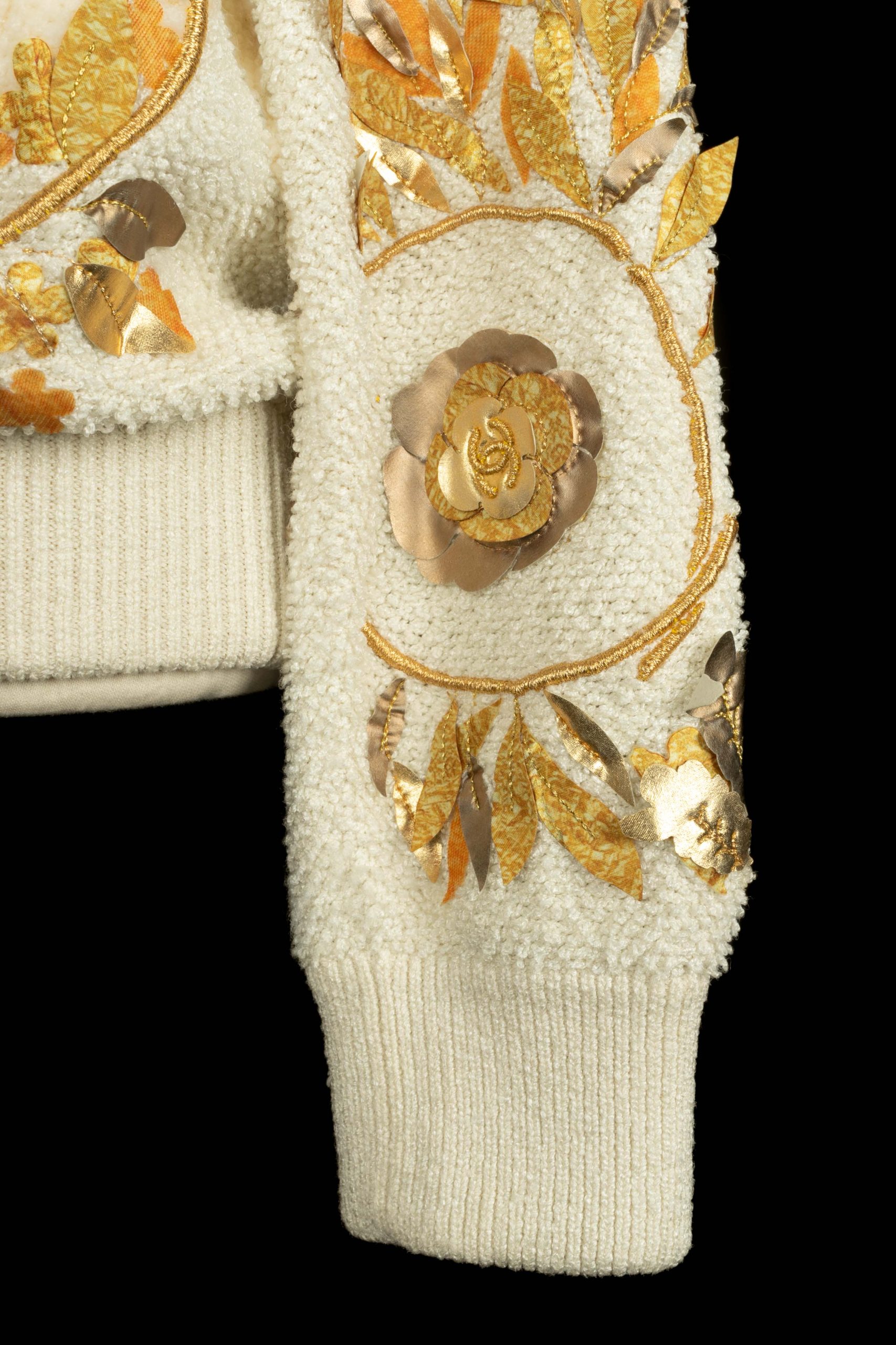 CHANEL – (Made in Italy) Haut pull blanc cassé, brodé de fil lurex doré et de feuille en tissu et cuir dans les tons de doré, de jaune et de orange. Taille indiquée 38FR. Collection Resort 2018, sous la direction artistique de Karl Lagerfeld.