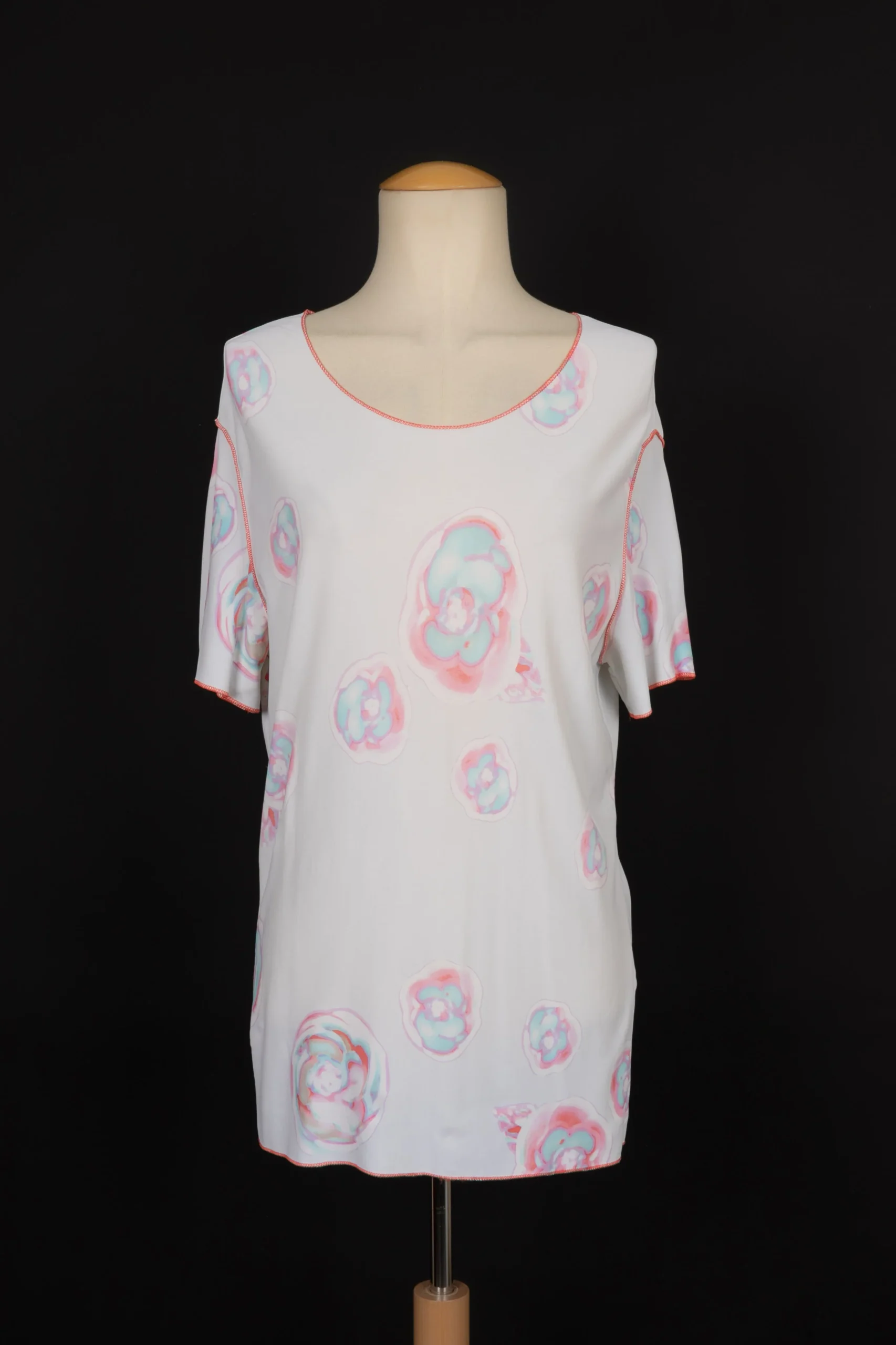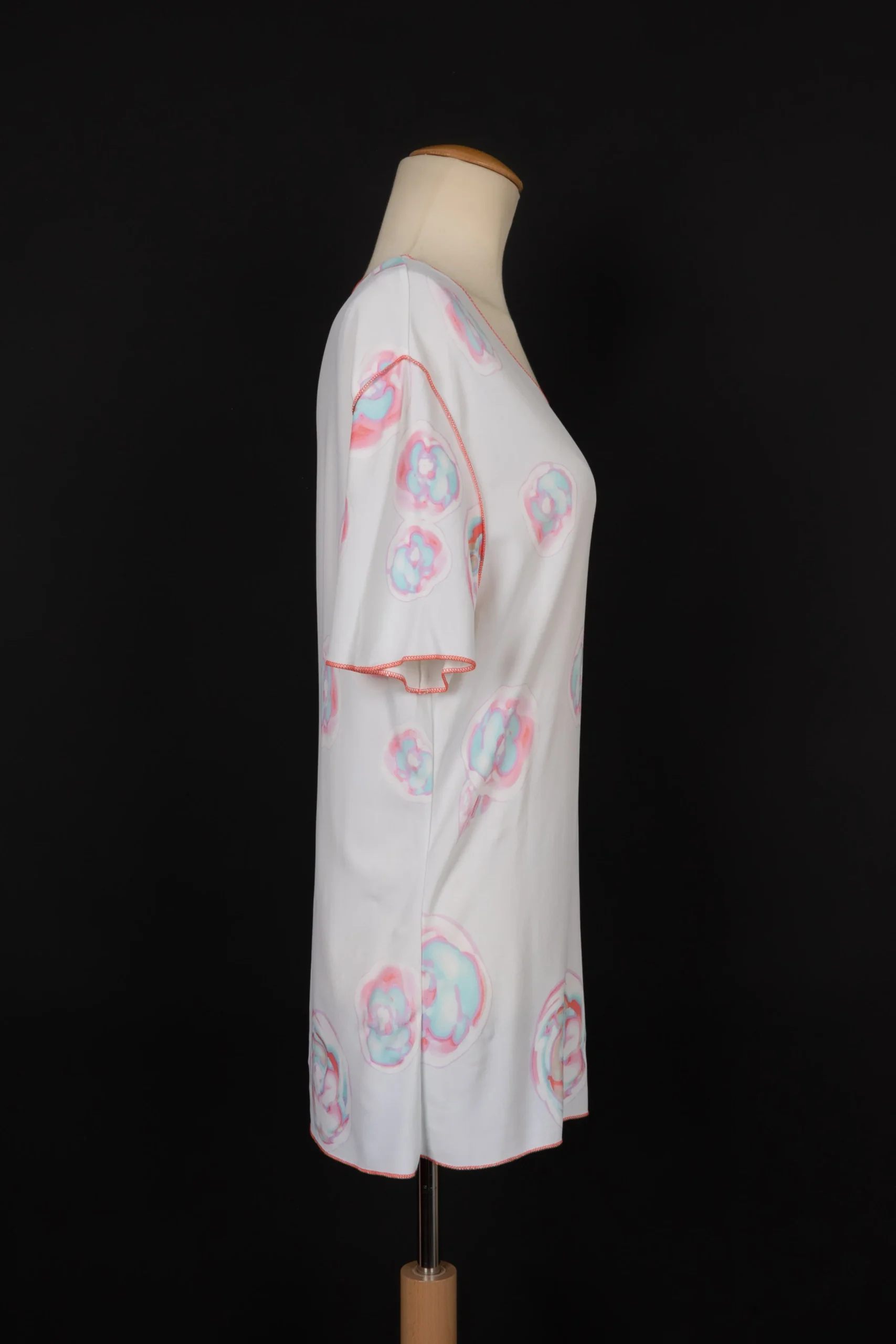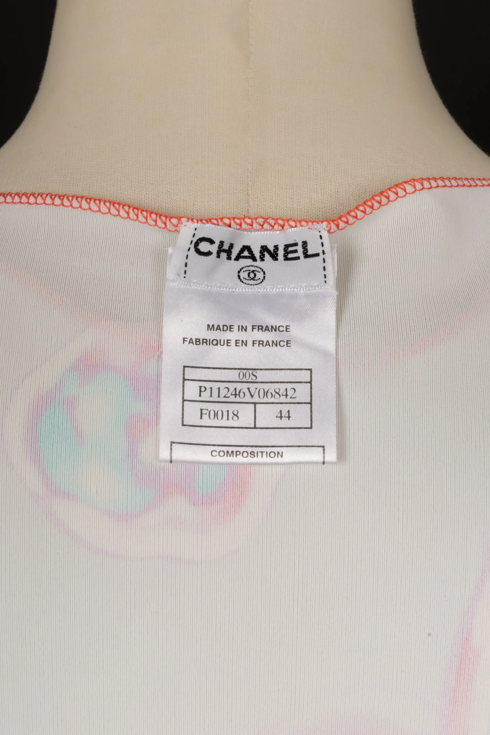 CHANEL -(Made in France) T-shirt en polyamide dans les tons pastels. Collection Summer 2000. Taille 44FR. Condition : Très bon état Dimensions : Largeur d’épaules : 48 cm – Poitrine : 47 cm – Longueur des manches : 22 cm – Longueur : 72 cm