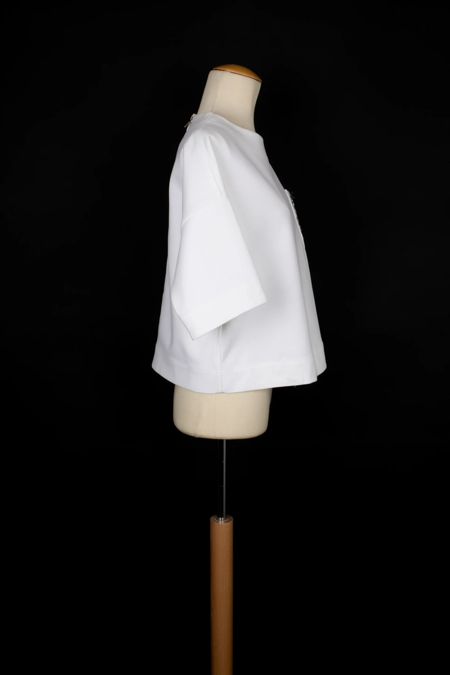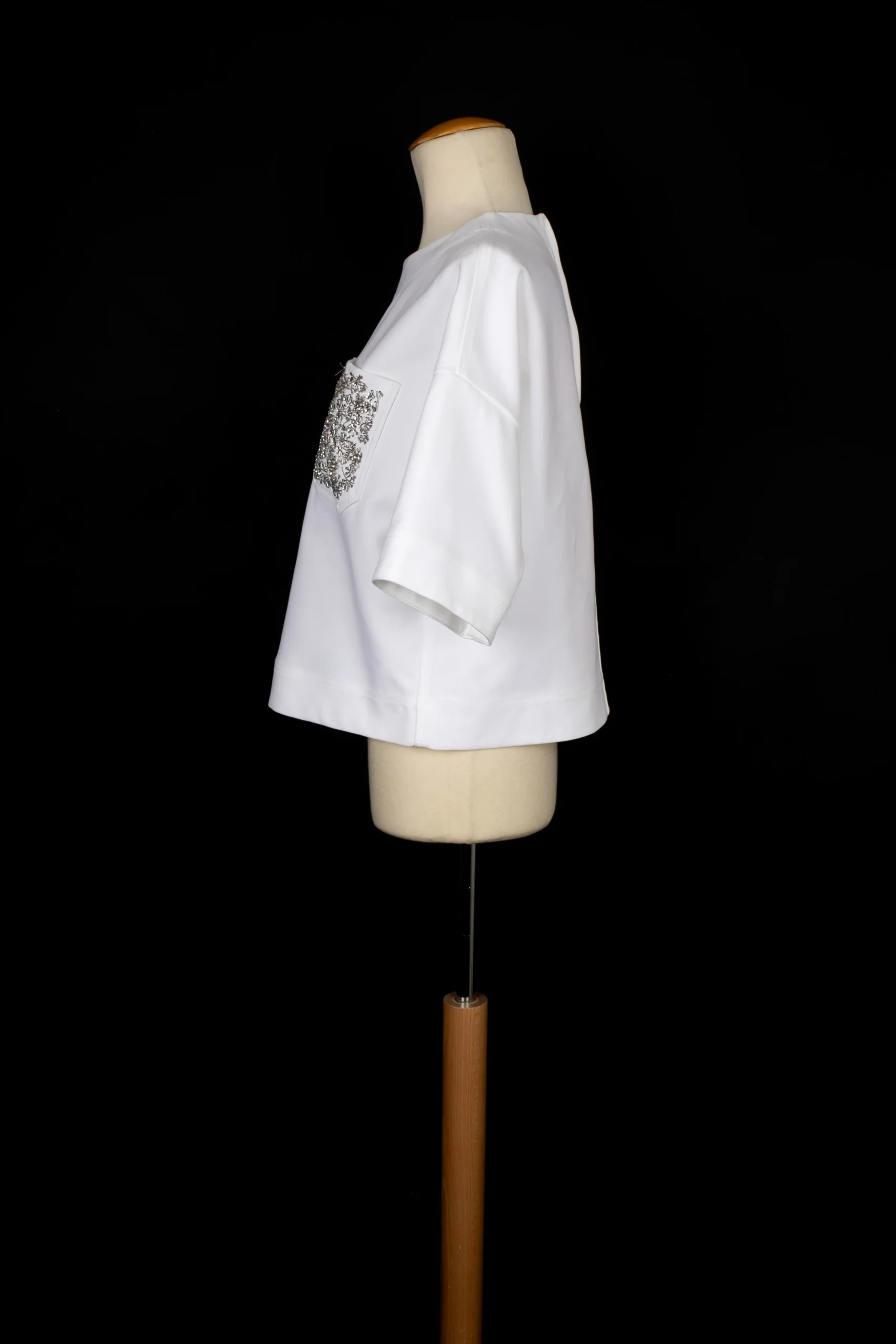 DIOR -(Made in Italy) Top en coton blanc brodé de perles et strass argentés. Taille indiquée 38FR. Condition : Bon état Dimensions : Largeur d’épaules : 61 cm – Poitrine : 56 cm – Longueur des manches : 19 cm – Longueur : 52 cm