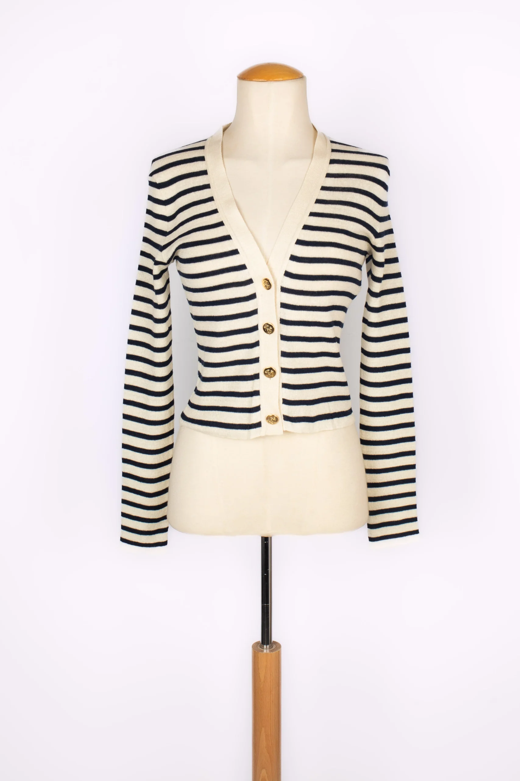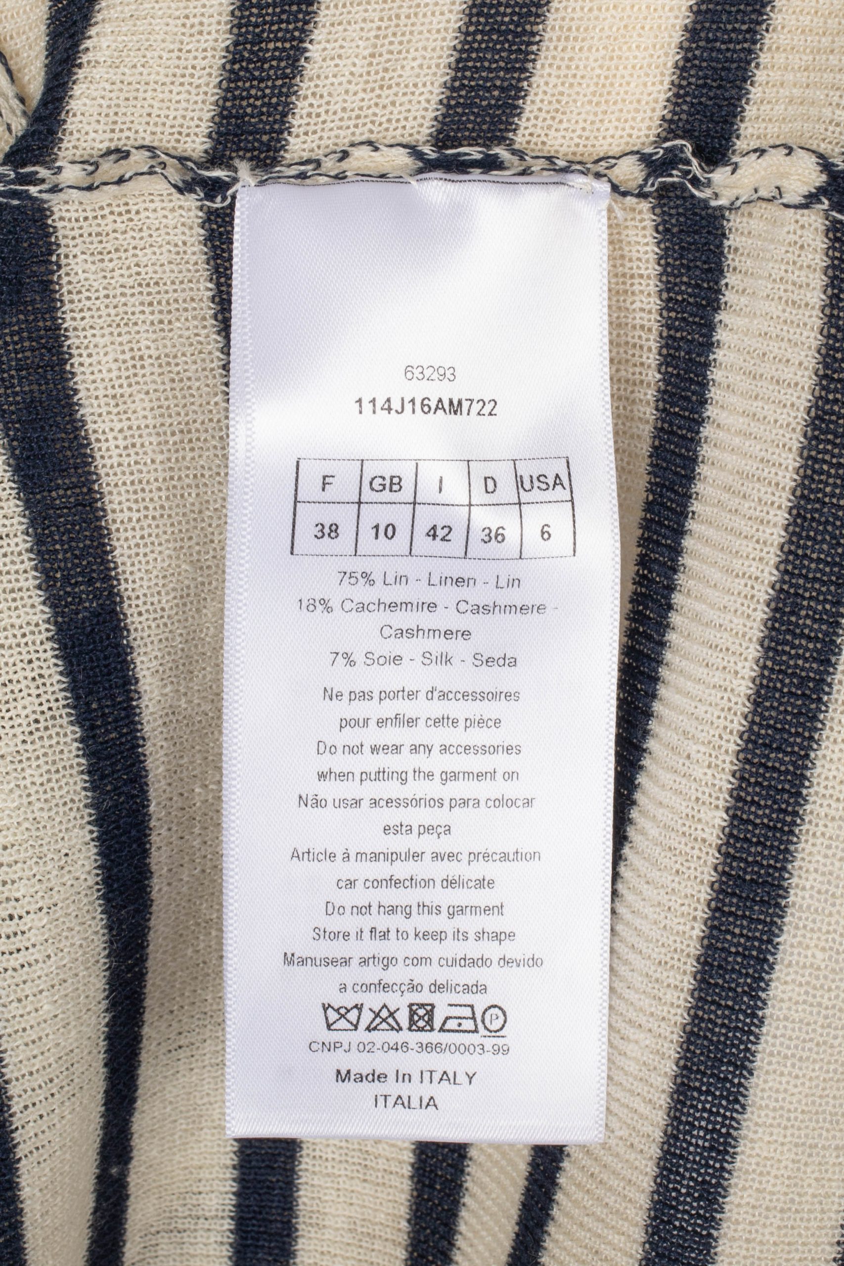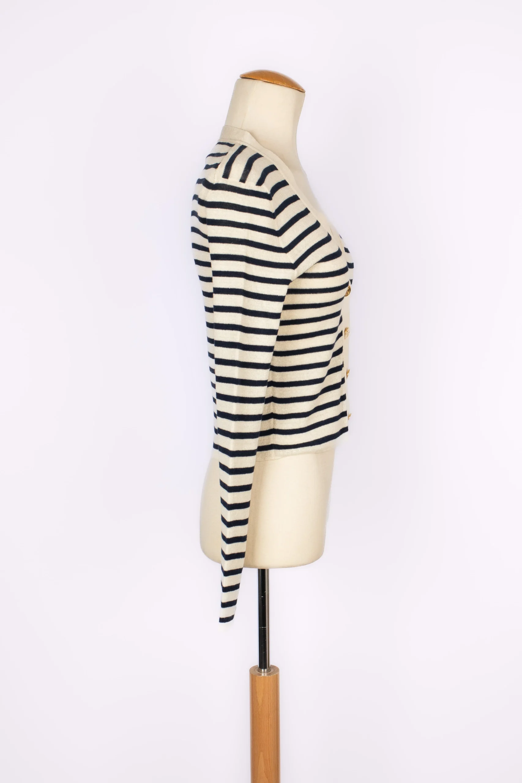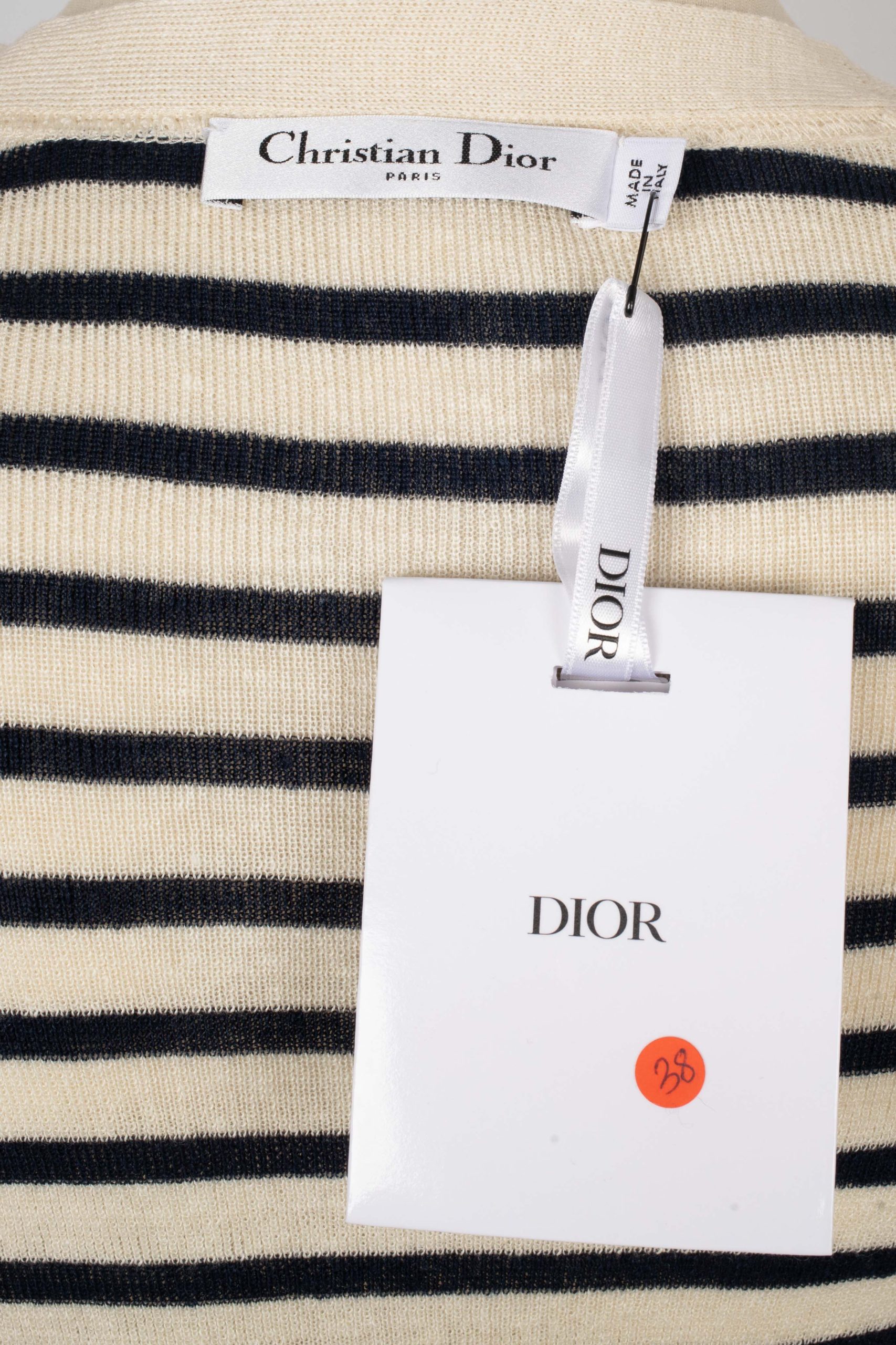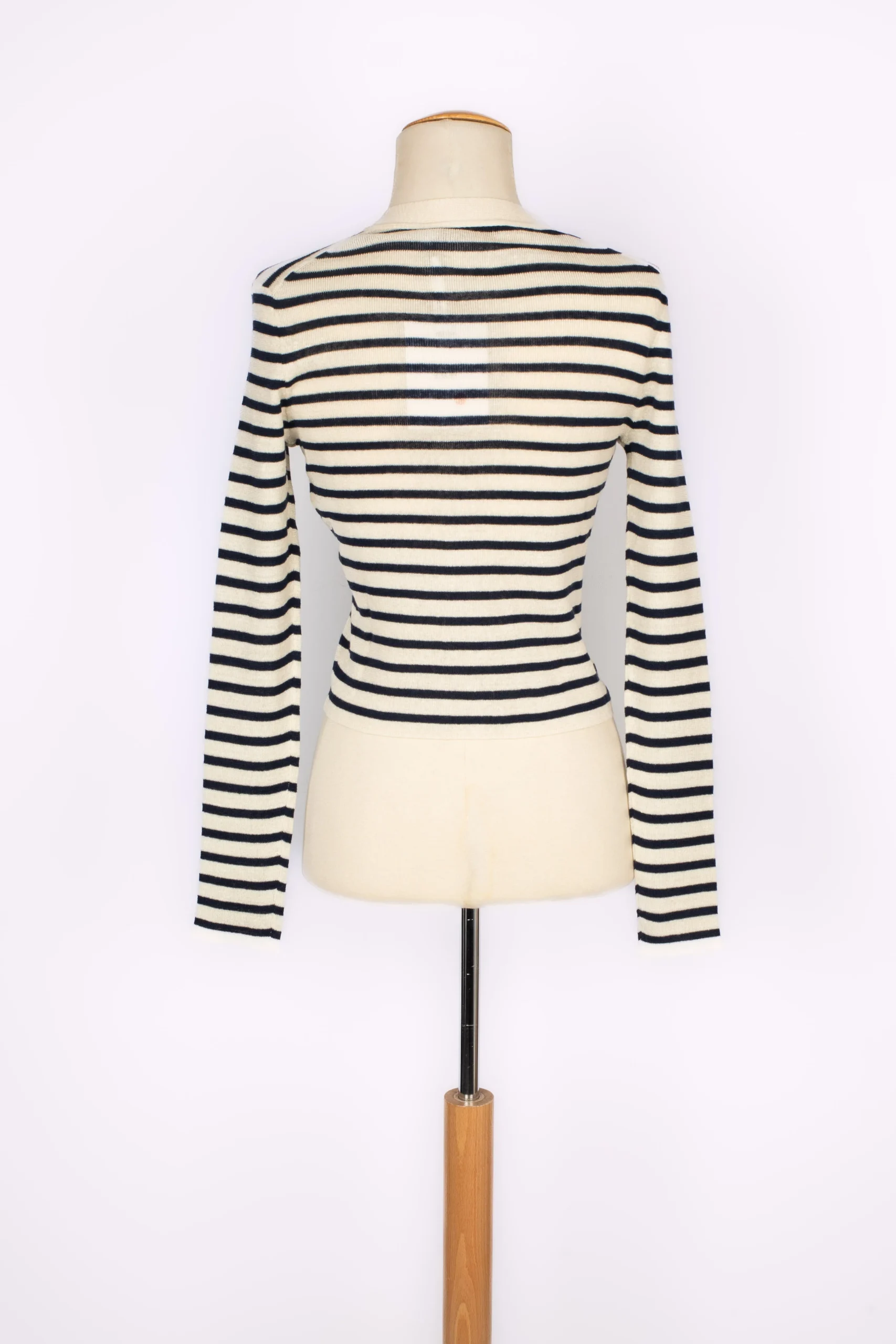 DIOR -(Made in Italy) Cardigan en lin, cachemire et soie à rayures bleu marine et blanc. Taille indiquée 38FR. Condition : Très bon état Dimensions : Largeur d’épaules : 38 cm – Poitrine : 45 cm – Longueur des manches : 60 cm – Longueur : 48 cm