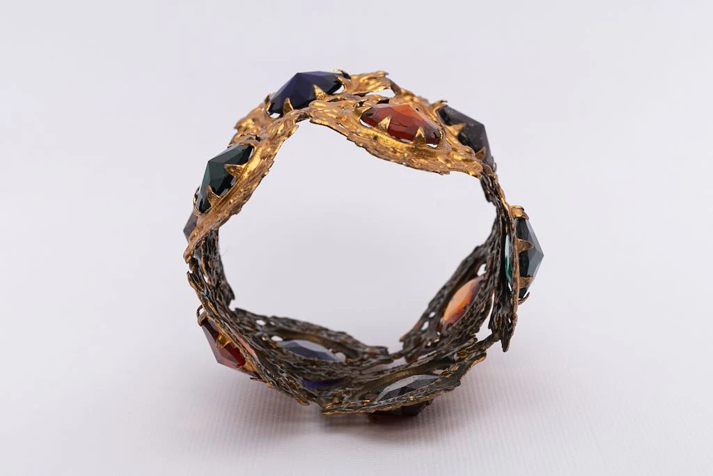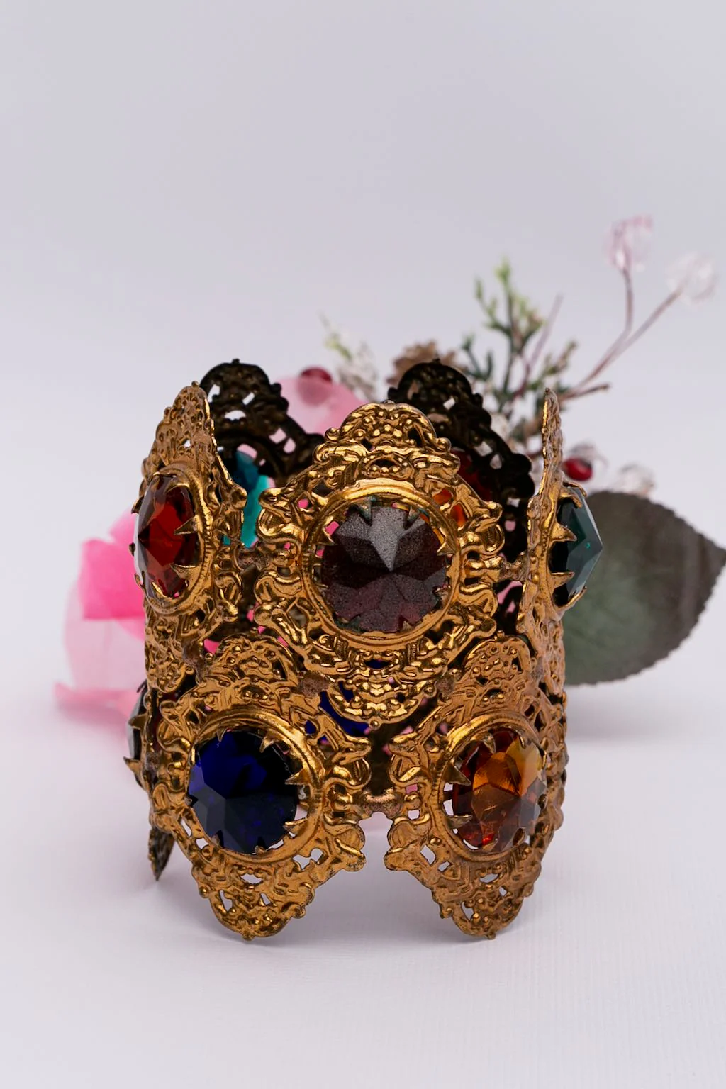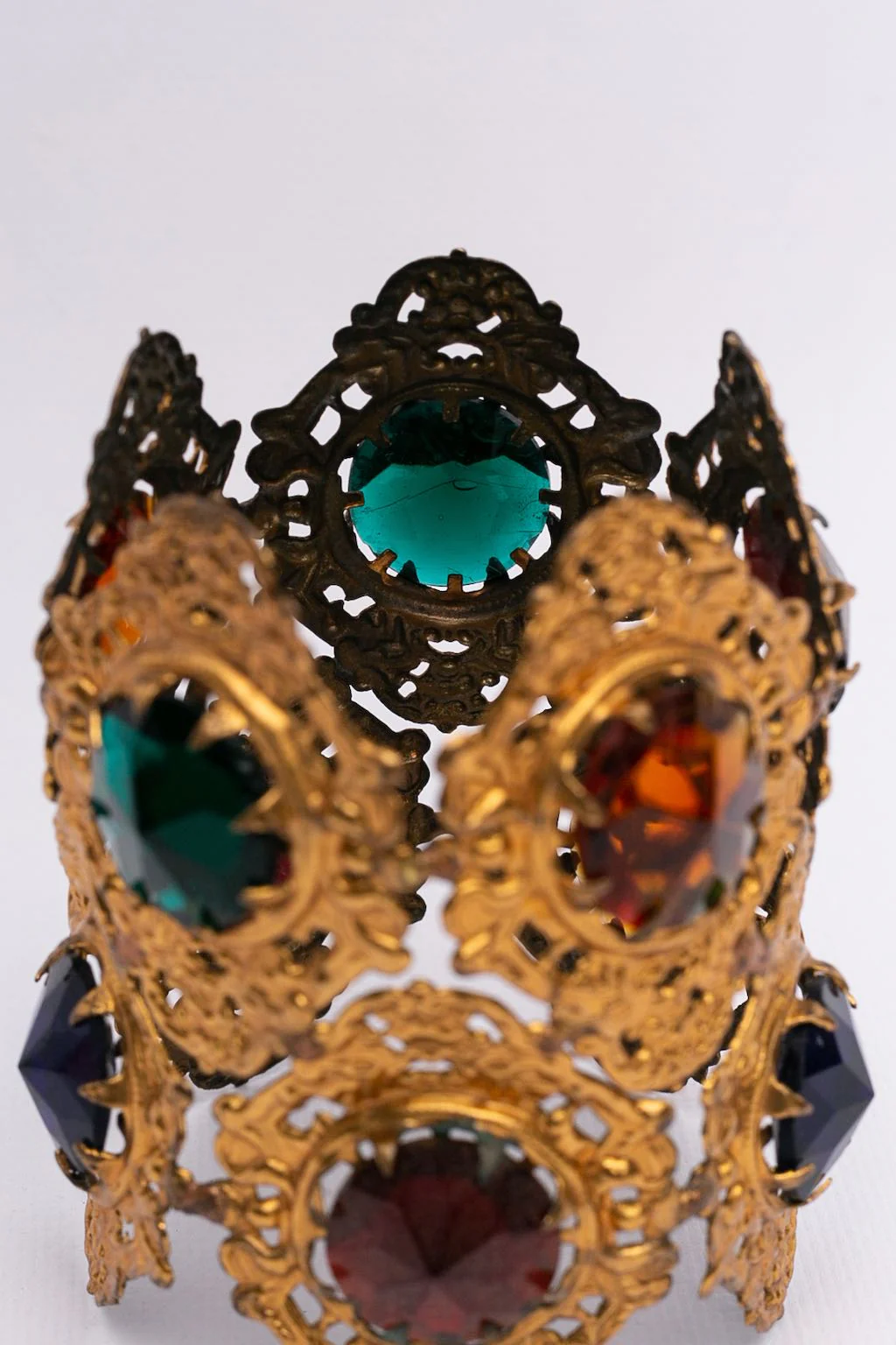 ANONYME – Bracelet manchette en métal doré ajouré et pavé de strass datant des années 20/30’s. Bijou de théâtre, non signé. Etat :Bon état Dimensions :Circonférence : 21,5 cm – Hauteur : 8 cm