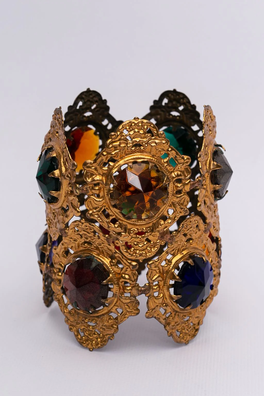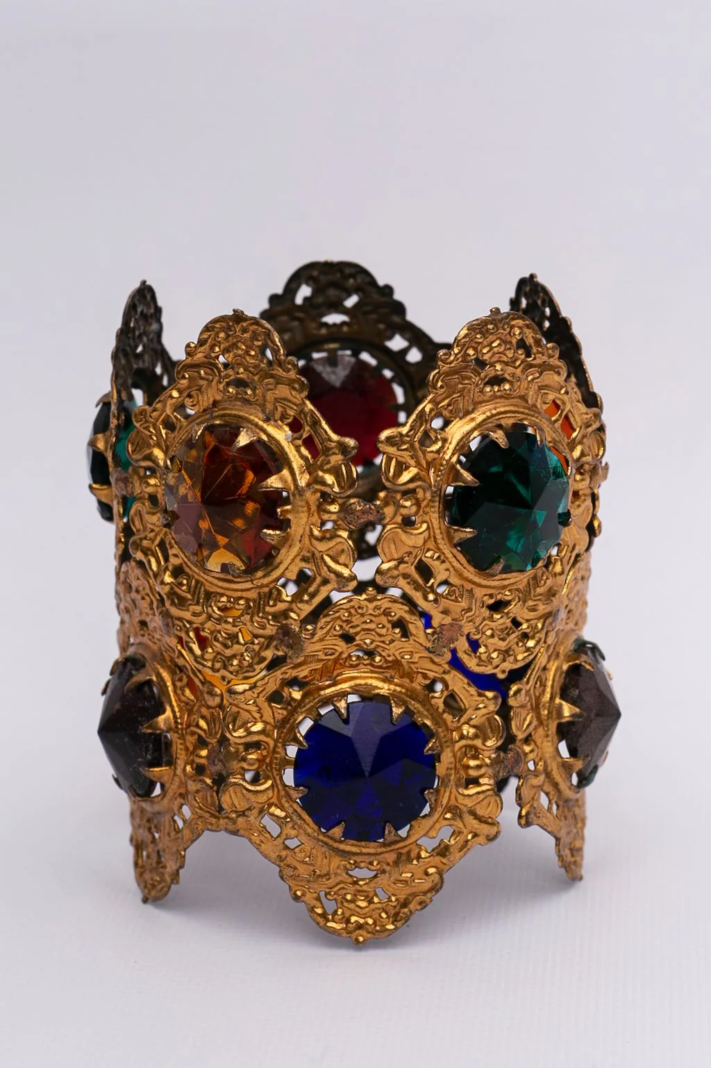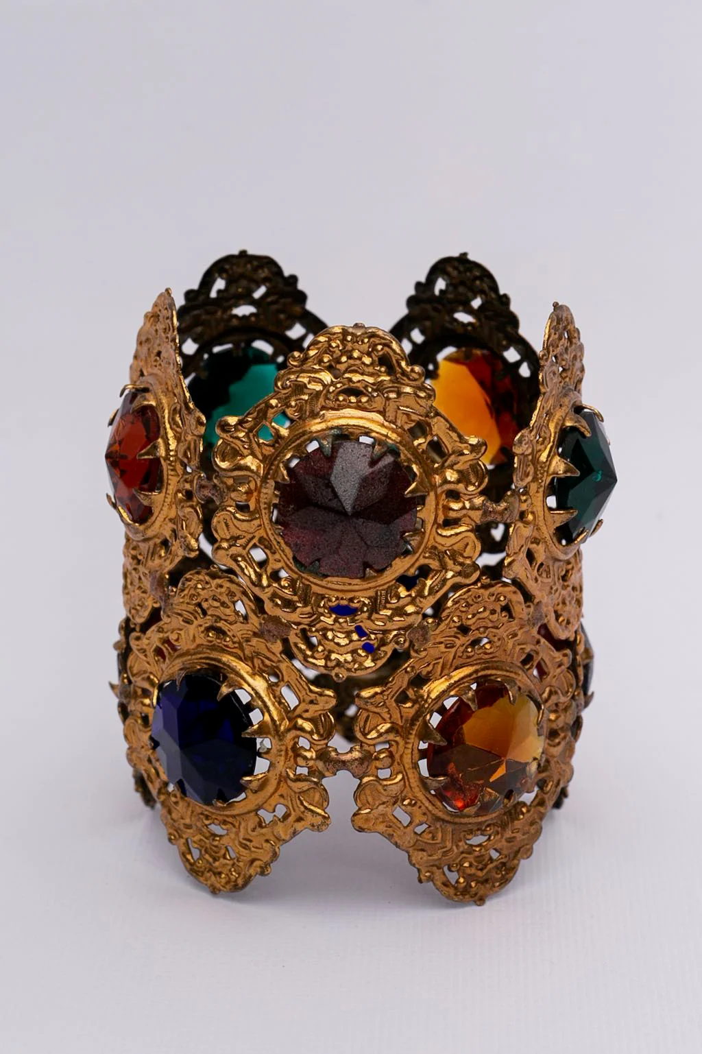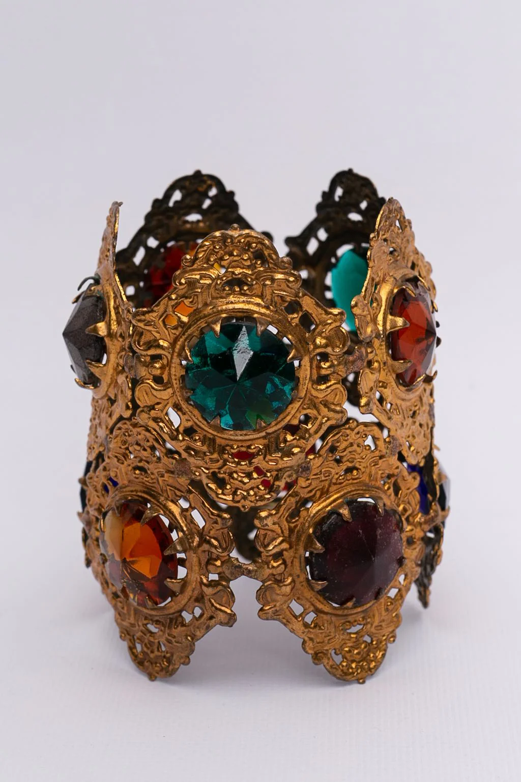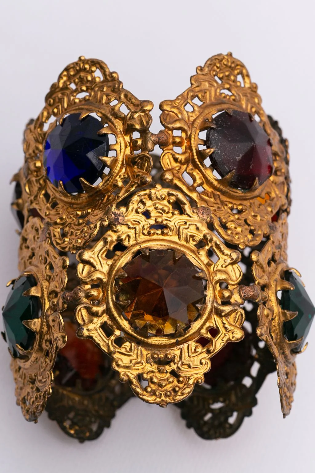 ANONYME – Bracelet manchette en métal doré ajouré et pavé de strass datant des années 20/30’s. Bijou de théâtre, non signé.