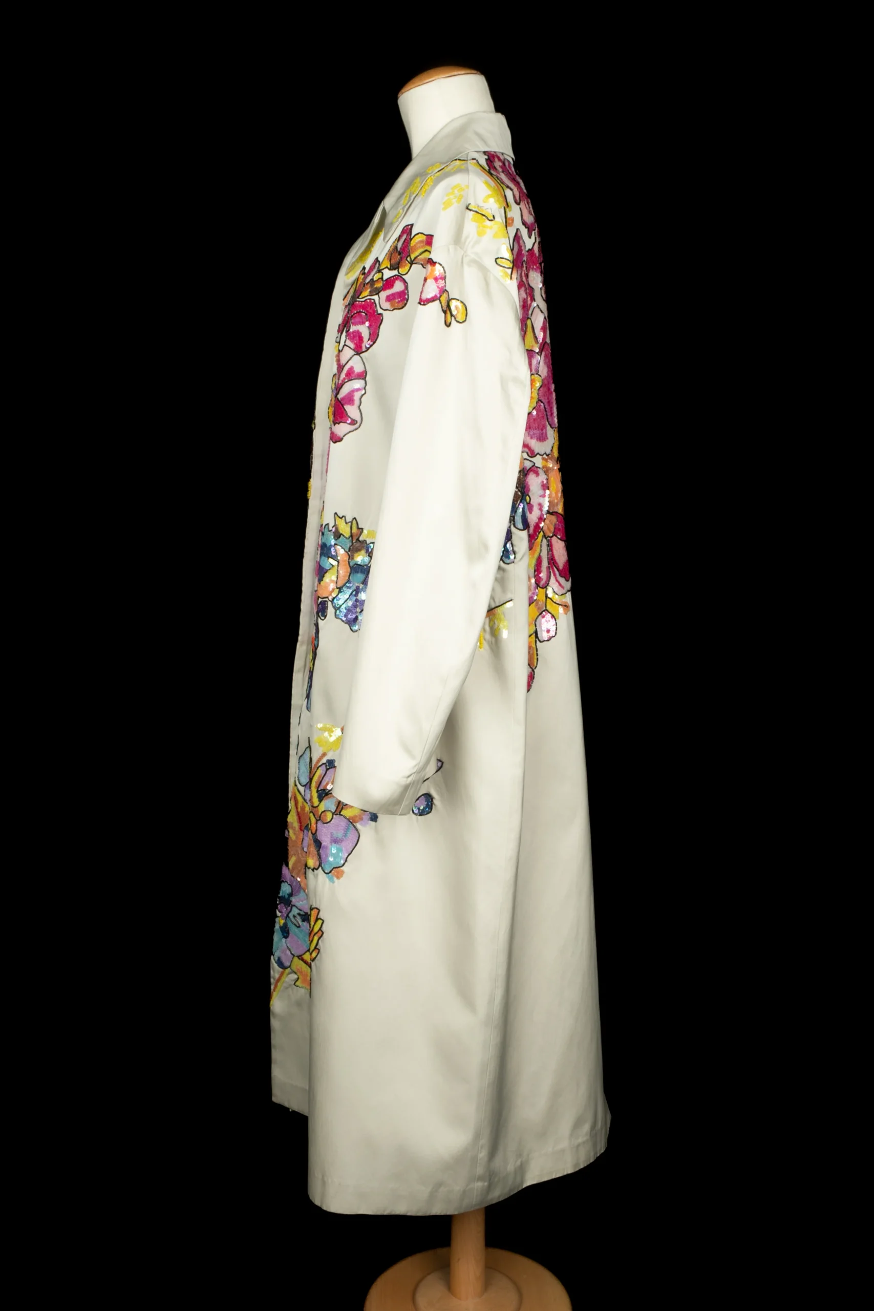 DRIES VAN NOTEN -Manteau en soie mélangée blanc cassé brodée de paillettes et de perles figurant des fleurs. Marqué taille Extra small, il convient à un 40FR. Collection Printemps-Eté 2020. Condition : Très bon état Dimensions : Largeur d’épaules : 45 cm – Longueur des manches : 65 cm – Longueur : 125 cm
