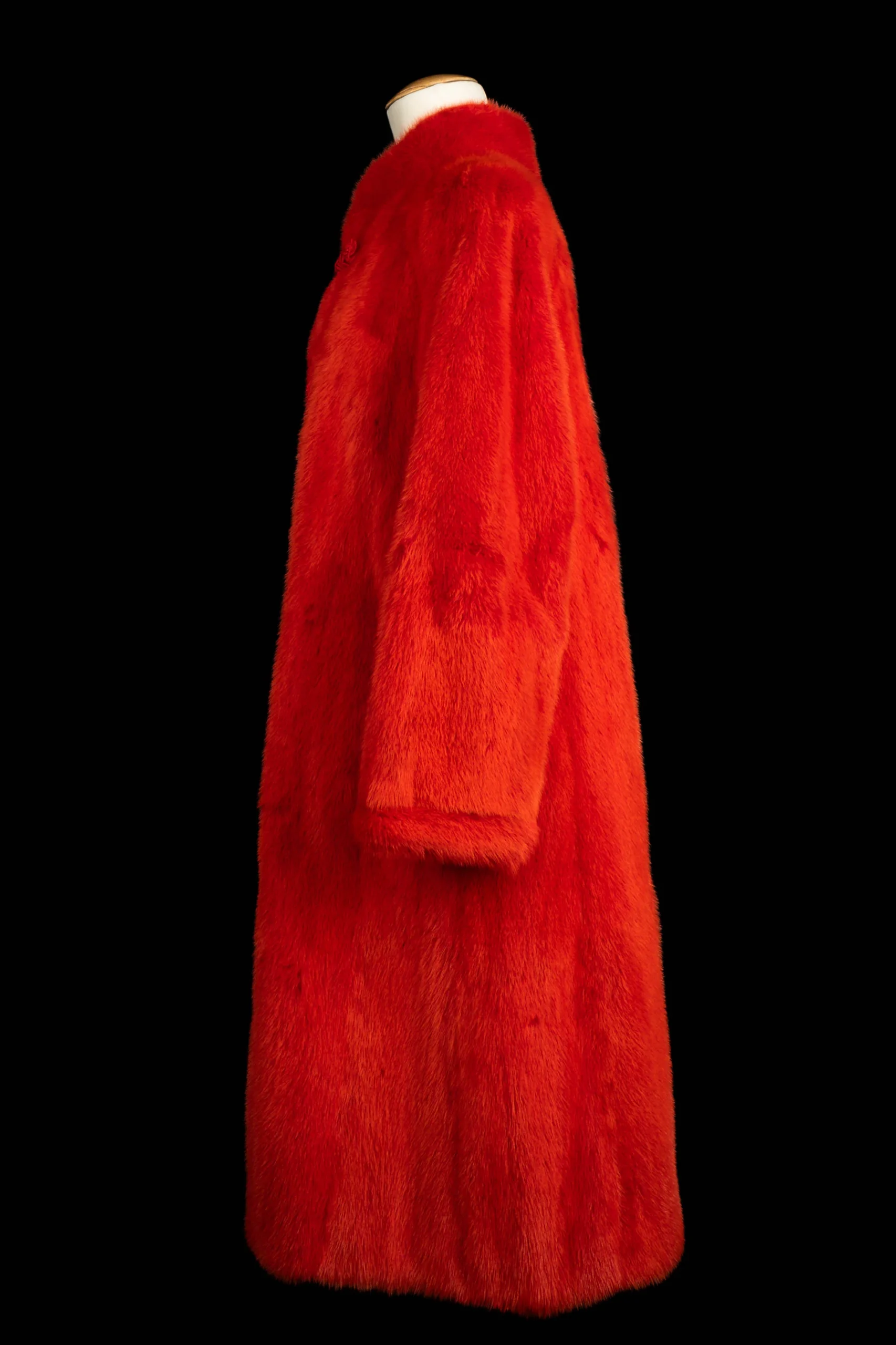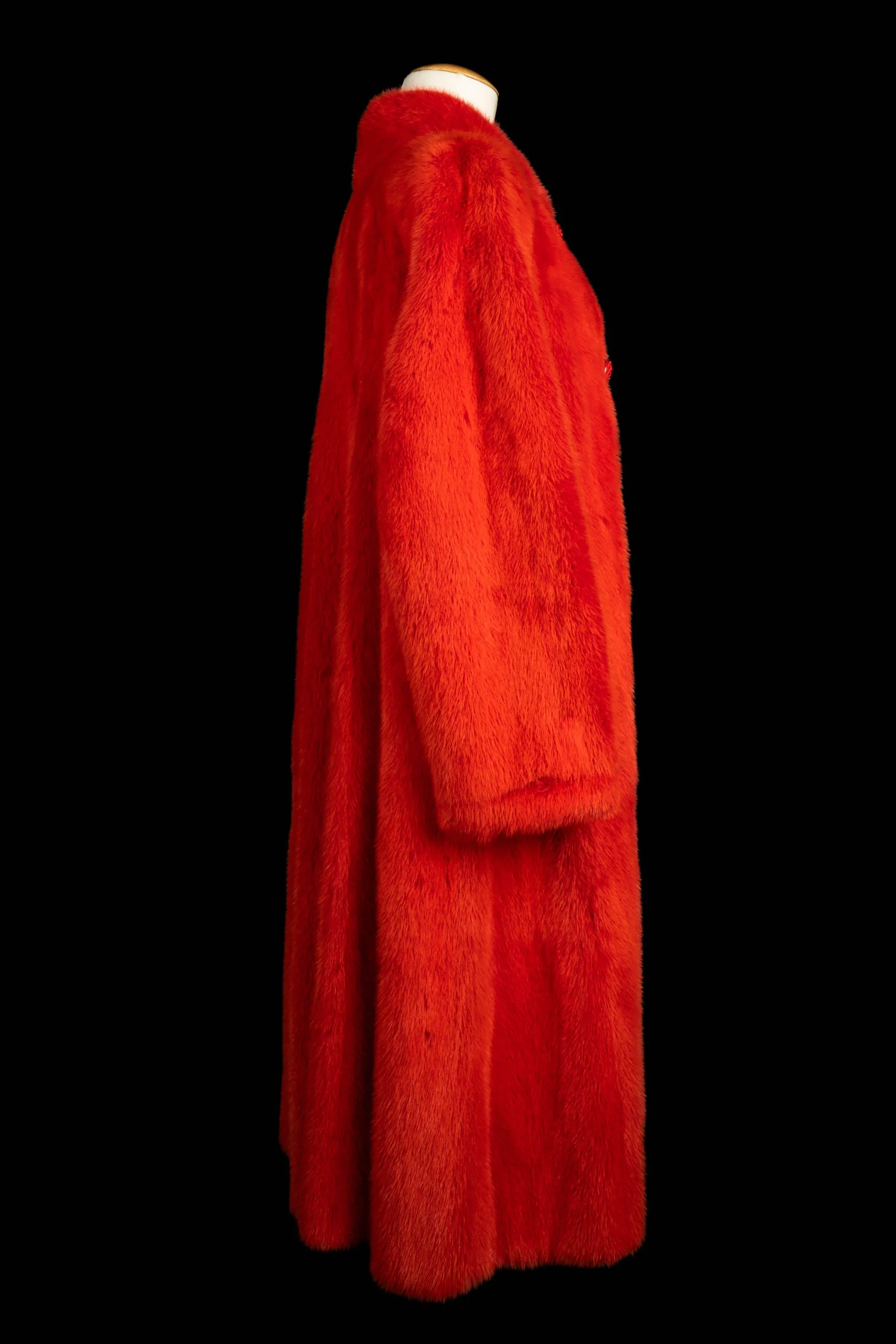 DIOR – (Made in France) Long manteau de fourrure de vison rouge et fermeture en passementerie. Doublure en soie. Etiquettes de taille et de compositions absentes, il convient à un 42FR/44FR.
