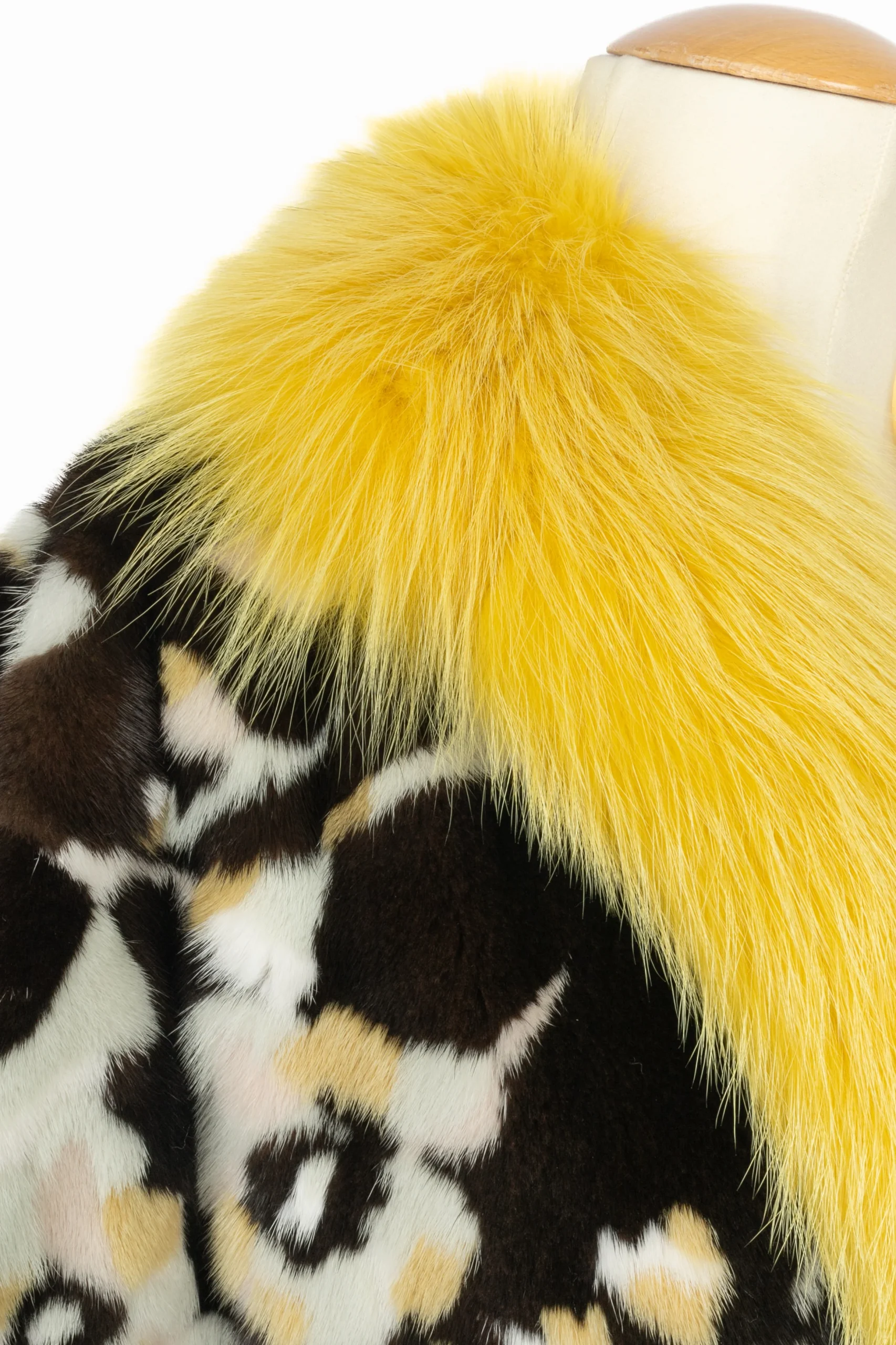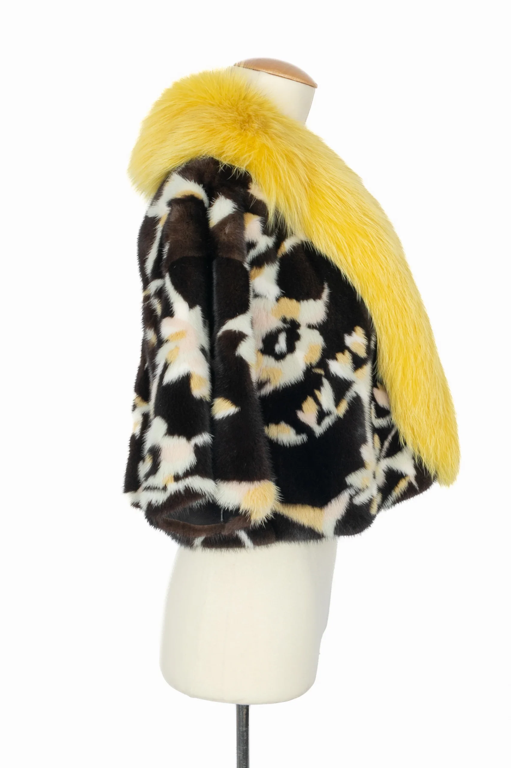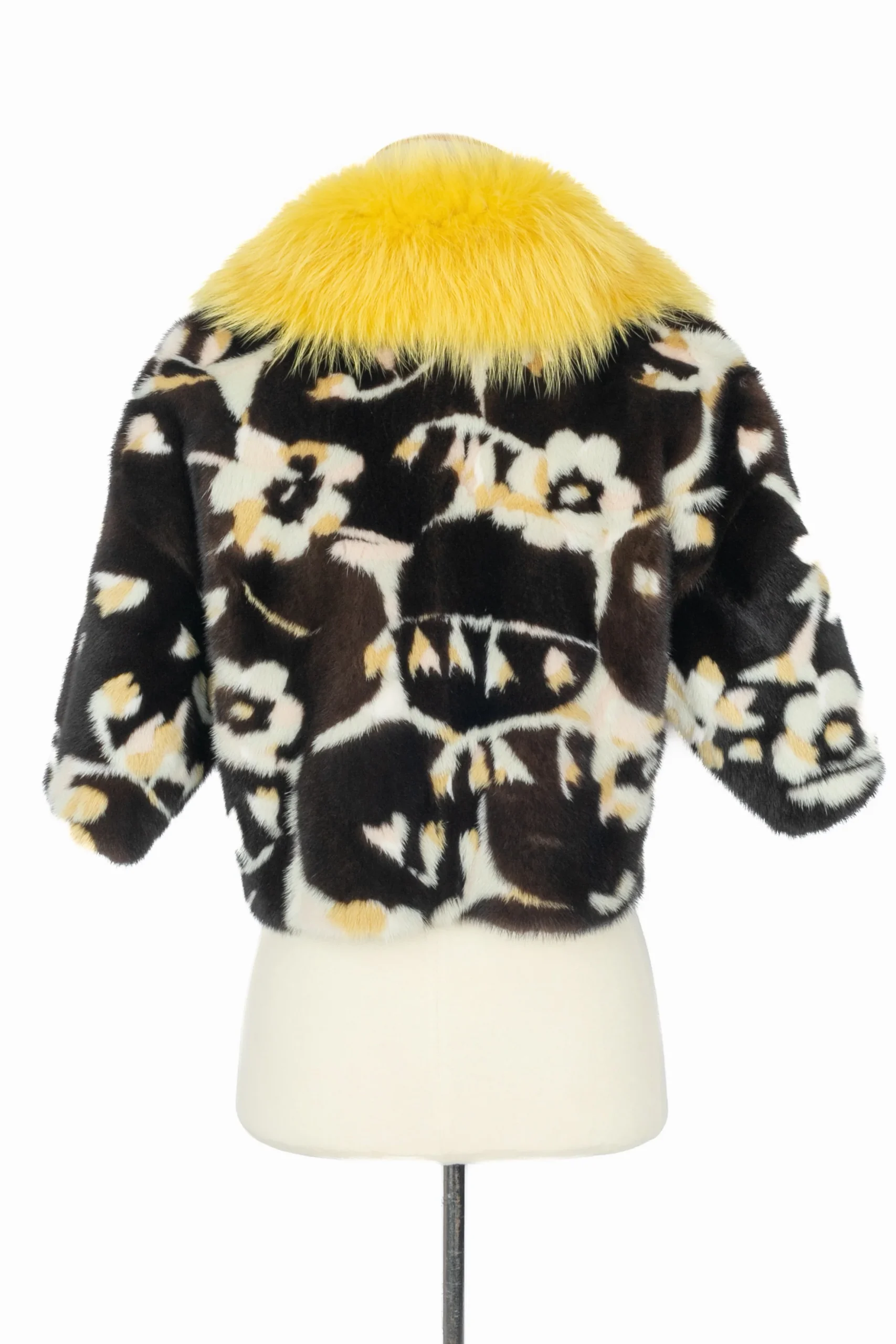 VALENTINO – (Made in Italy) Manteau court en fourrure de vison à motifs fleuris géométriques dans les tons de marron, de beige et de jaune. Important col jaune en fourrure de renard. Taille indiquée 40IT, il correspond à un 36FR. Collection Prefall 2017 sous la direction artistique de Pier Paolo Piccioli.