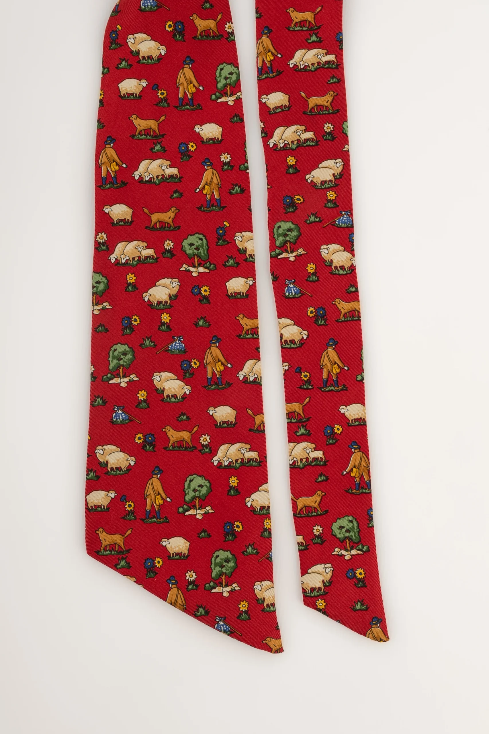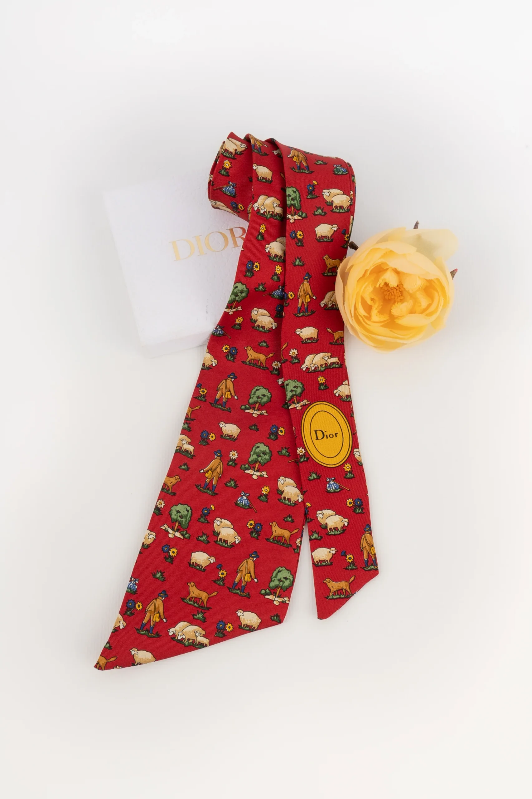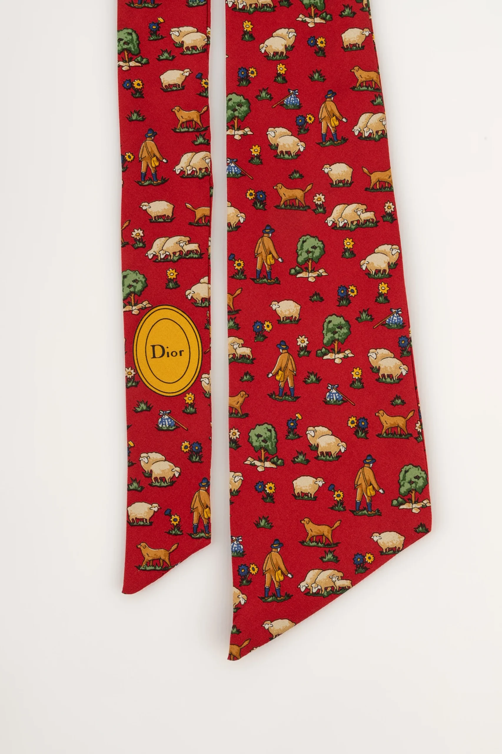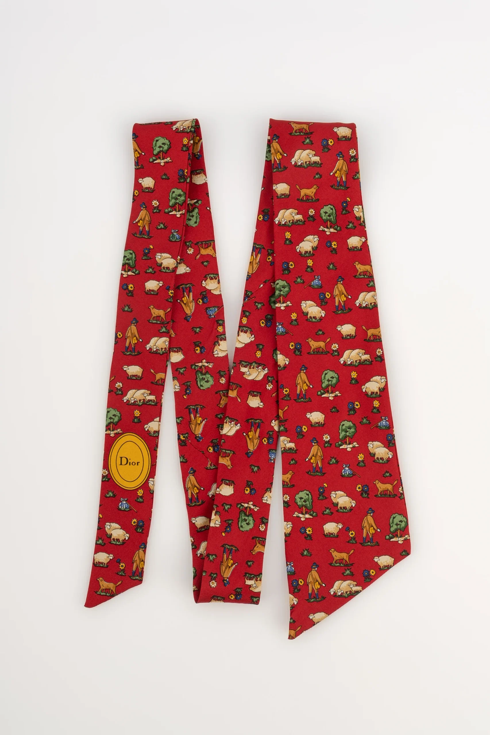 DIOR -(Made in France) Mitzah en twill de soie rouge illustré de moutons et de bergers. Condition : Très bon état Dimensions : Longueur : 117 cm – Largeur : 8 cm