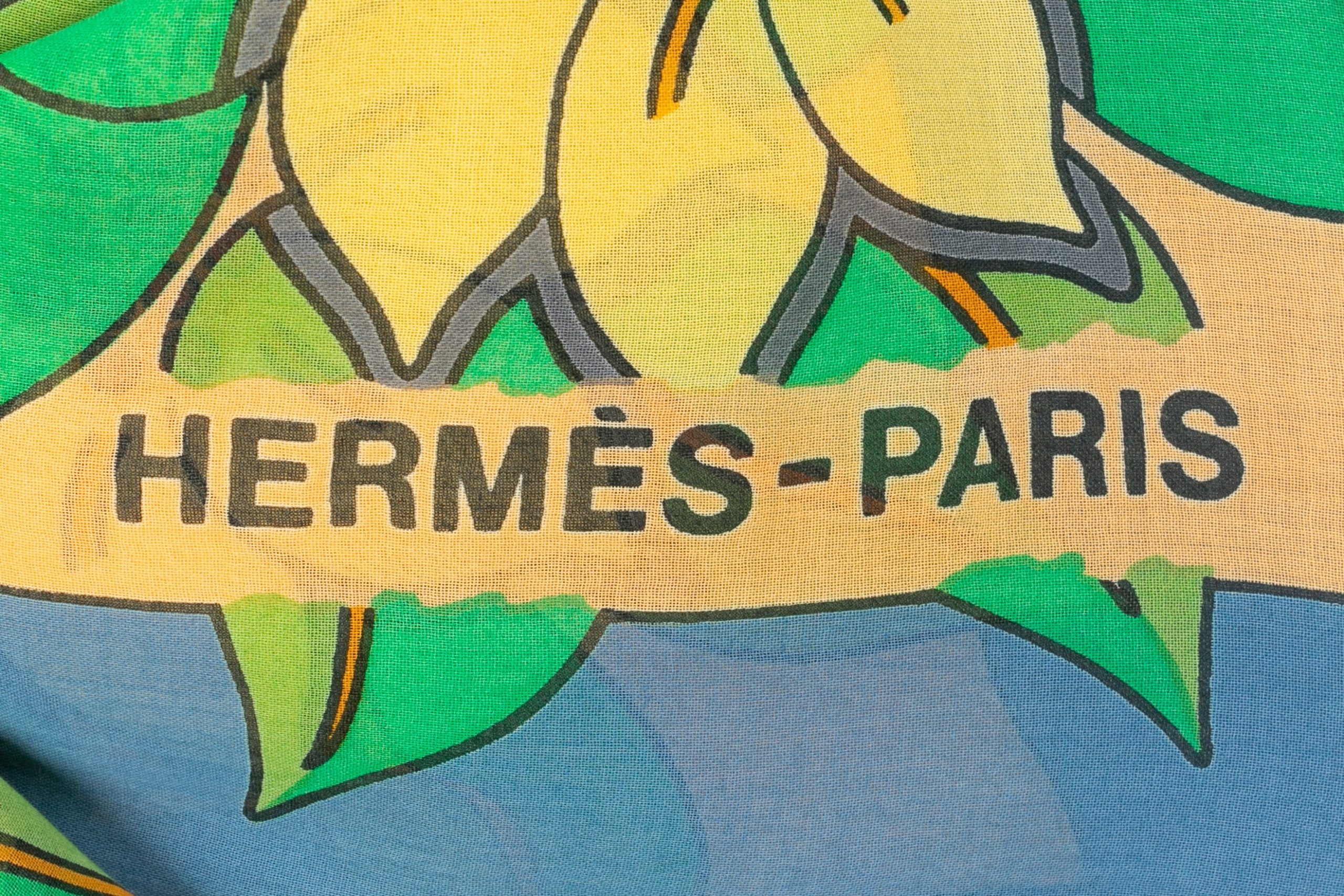 HERMÈS -(Made in France) Foulard en coton sur fond bleu à motif d’ananas dans les tons de vert, de jaune et de orange. A signaler : fil tiré et petite tache. Condition : Bon état Dimensions : 170 cm x 150 cm