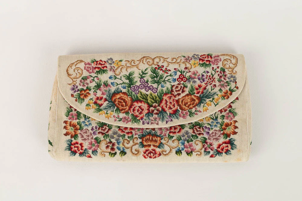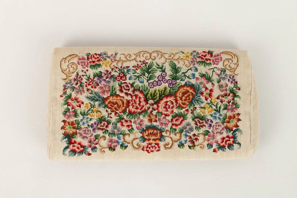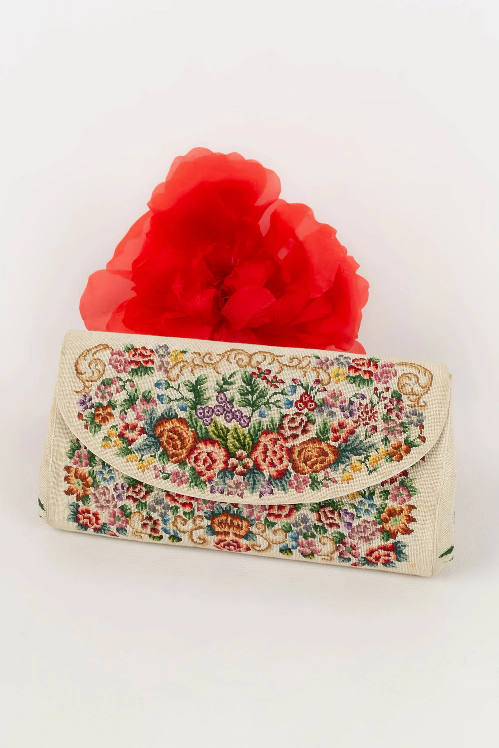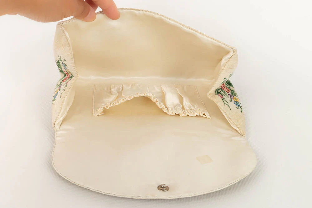 ANONYME -Petit sac brodée d’un motif floral sur fond blanc cassé. Intérieur en soie. Condition : Bon état Dimensions : Hauteur : 12 cm – Longueur : 20 cm – Profondeur : 2 cm