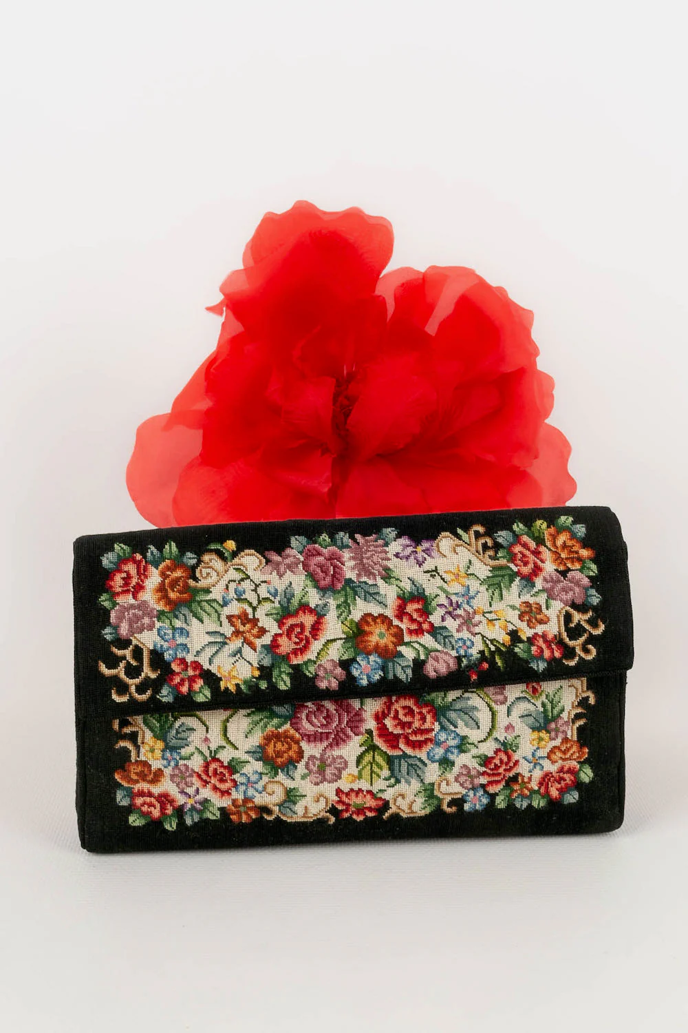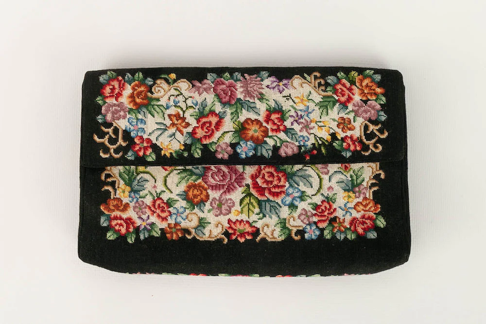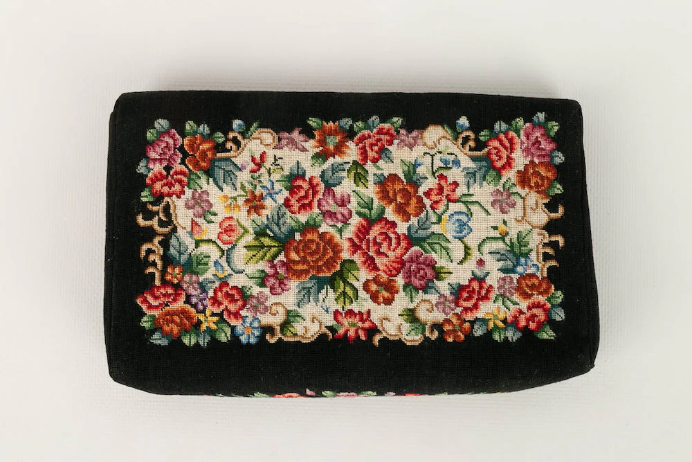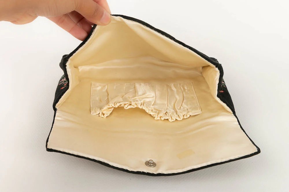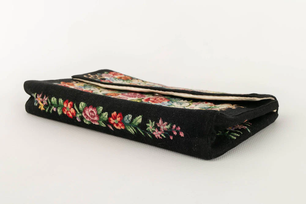 ANONYME -Pochette brodée d’un motif floral sur fond noir. Intérieur en soie. Condition : Bon état Dimensions : Hauteur : 12 cm – Longueur : 19,5 cm – Profondeur : 3 cm