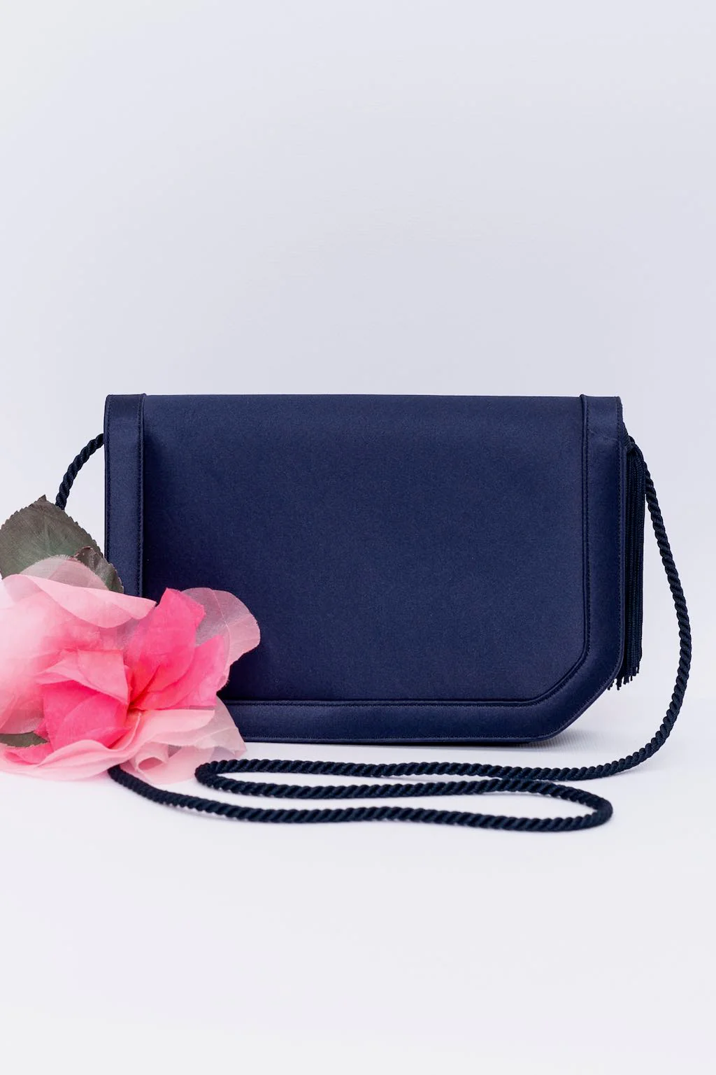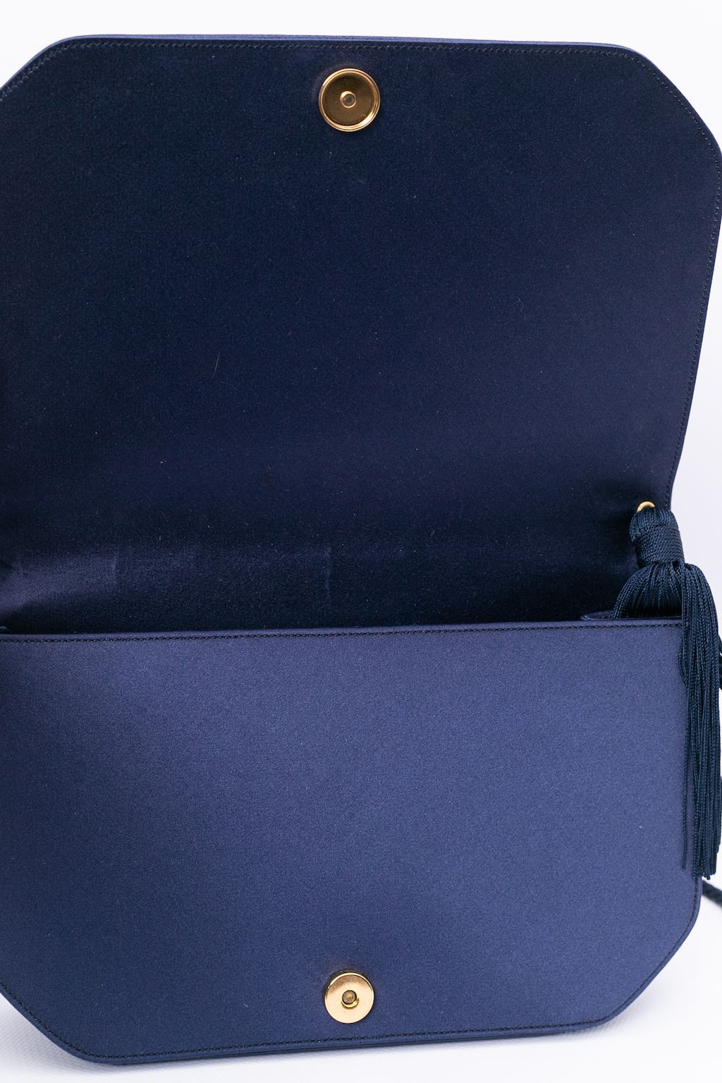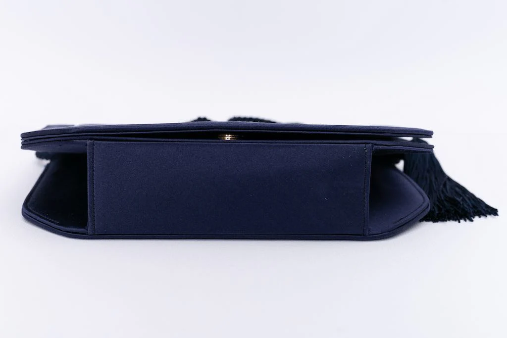 RENAUD PELLEGRINO (Made in France) Pochette du soir en satin bleu foncé agrémenté d’un pompon en passementerie. Porté épaule, il dispose d’une anse.