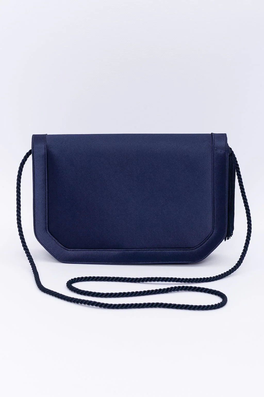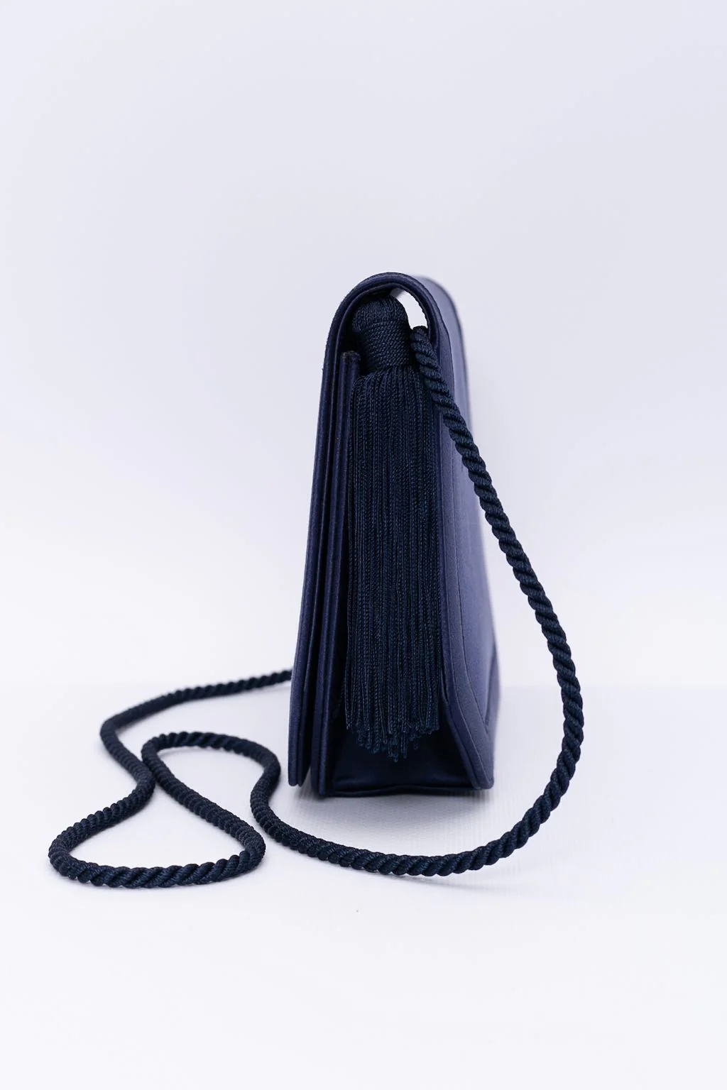 RENAUD PELLEGRINO (Made in France) Pochette du soir en satin bleu foncé agrémenté d’un pompon en passementerie. Porté épaule, il dispose d’une anse. Etat :Bon état général Dimensions :Largeur : 22 cm – Hauteur : 15 cm – Profondeur : 5 cm – Anse : 104 cm