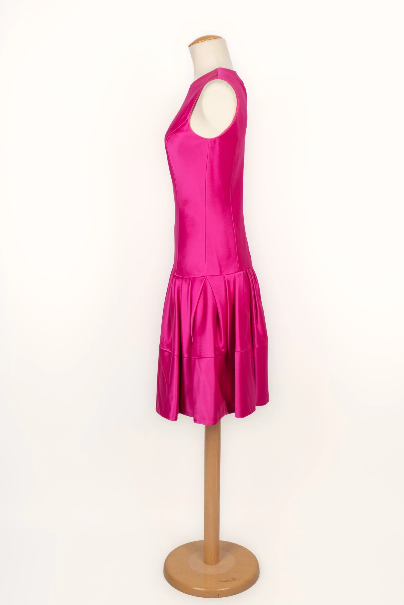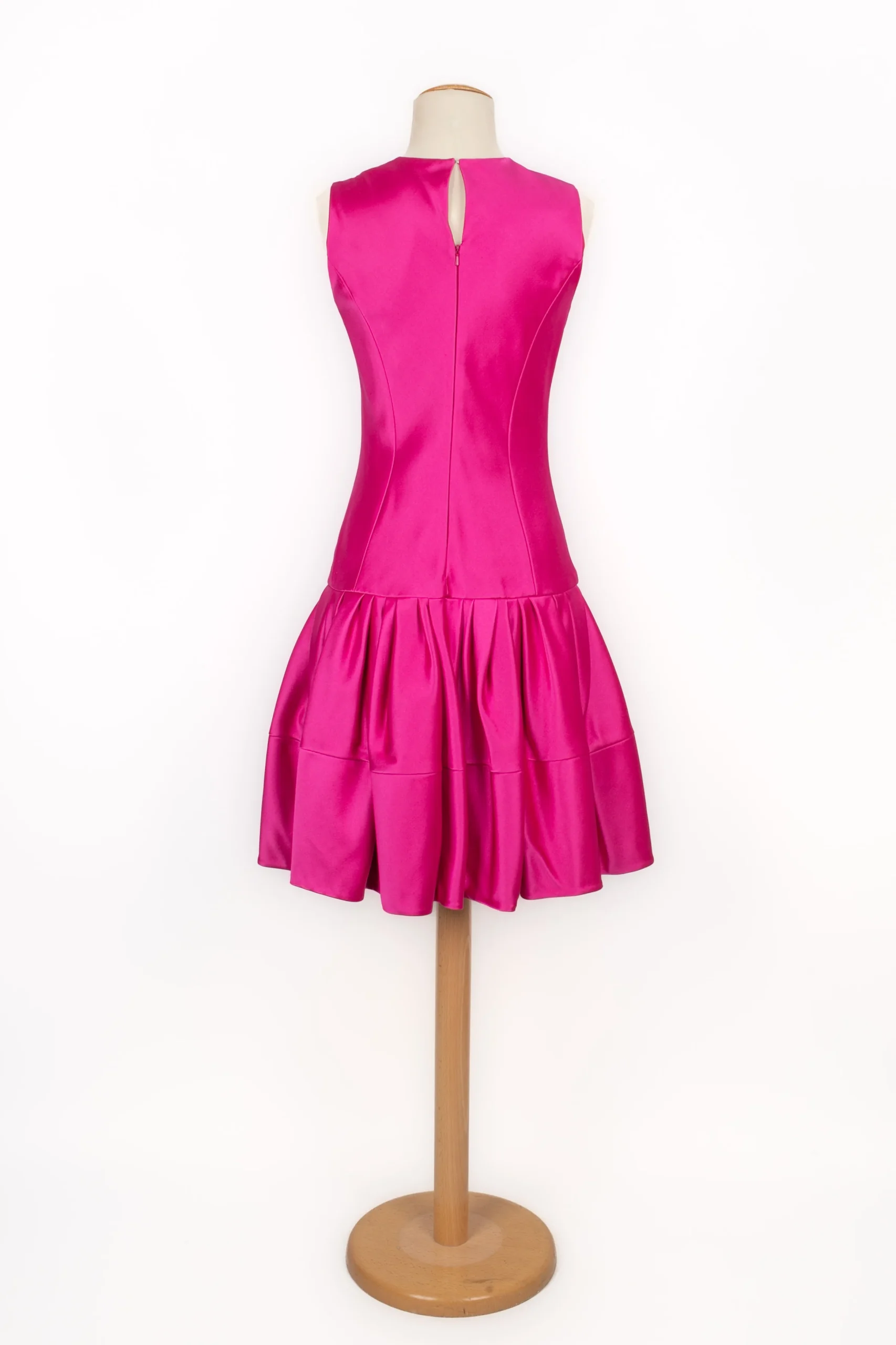 DIOR -(Made in France) Robe sans manches en satin fuchsia. Taille indiquée 36FR. Collection Pre-fall 2012, sous la direction de Raf Simons. Etiquette de marque absente. Condition : Bon état Dimensions : Poitrine : 30 cm – Taille : 36 cm – Hanches : 38 cm – Longueur : 96 cm