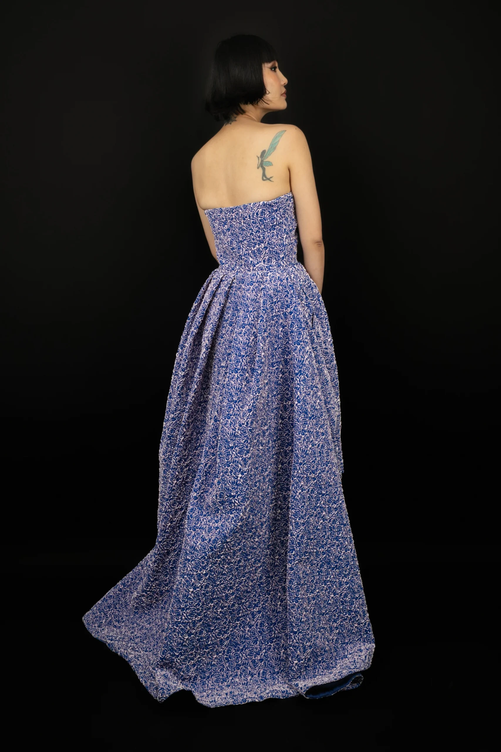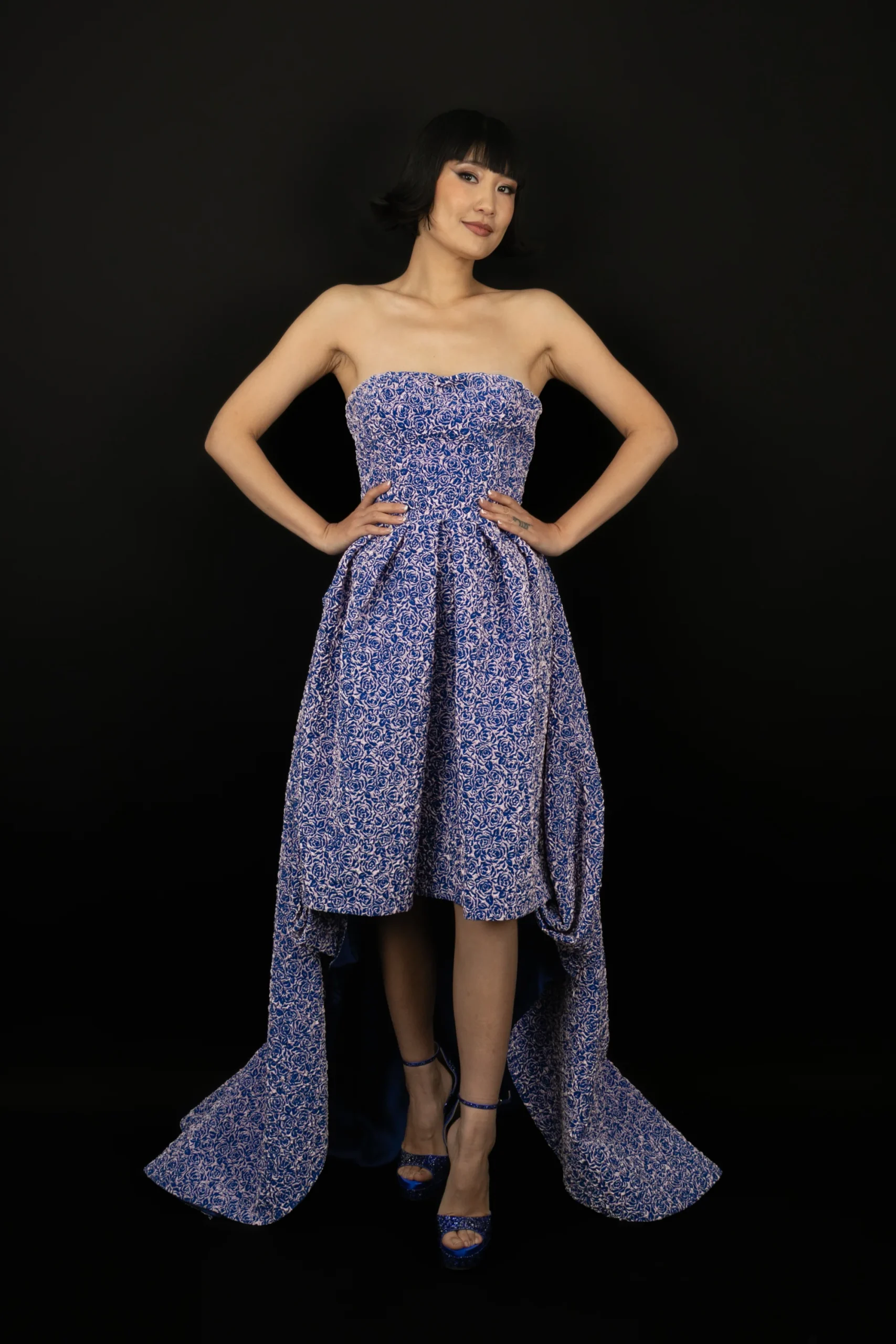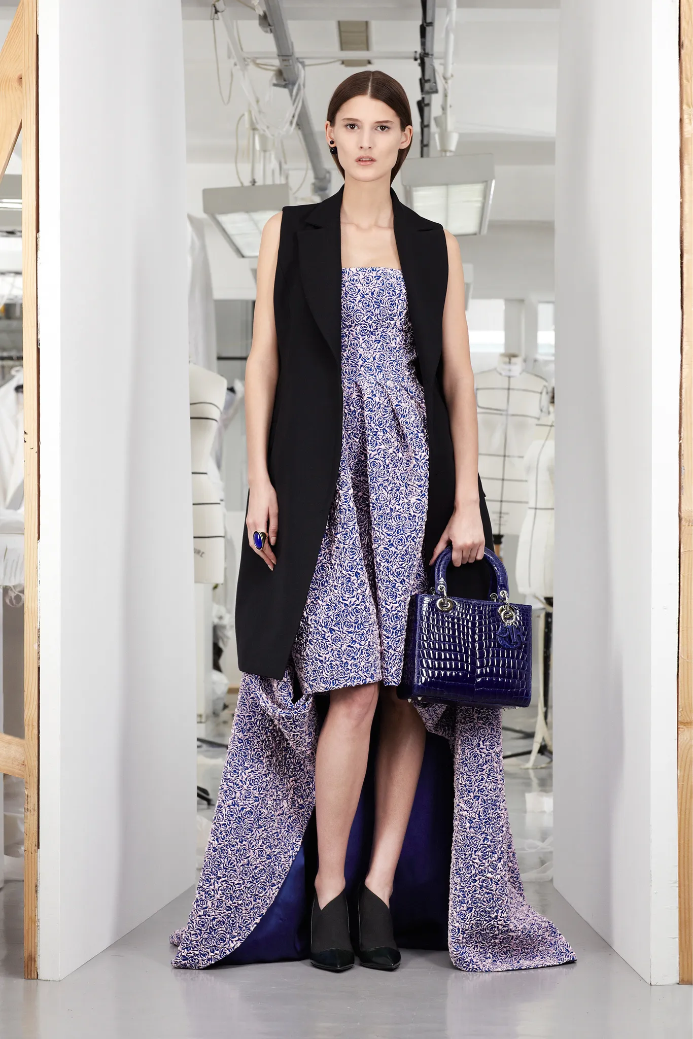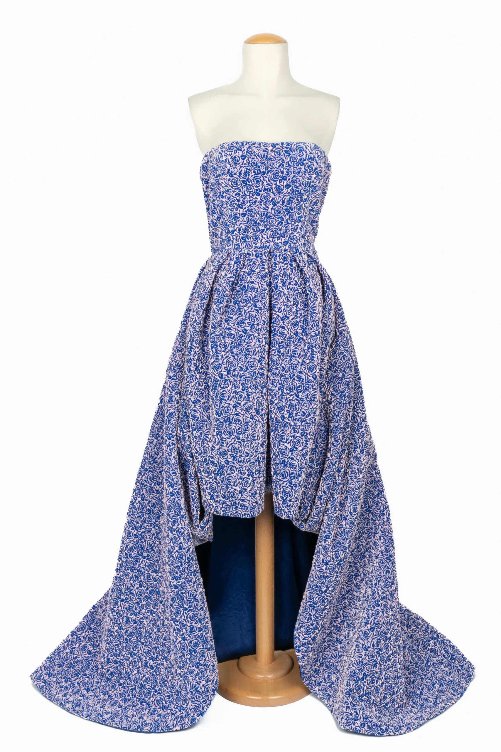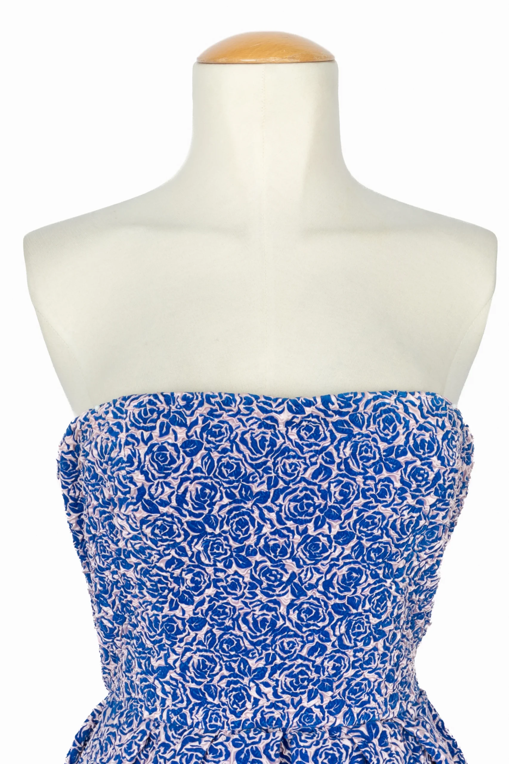 DIOR -(Made in France) Robe bustier en tissu gaufré rose agrémenté de velours bleu figurant un motif floral. Taille indiquée 36FR. Collection Pre-fall 2013 sous la direction artistique de Raf Simons.