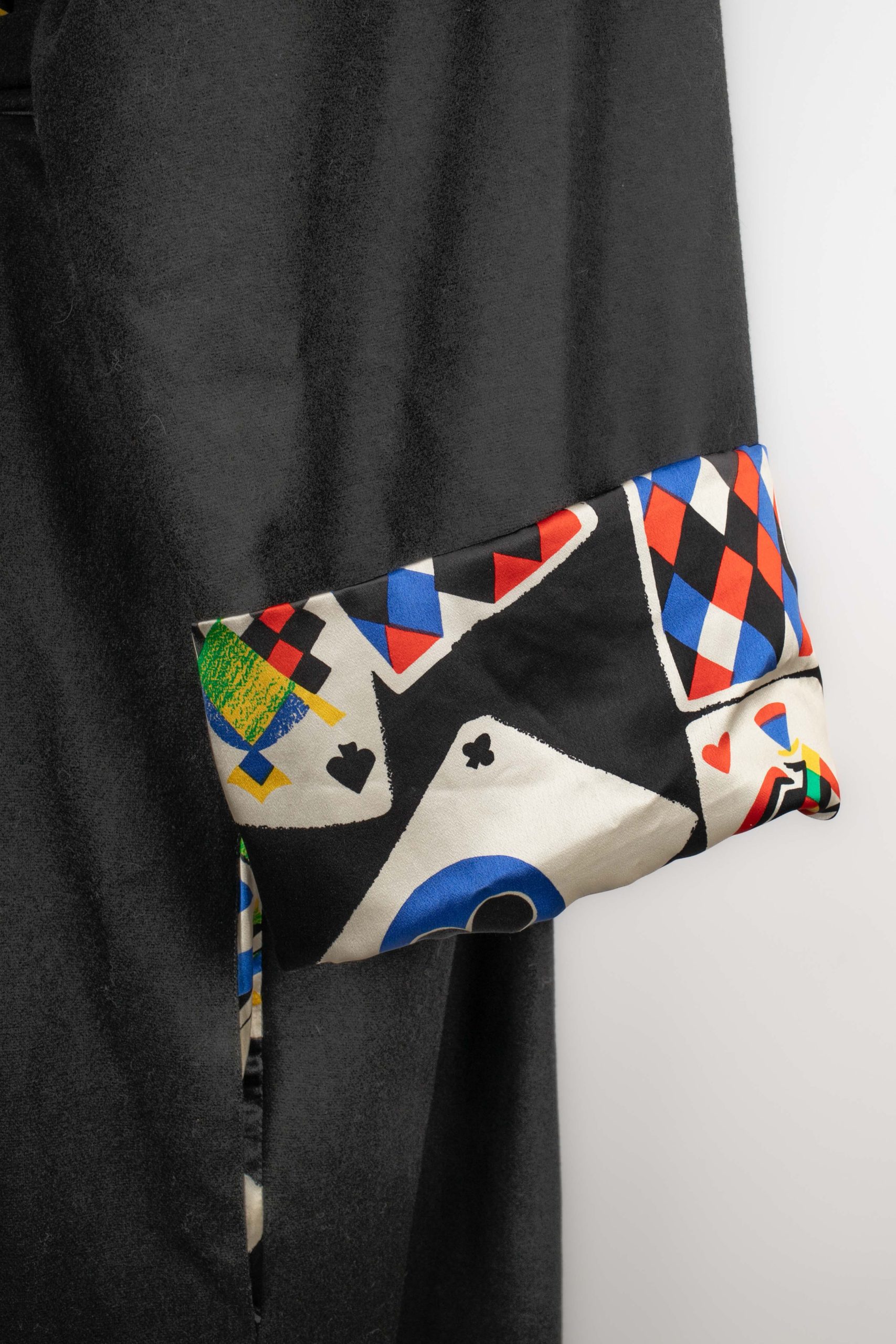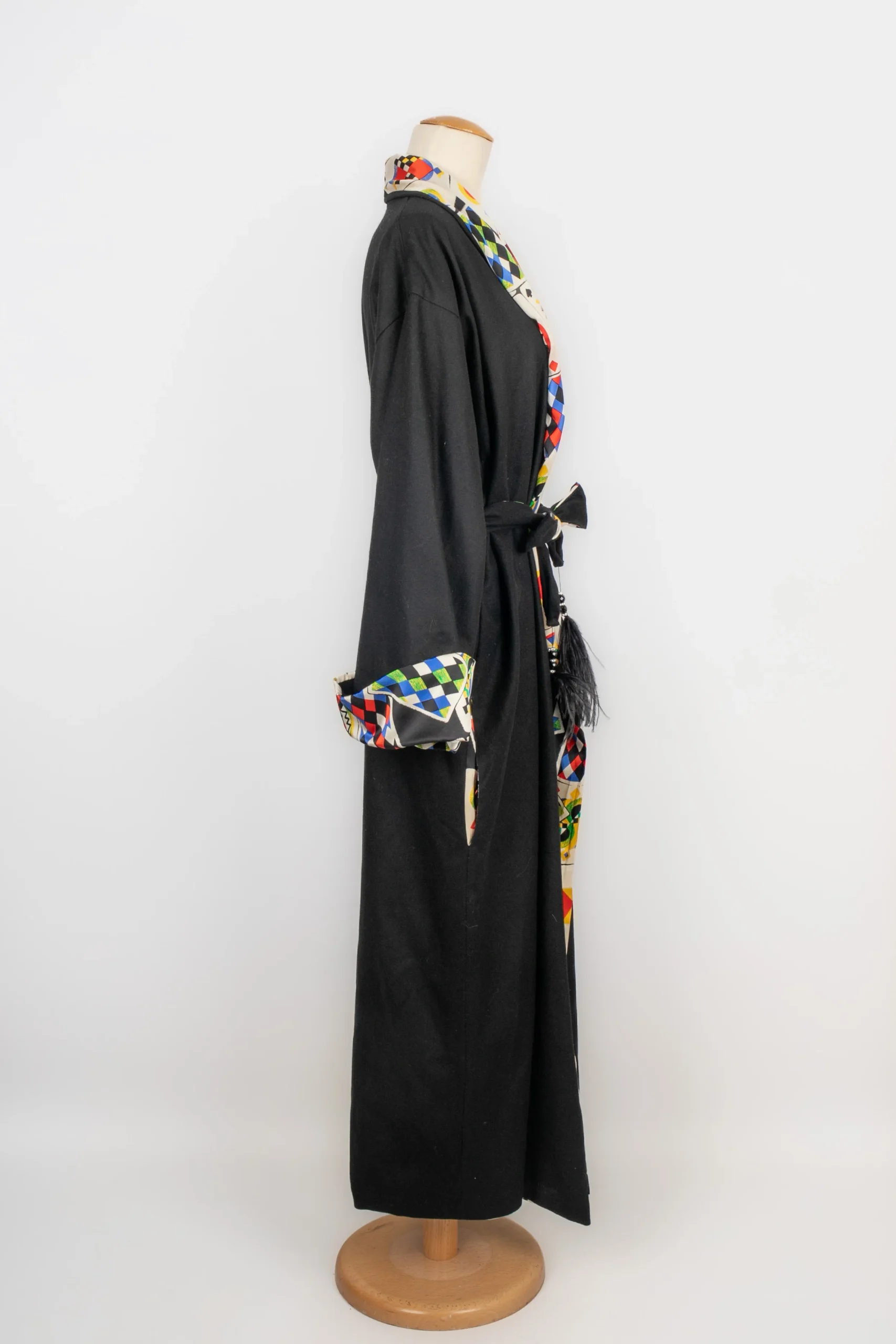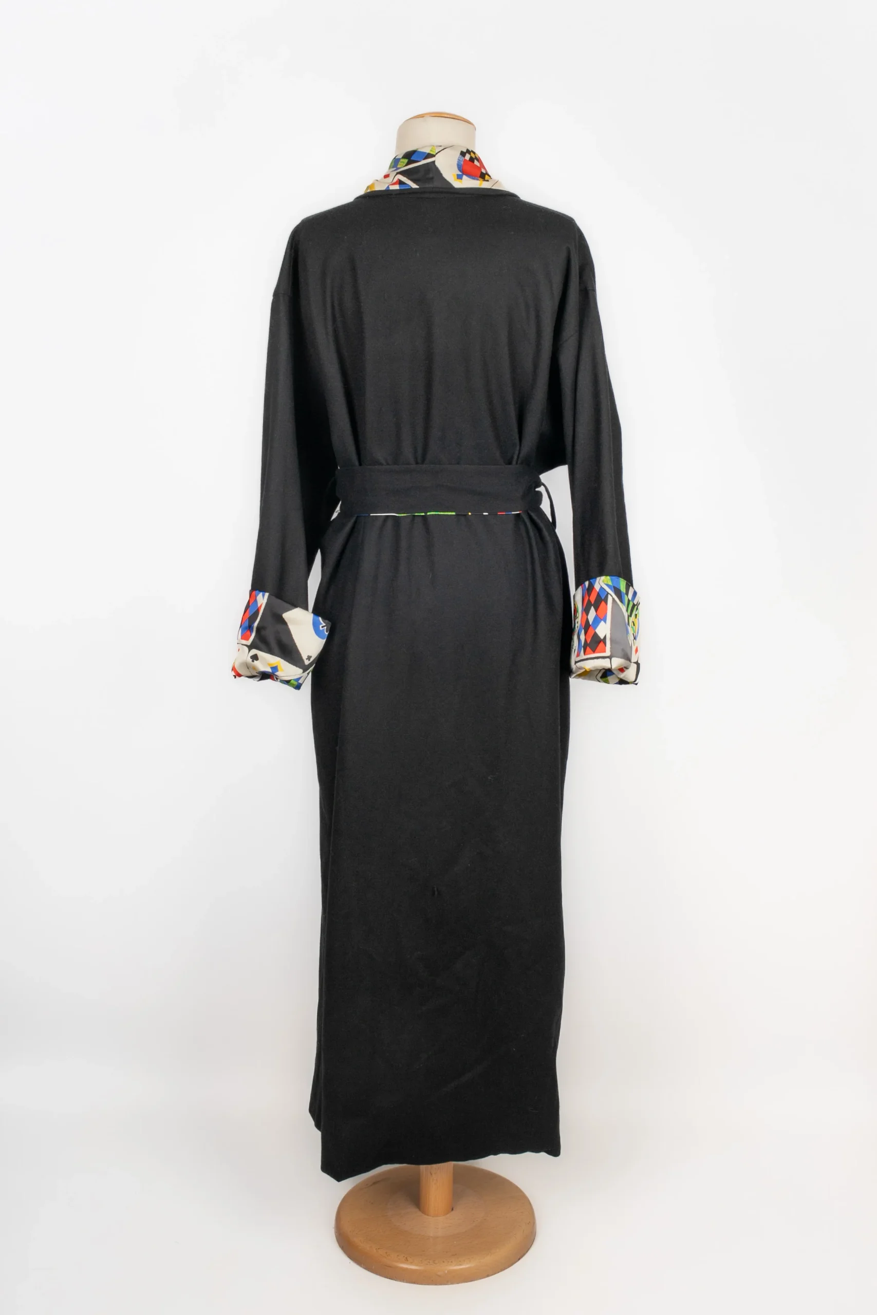 VERSACE -(Made in Italy) Robe de chambre en laine mélangée noire et doublure en soie à motif « Jeu de Cartes ». Taille indiquée 42IT. Condition : Très bon état Dimensions : Largeur d’épaules : 55 cm – Longueur des manches : 55 cm – Longueur : 140 cm