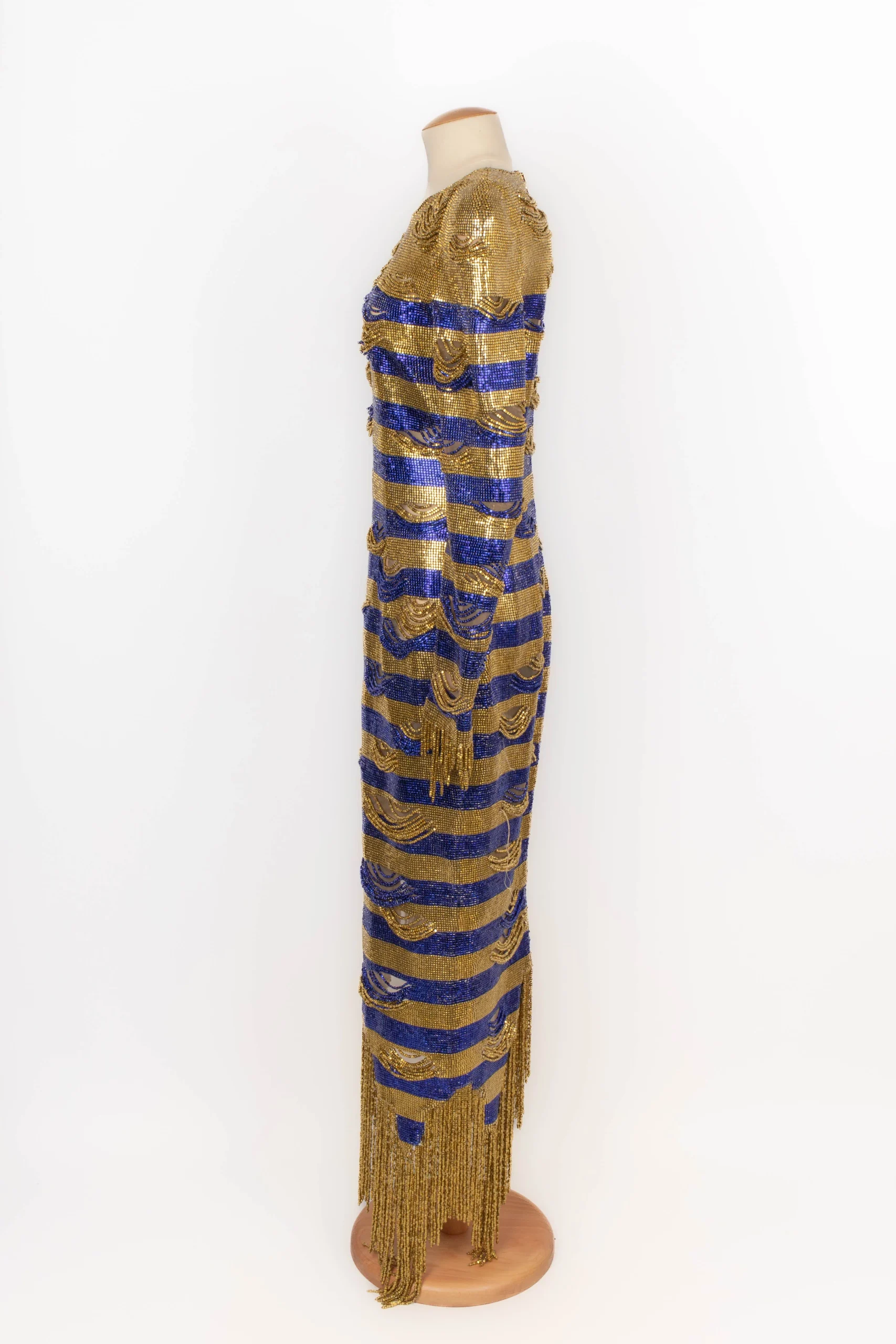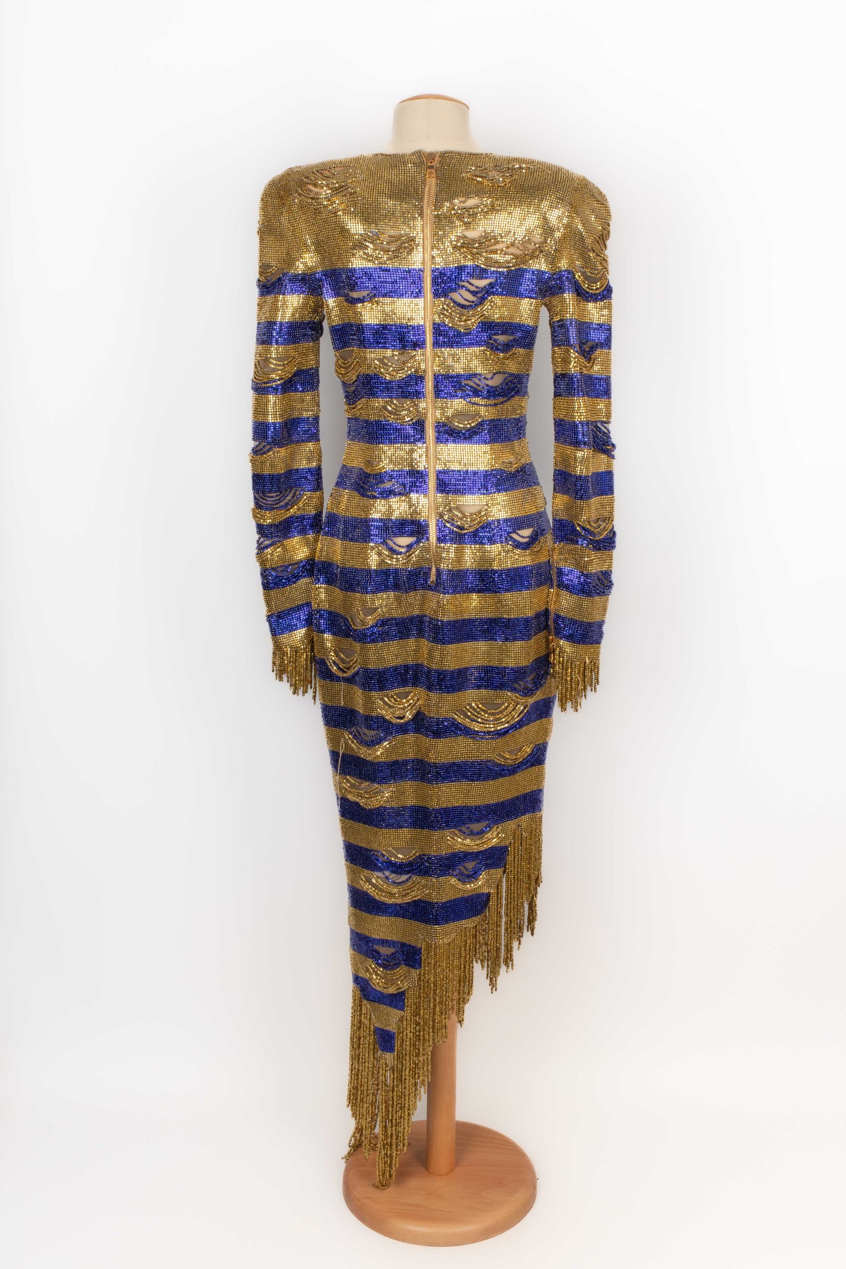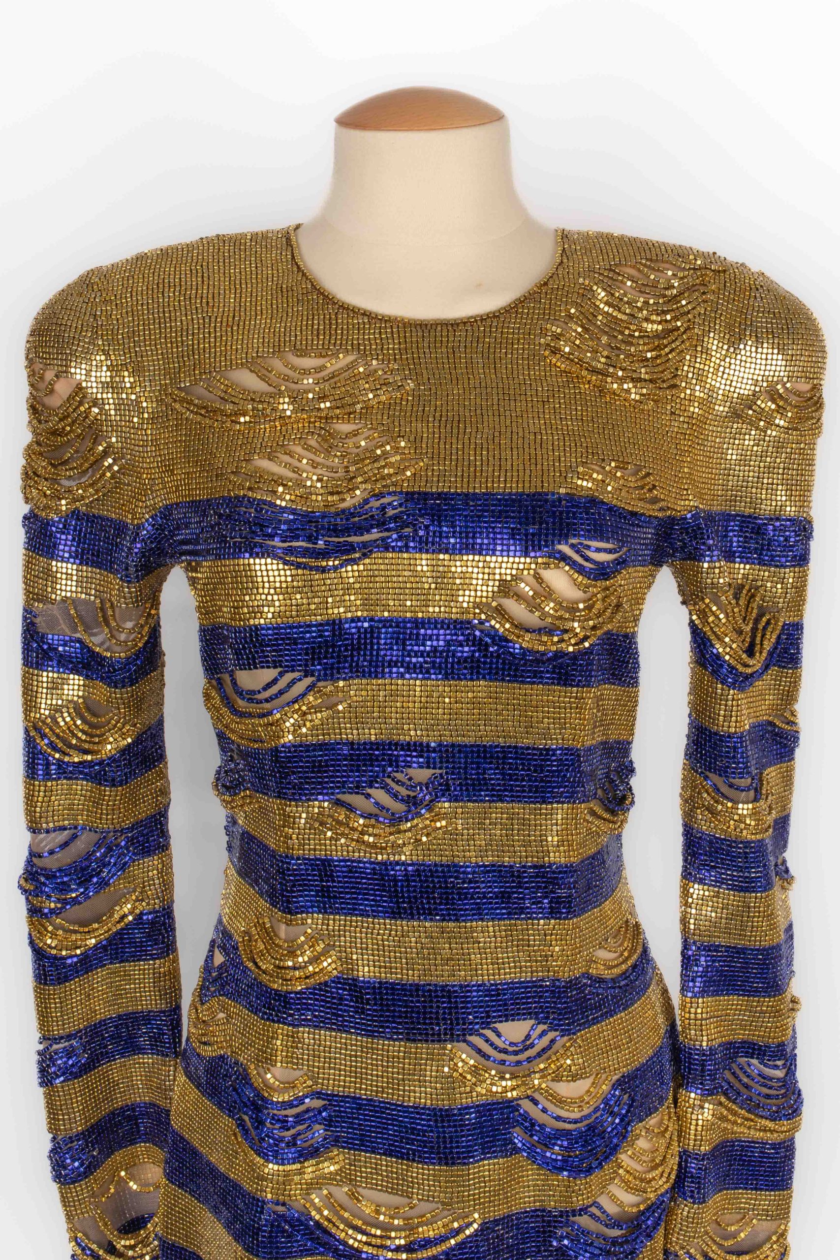 BALMAIN -Robe « Egyptienne » entièrement brodée d’un motif à rayures en perles carrées dorées et bleues. Taille indiquée 38FR. Collection Resort 2023 sous la direction artistique de Olivier Rousteing.