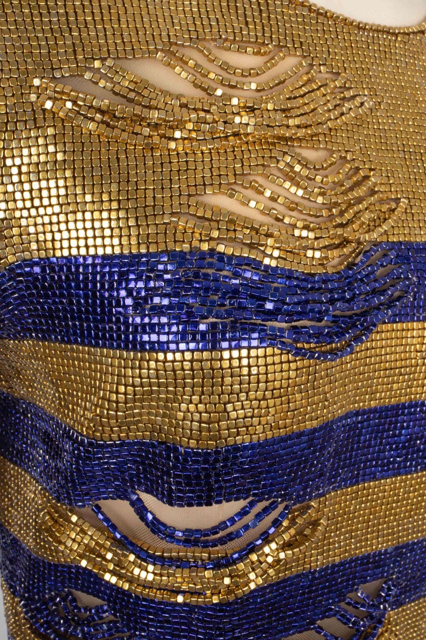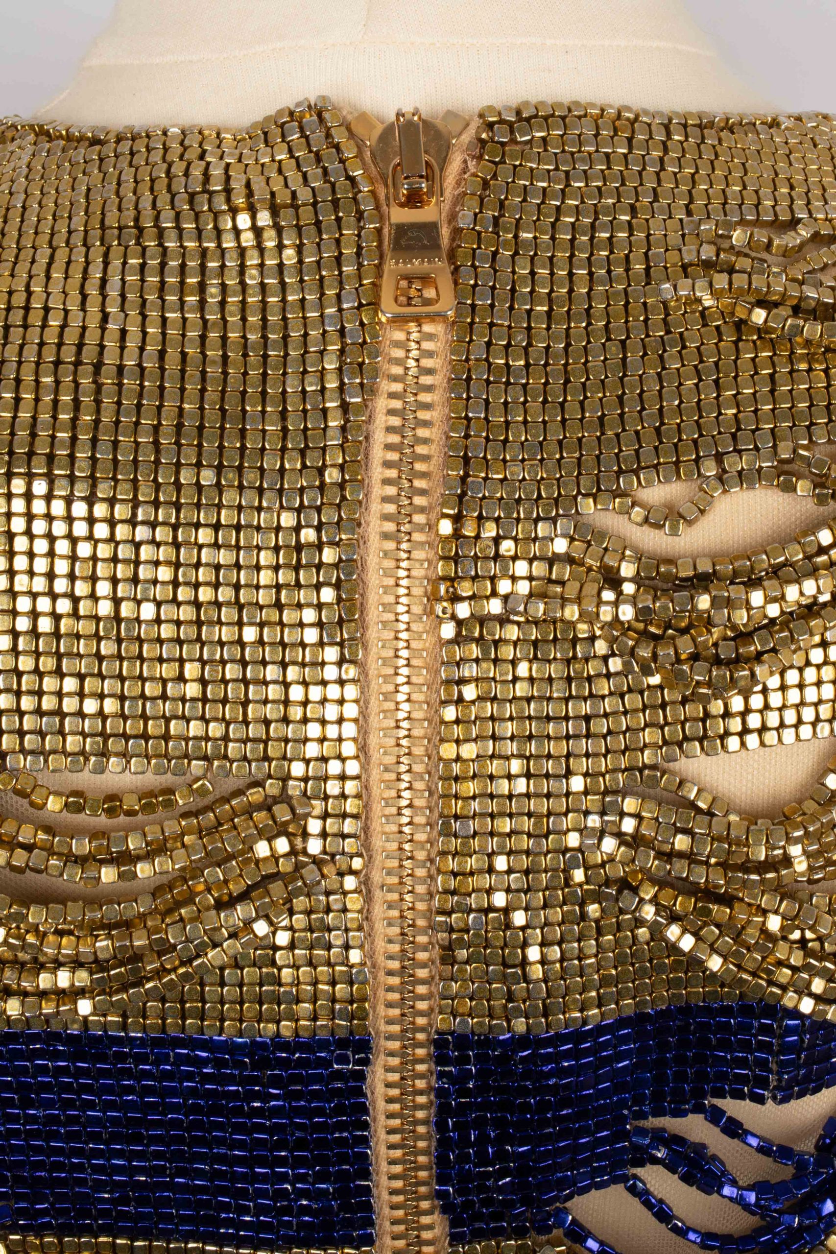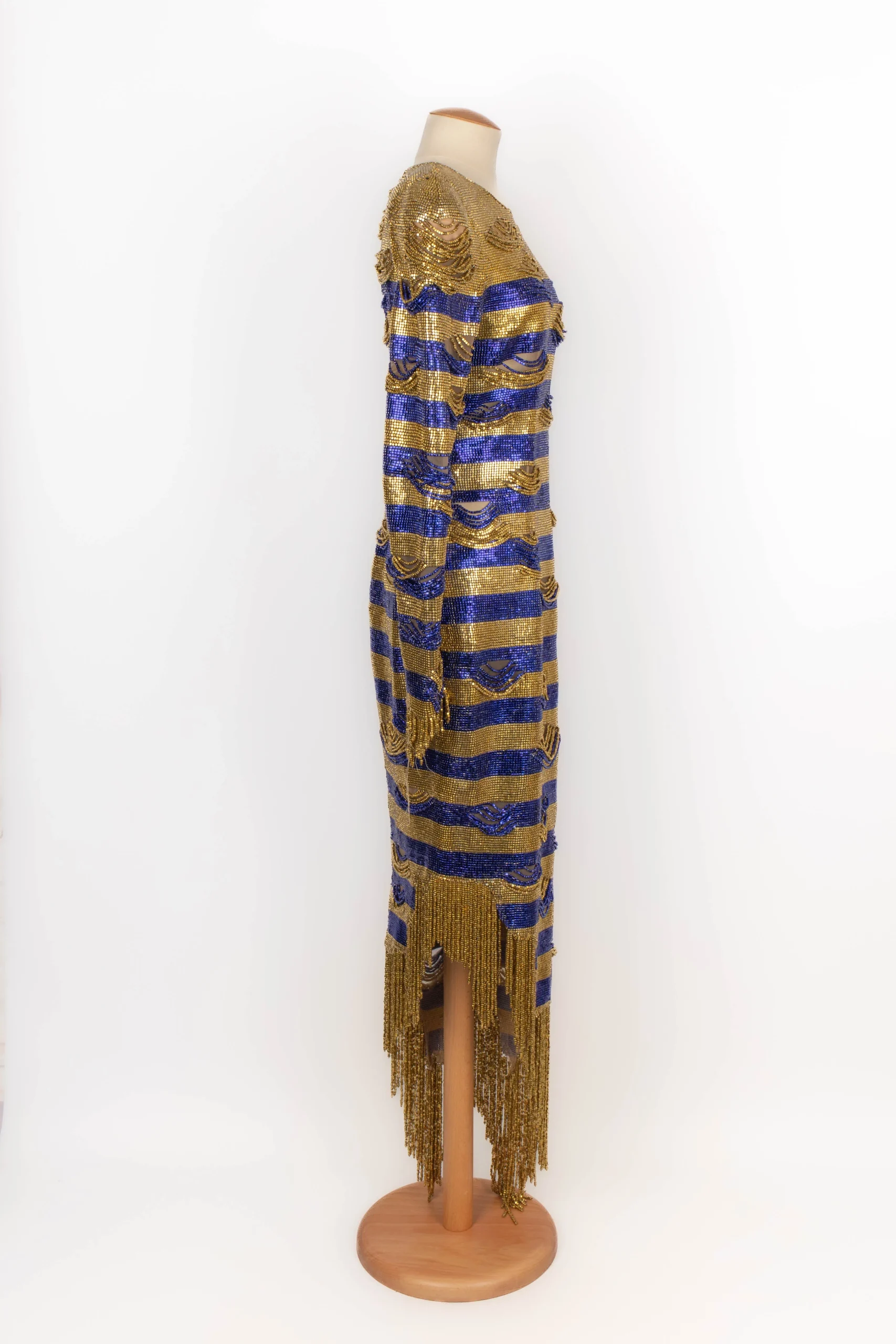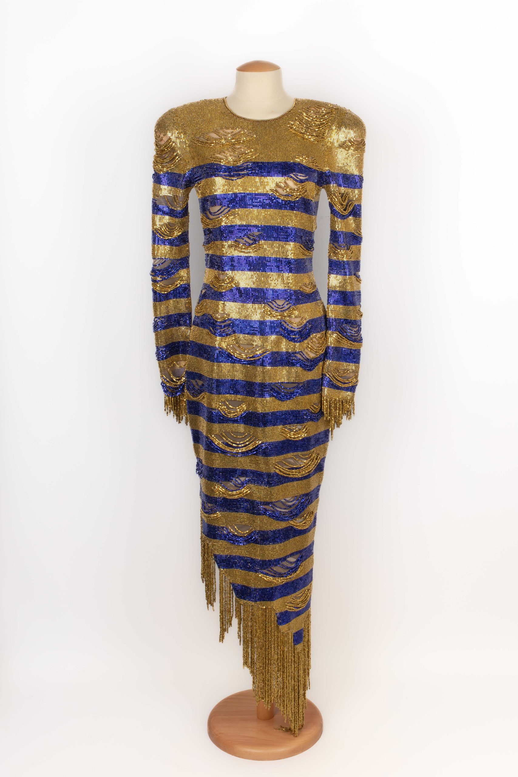 BALMAIN -Robe « Egyptienne » entièrement brodée d’un motif à rayures en perles carrées dorées et bleues. Taille indiquée 38FR. Collection Resort 2023 sous la direction artistique de Olivier Rousteing.