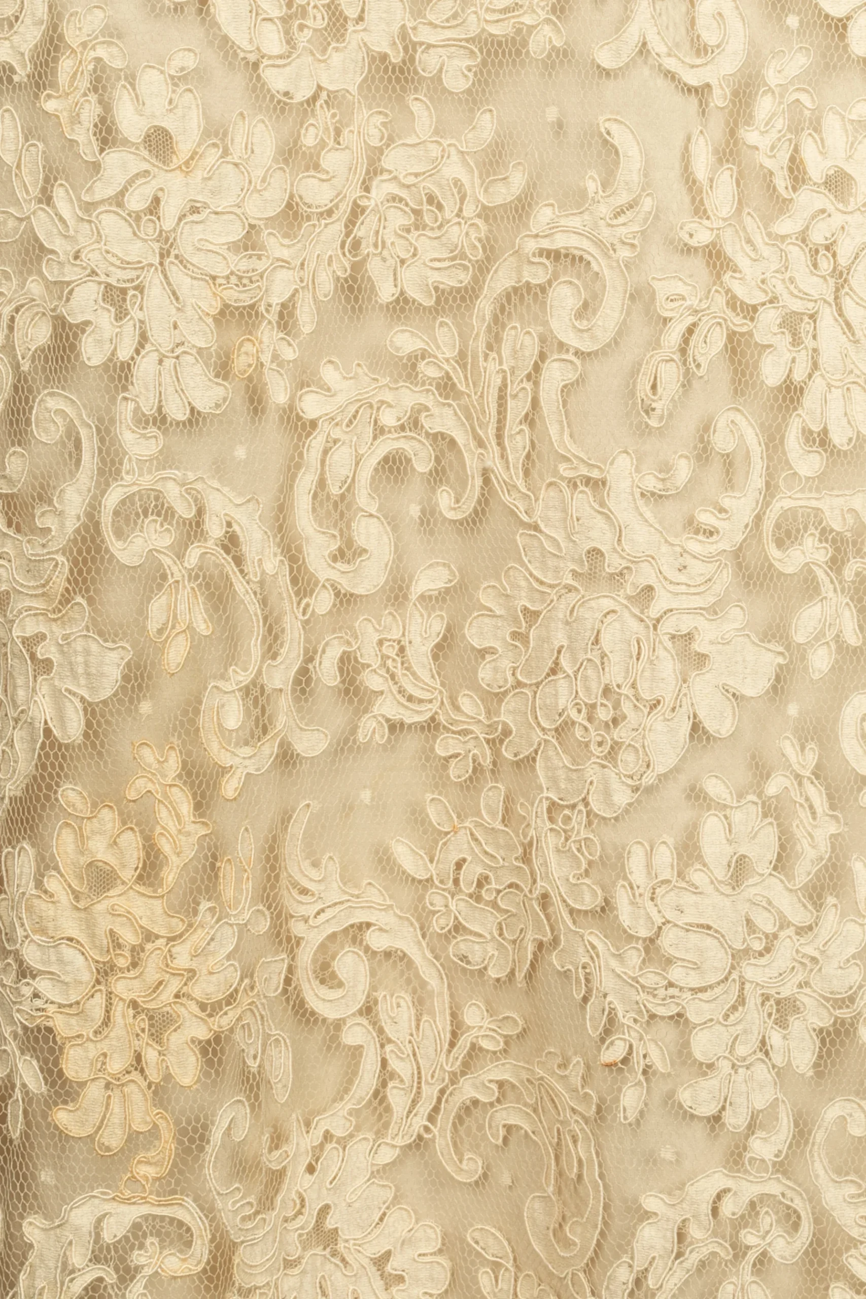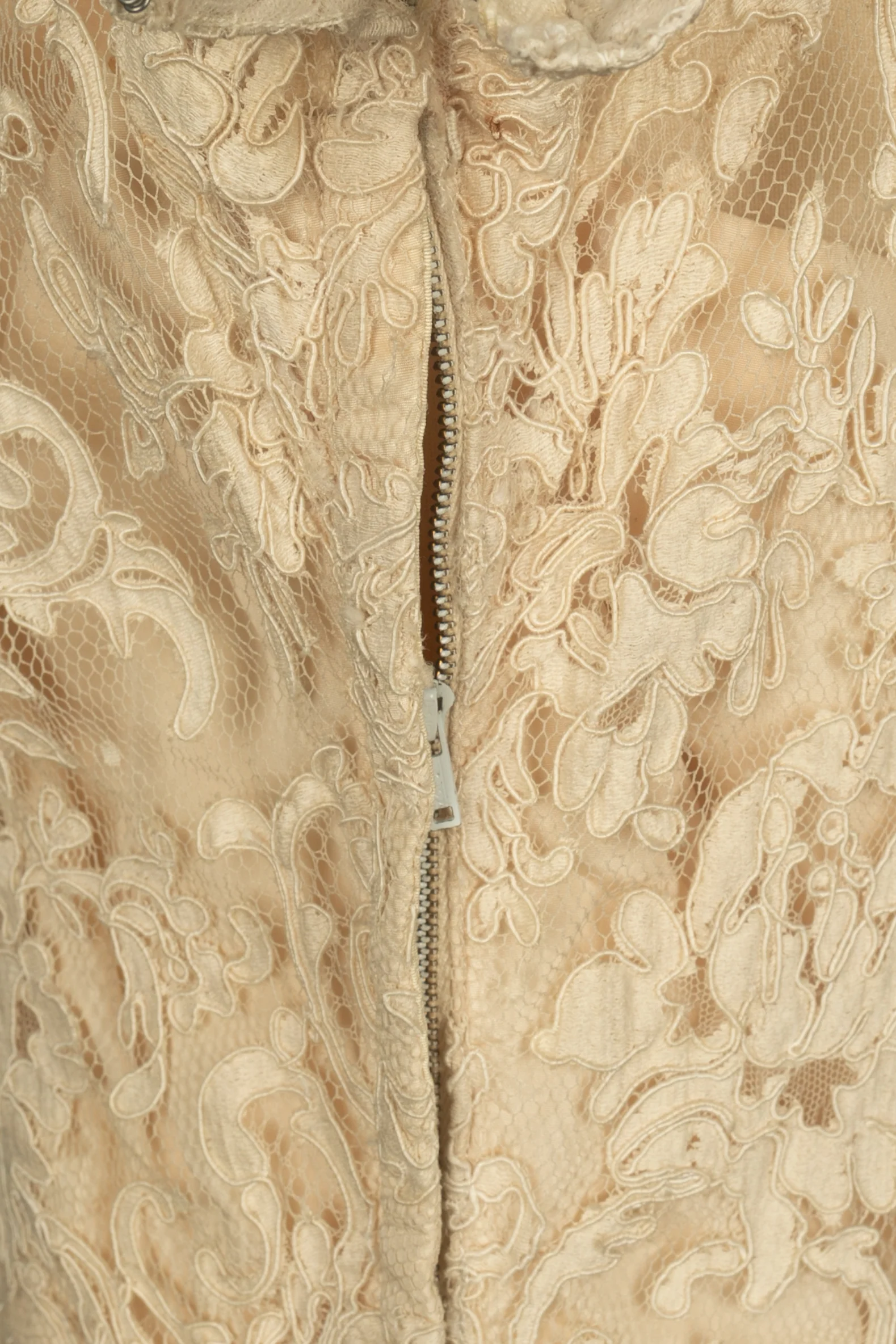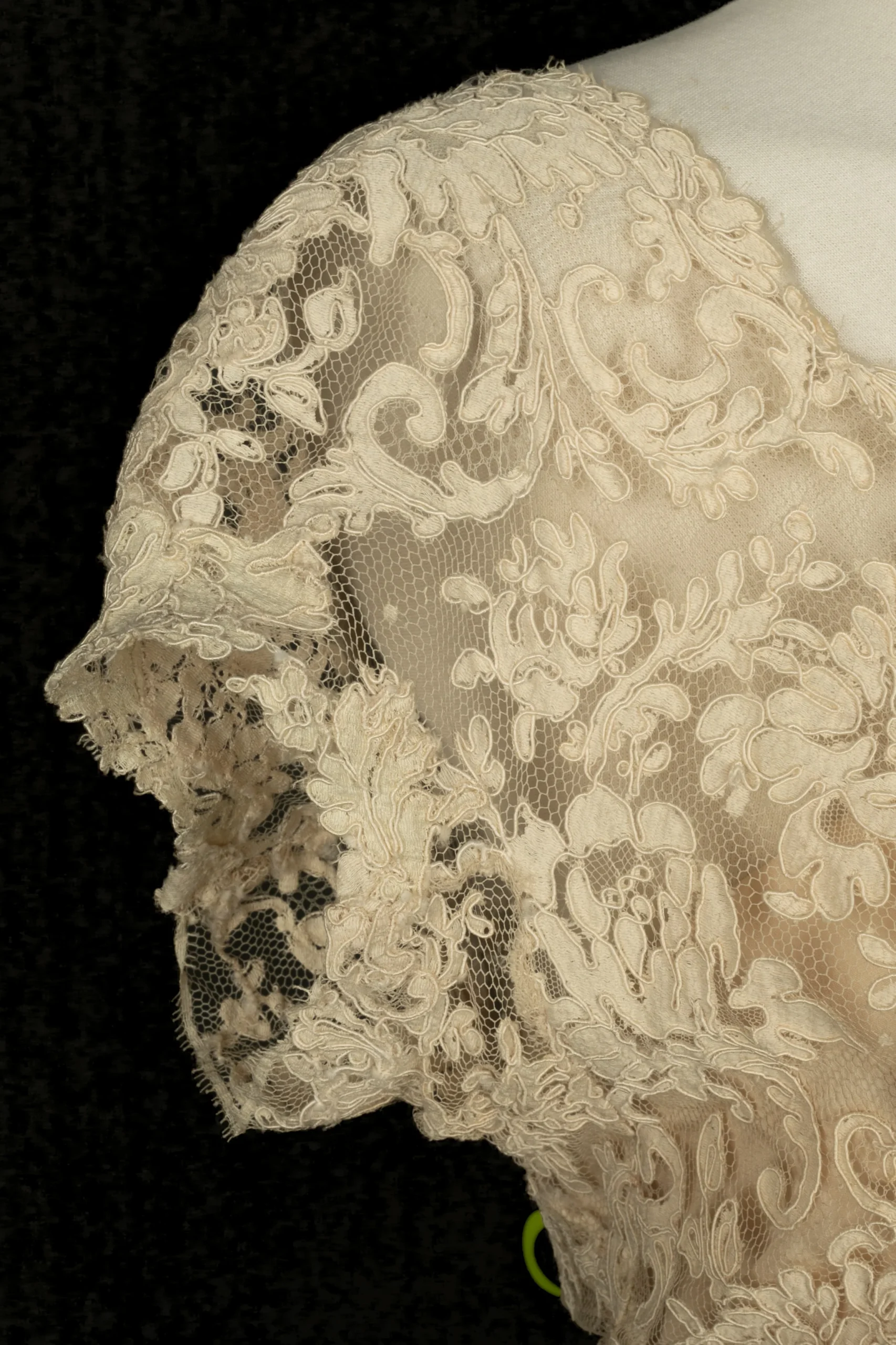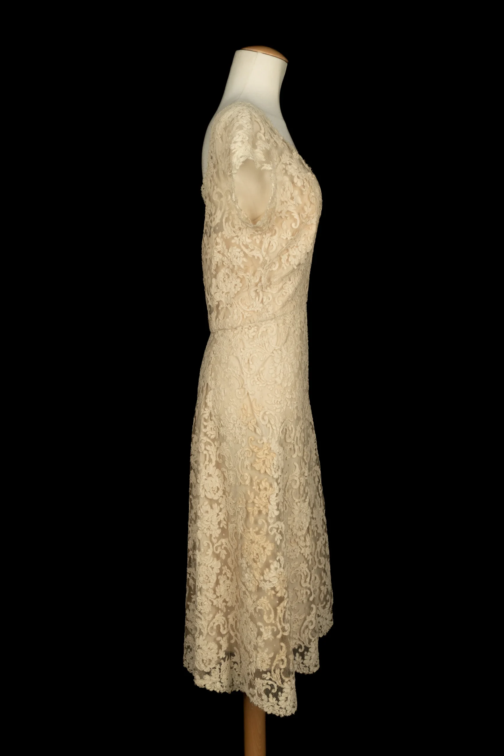 ANONYME – (Made in USA) Robe en guipure beige et doublure en soie. Pièce signée Georgiana Jordan datant des années 1950. Etiquettes de taille et de composition absentes, elle convient à un 36FR. A signaler, présence d’une tache au niveau de la poitrine.