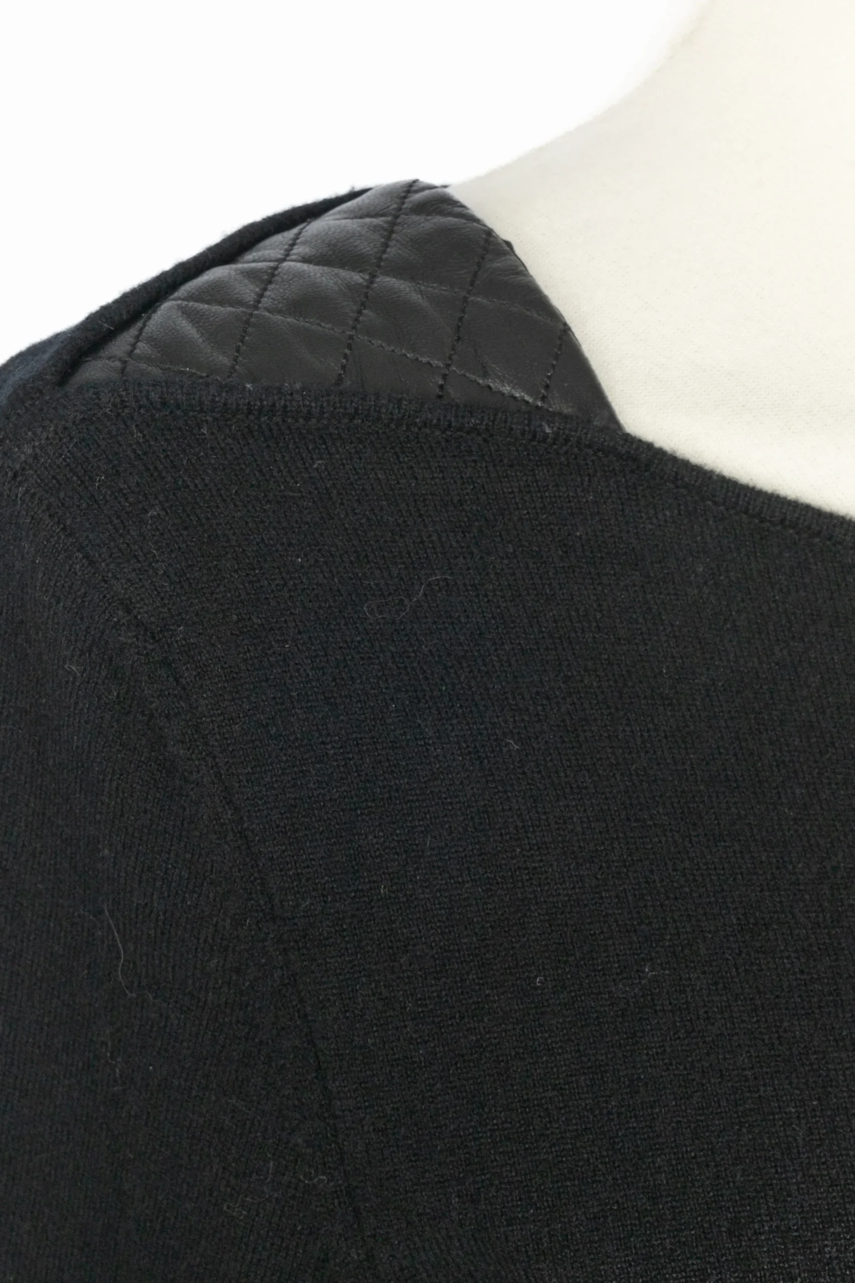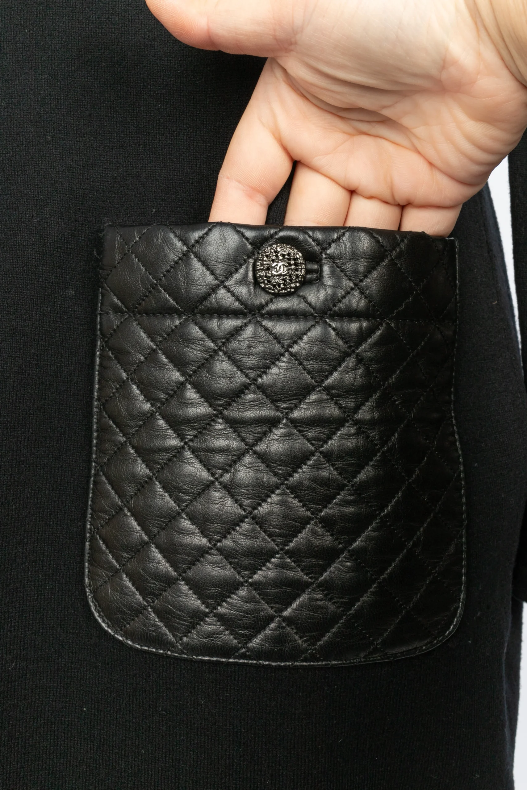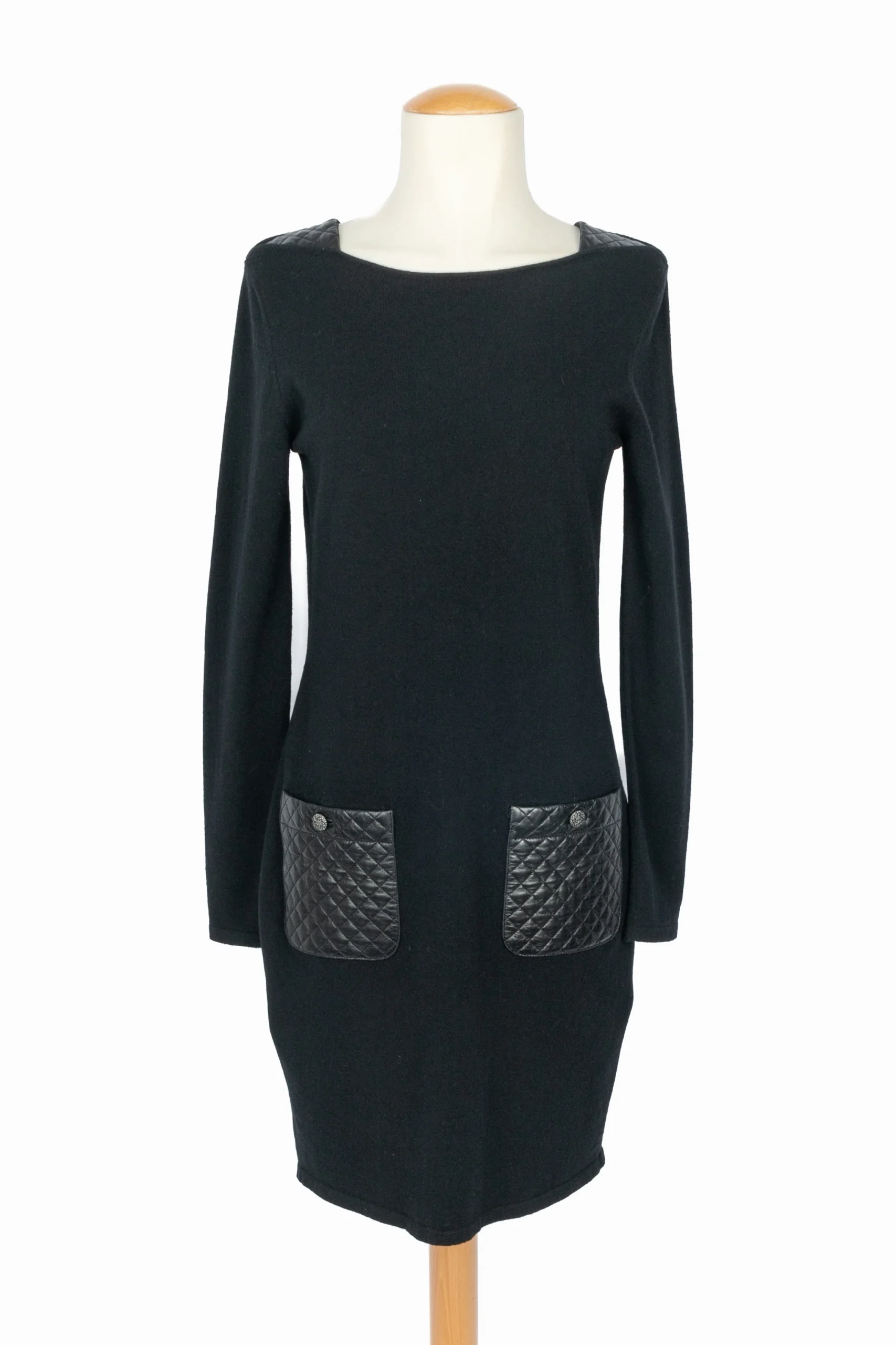 CHANEL – (Made in Italy) Robe noire en laine et cuir d’agneau. Taille 36FR. Collection circa 2010’s sous la direction artistique de Karl Lagerfeld.