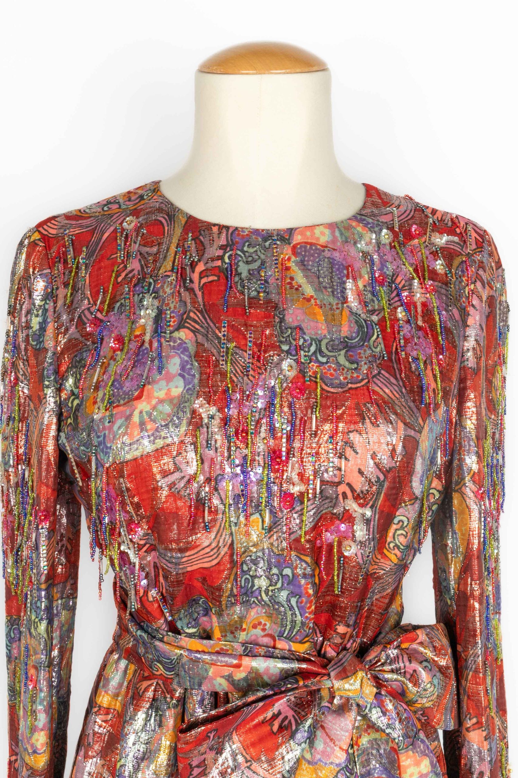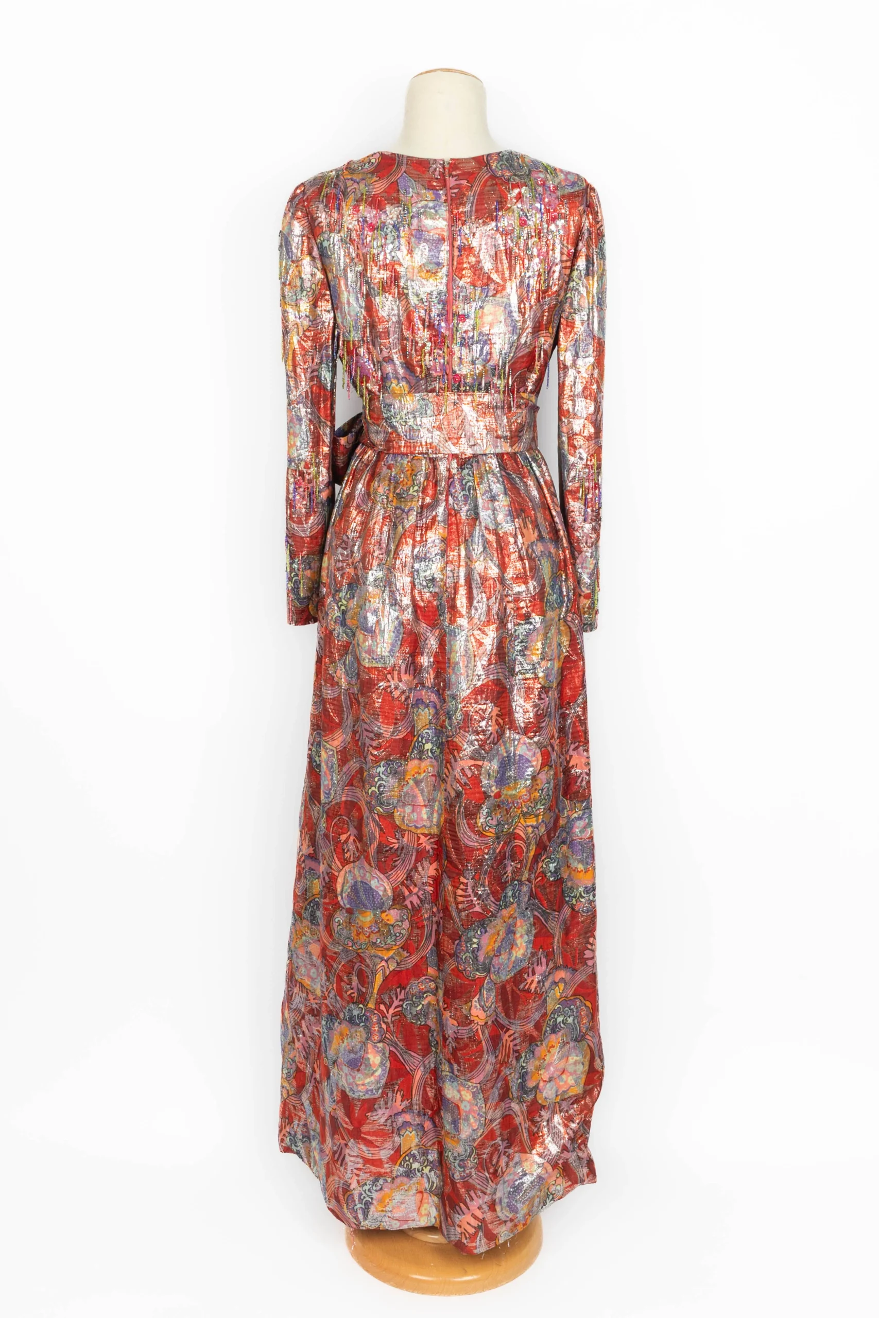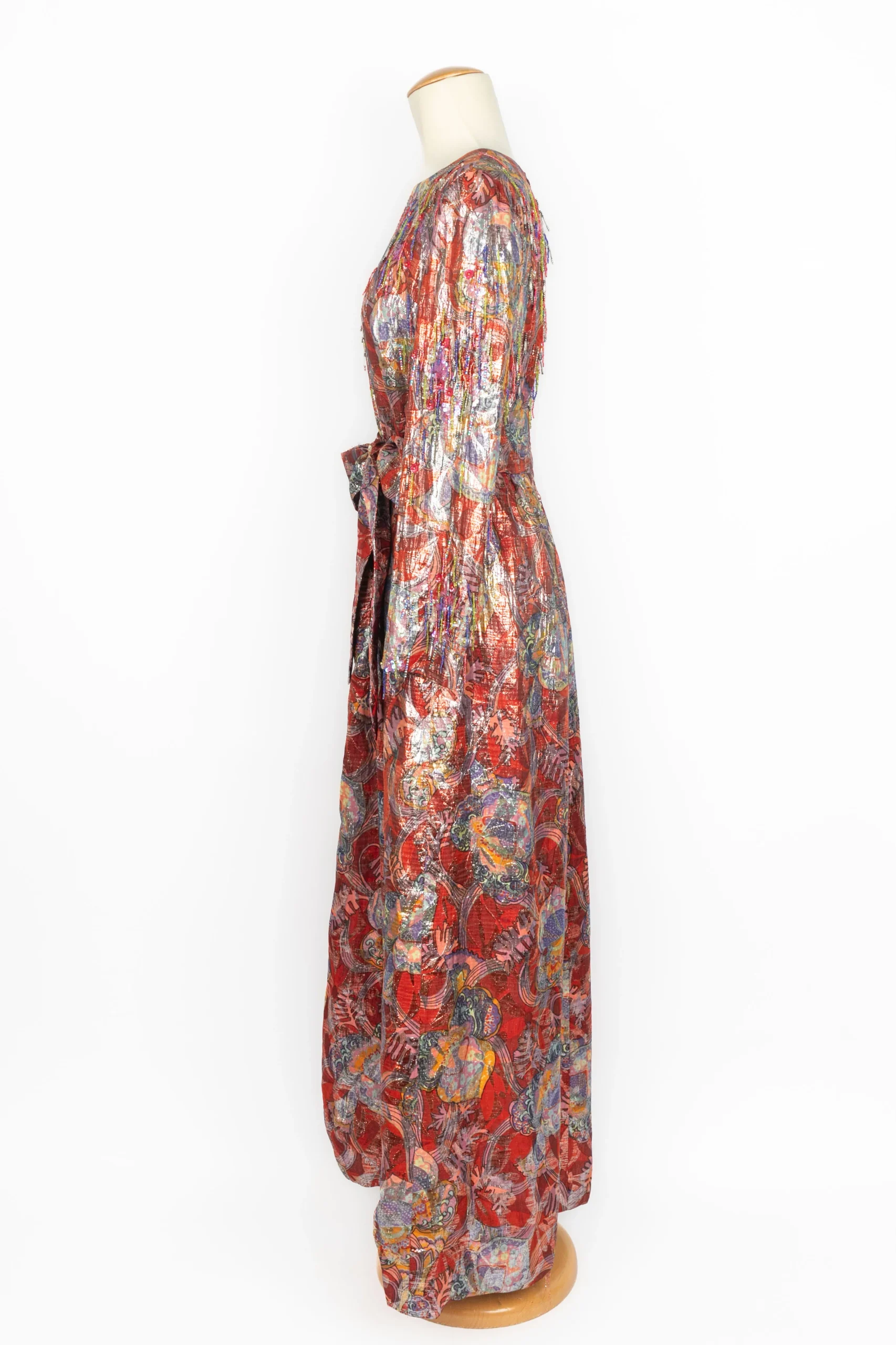 DIOR – (Made in France) Robe longue à manches longues en lamé rouge et violet cousue de franges de perles et de sequins. Elle est accompagnée d’une ceinture et elle est fendue sur l’avant. Etiquettes de taille et de composition absentes, elle convient à un 38FR. Pièce datant des années 1970.