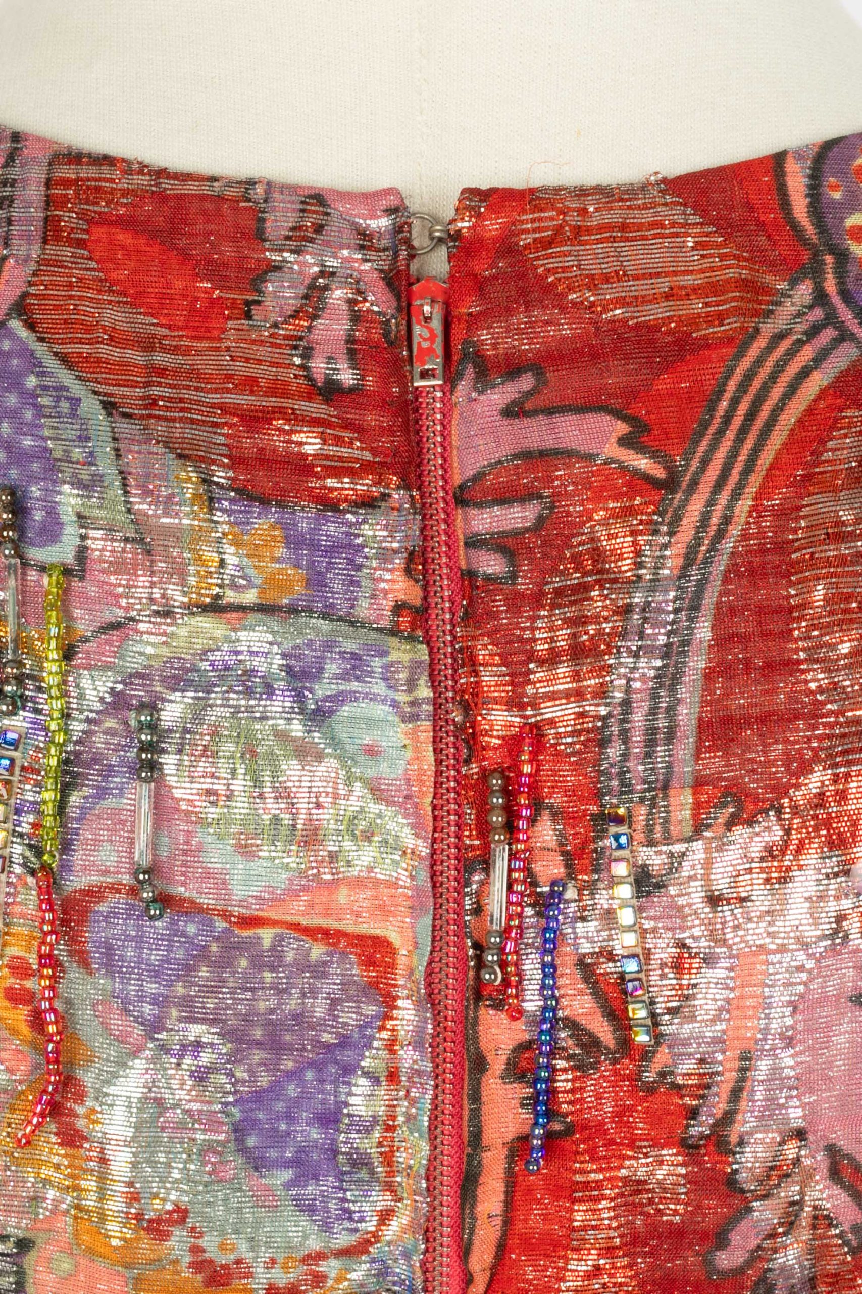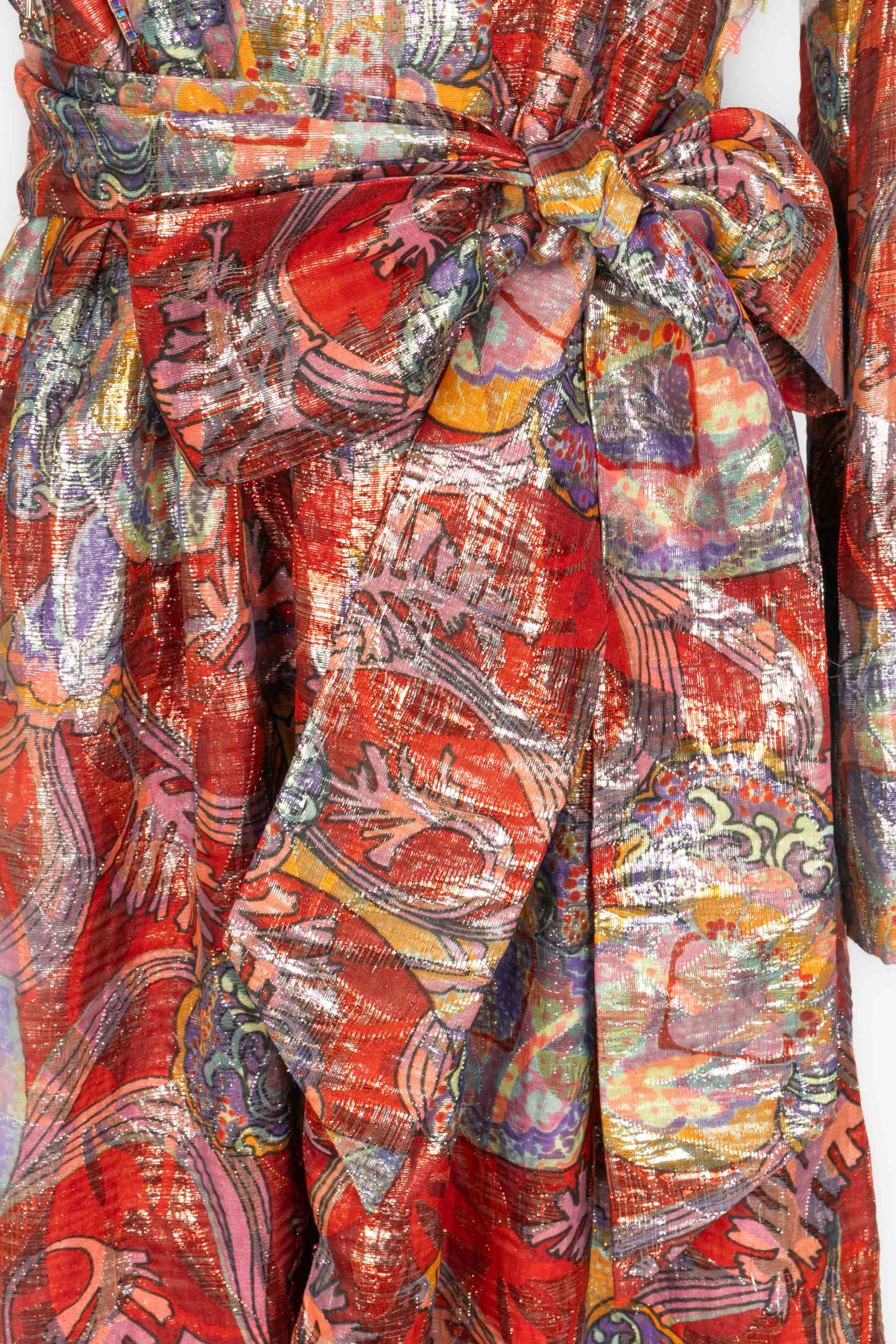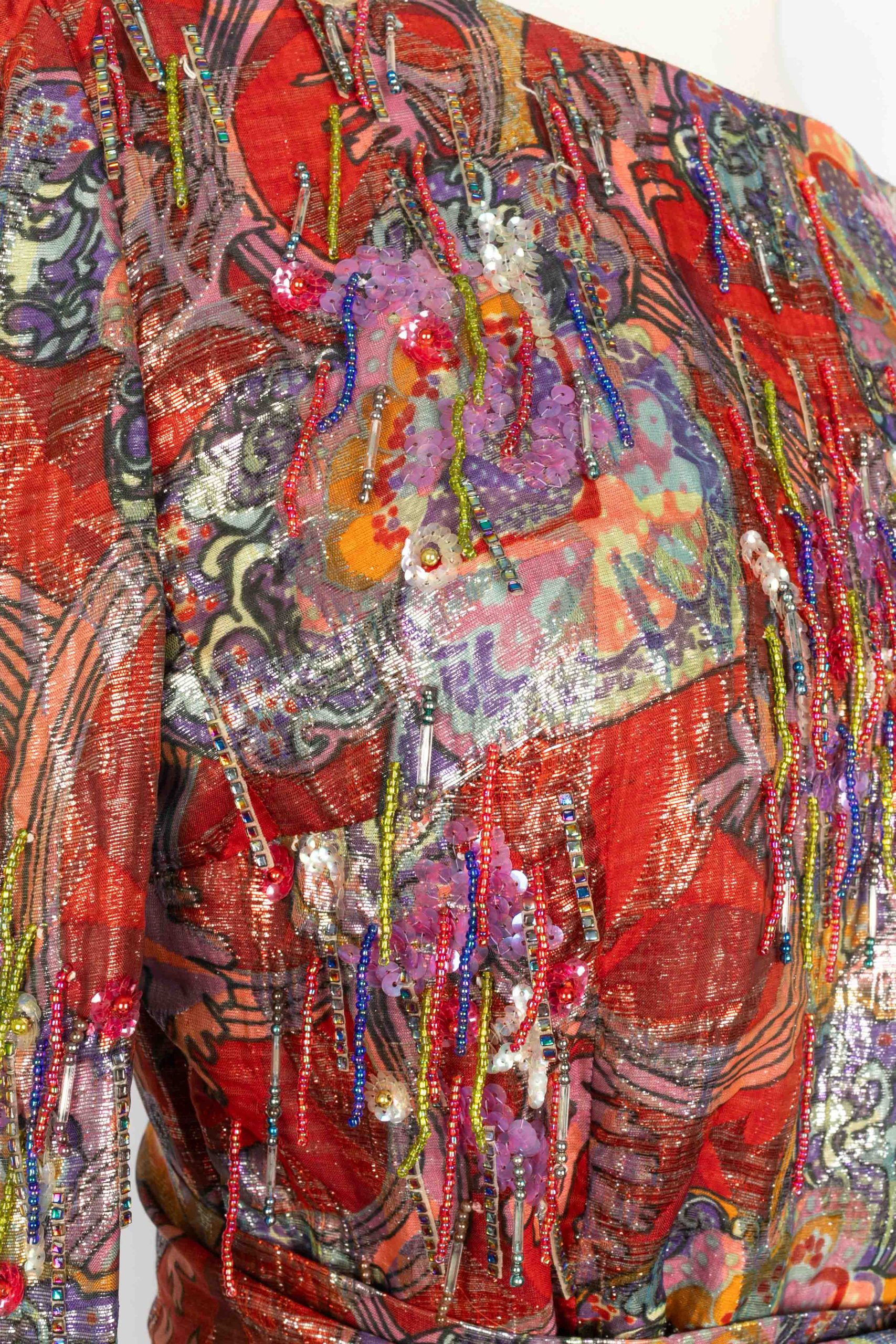 DIOR – (Made in France) Robe longue à manches longues en lamé rouge et violet cousue de franges de perles et de sequins. Elle est accompagnée d’une ceinture et elle est fendue sur l’avant. Etiquettes de taille et de composition absentes, elle convient à un 38FR. Pièce datant des années 1970.