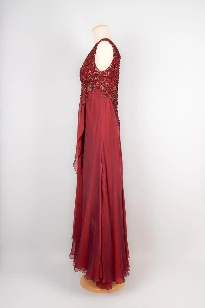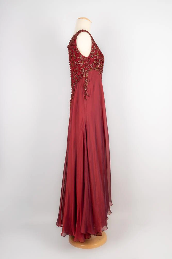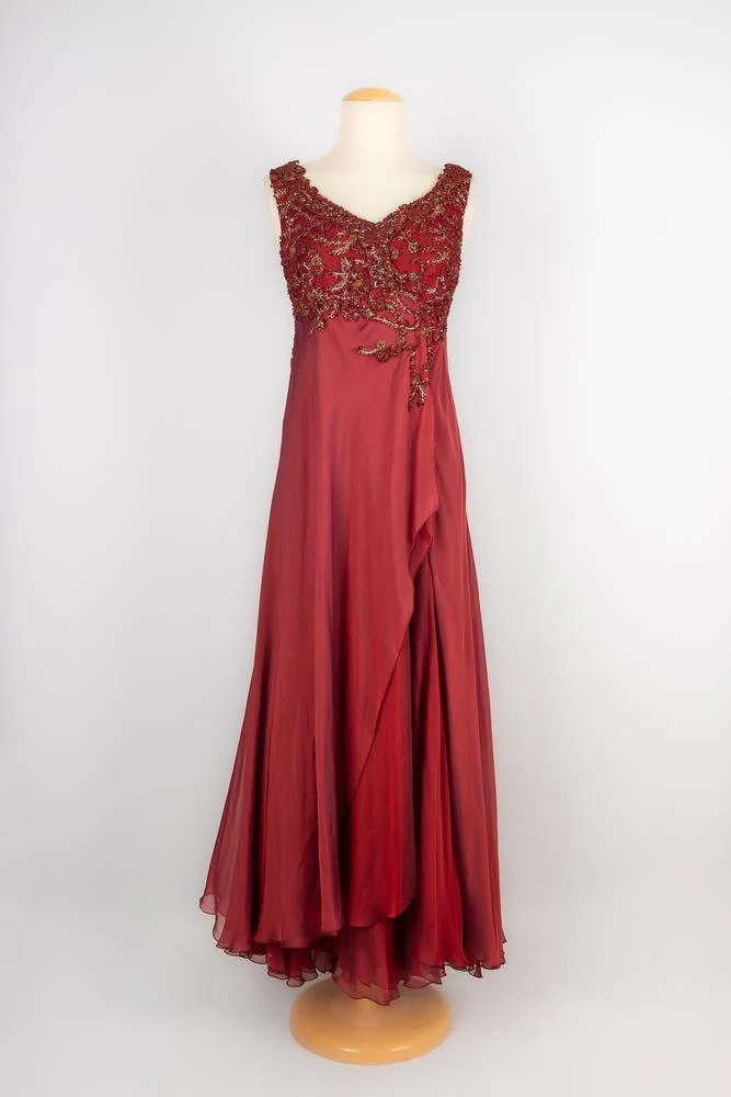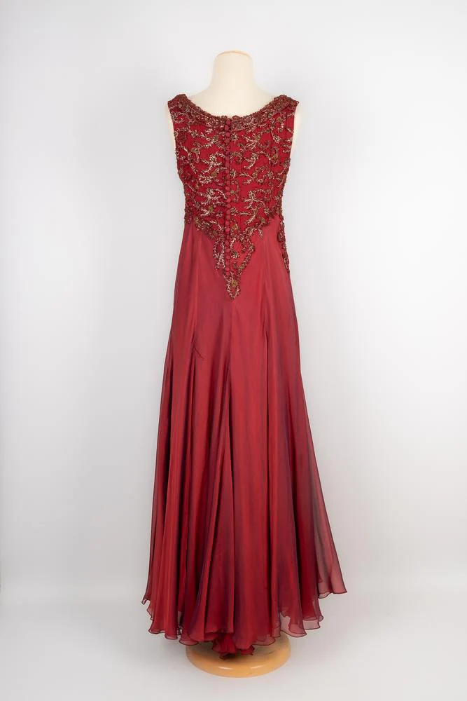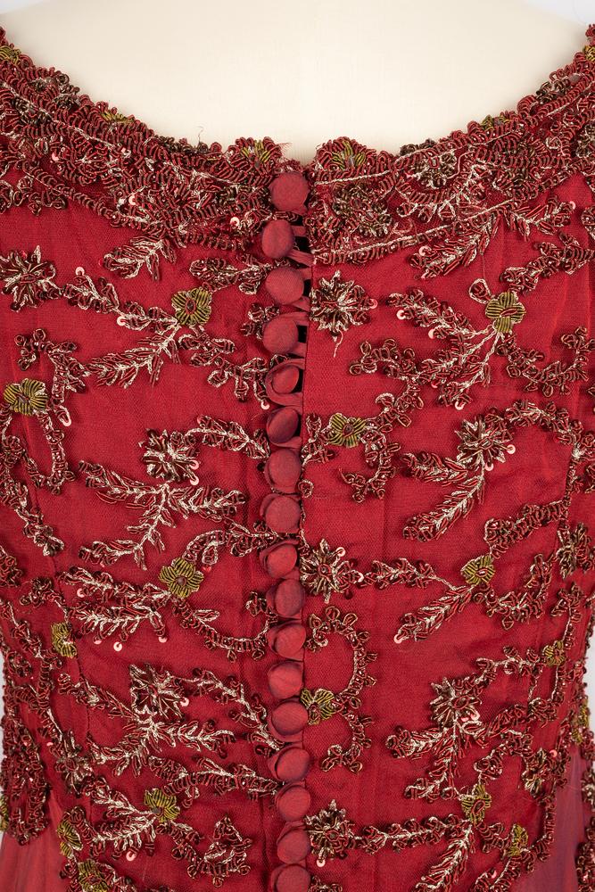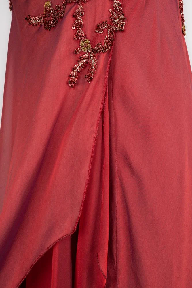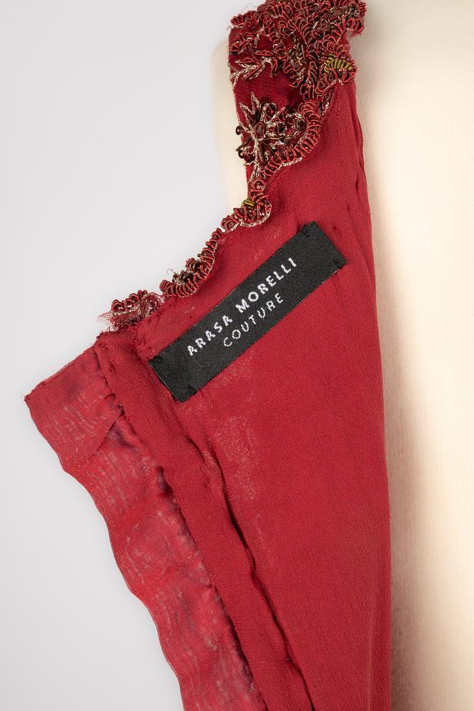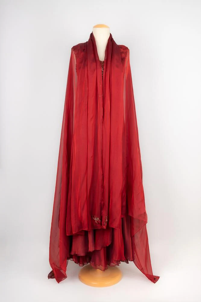 ARASA MORELLI – (Made in Spain) Longue robe en mousseline de soie bordeaux, tulle et broderie accompagnée de son étole en mousseline. Pièce signée Arasa Morelli Couture. Etiquettes de taille et de composition absentes, elle convient à un 38FR.