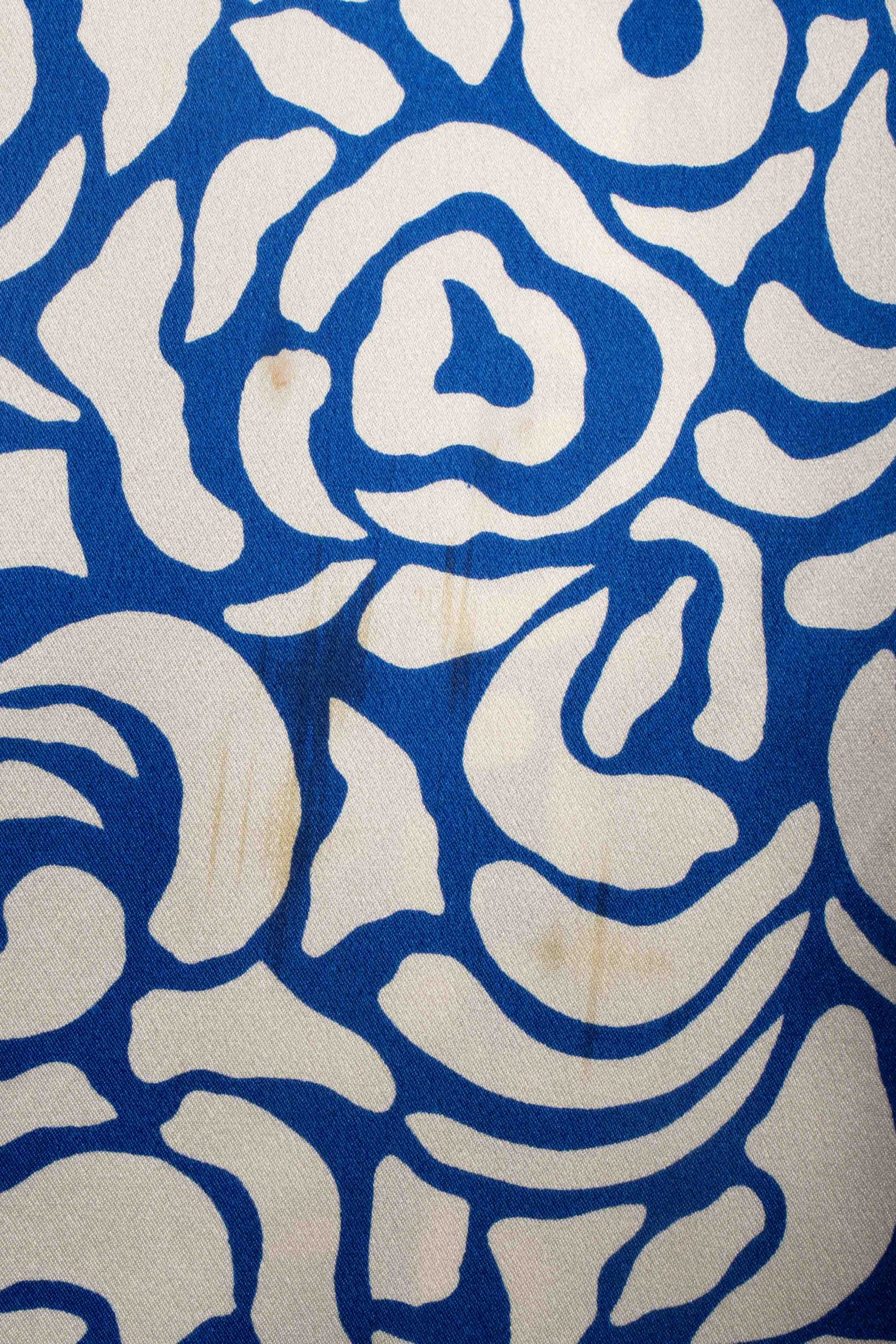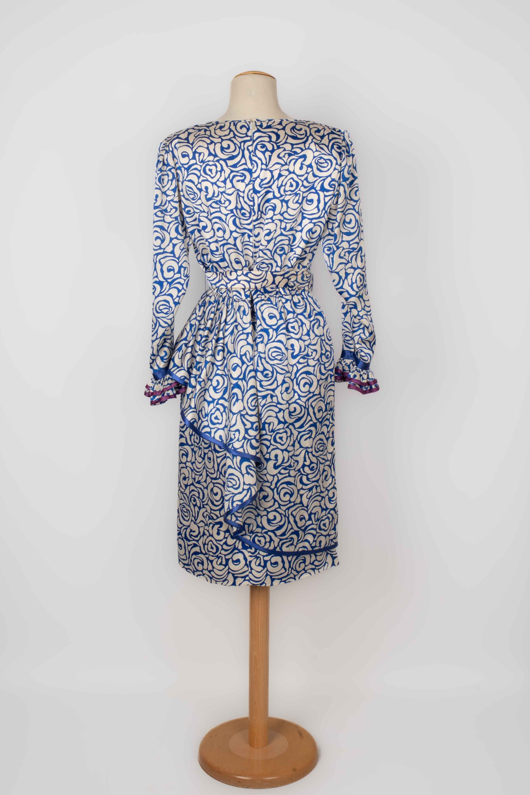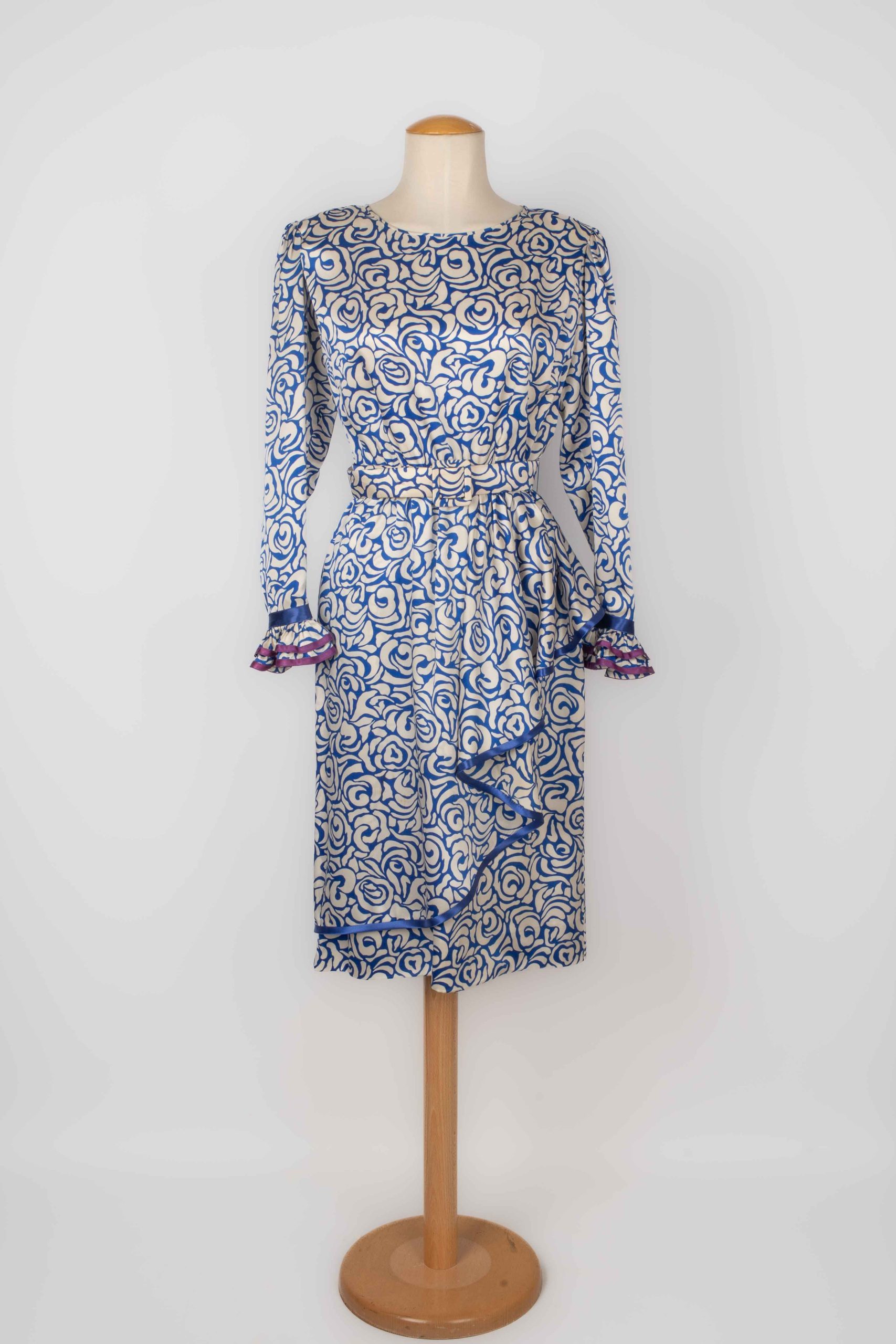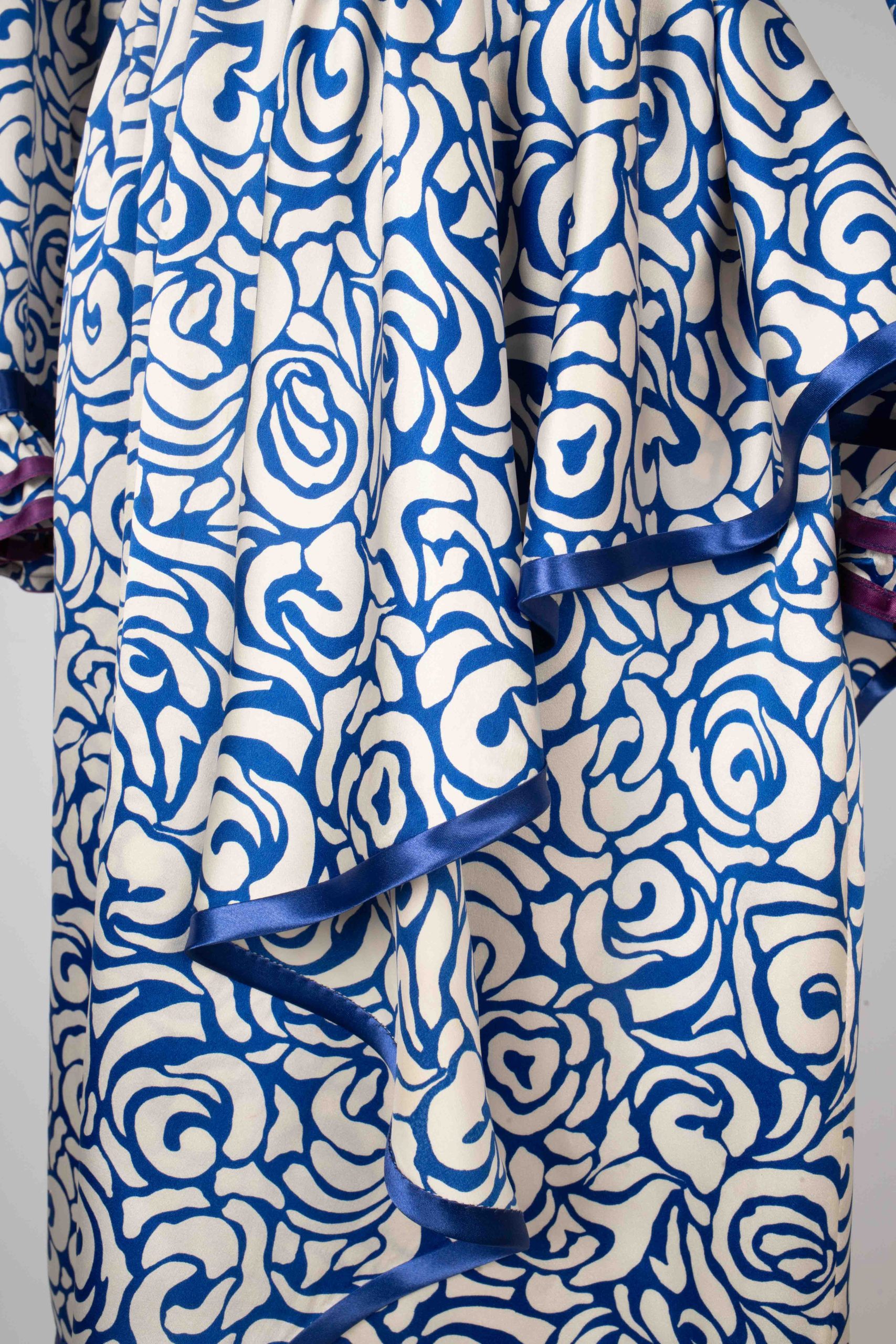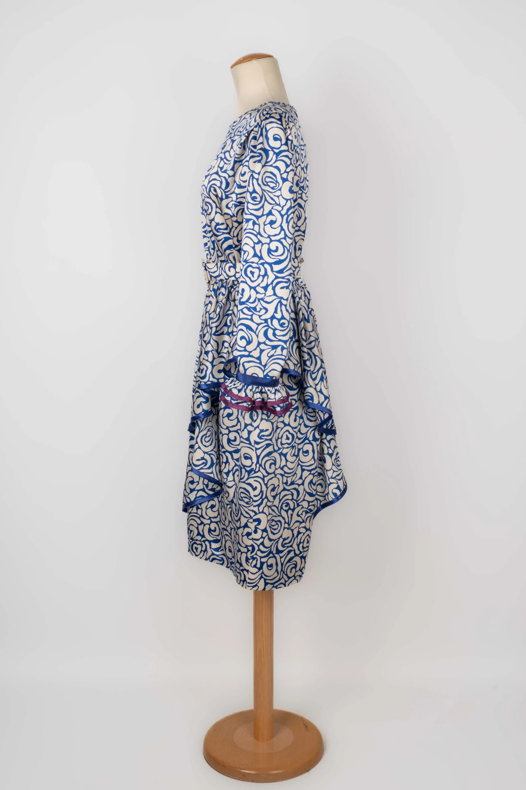 ANONYME -Robe en soie imprimée à volants et galons en satin bleu et violet. La robe est accompagnée de sa ceinture. Pas de taille indiquée, elle convient à un 38FR.