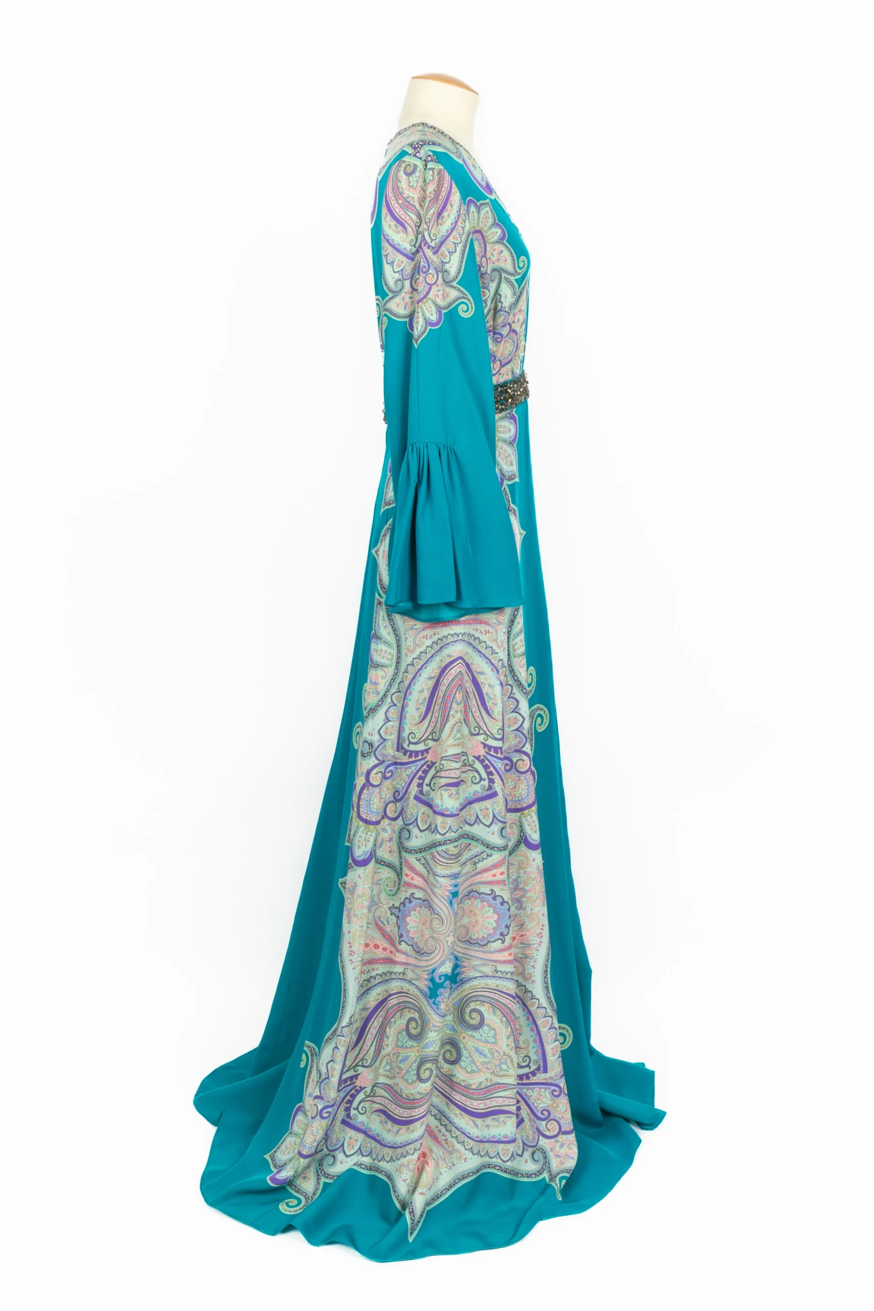 ETRO – (Made in Italy) Longue robe fluide en soie à motifs d’arabesques sur fond turquoise. Fermeture par un zip. Taille 40IT.