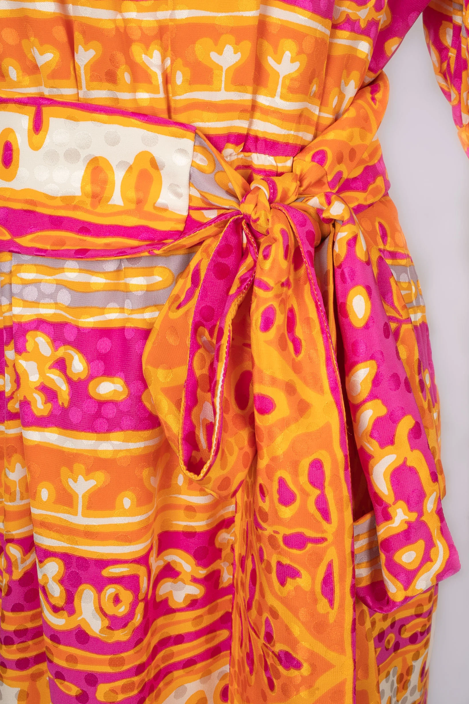 GIVENCHY -(Made in France) Robe en soie colorée. Taille 40FR. Condition : Très bon état Dimensions : Largeur d’épaules : 42 cm – Taille : 33 cm – Longueur des manches : 36 cm – Longueur : 102 cm