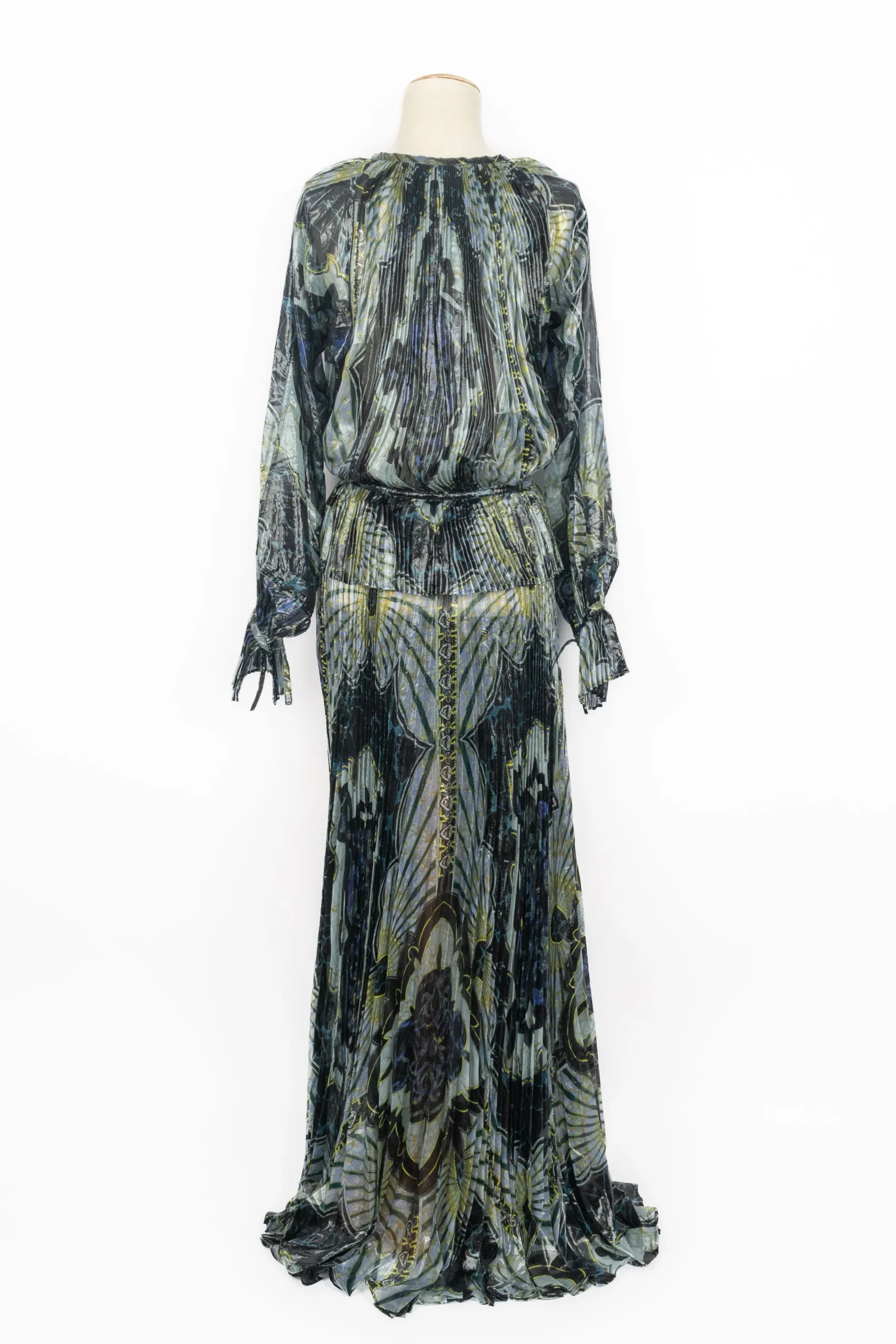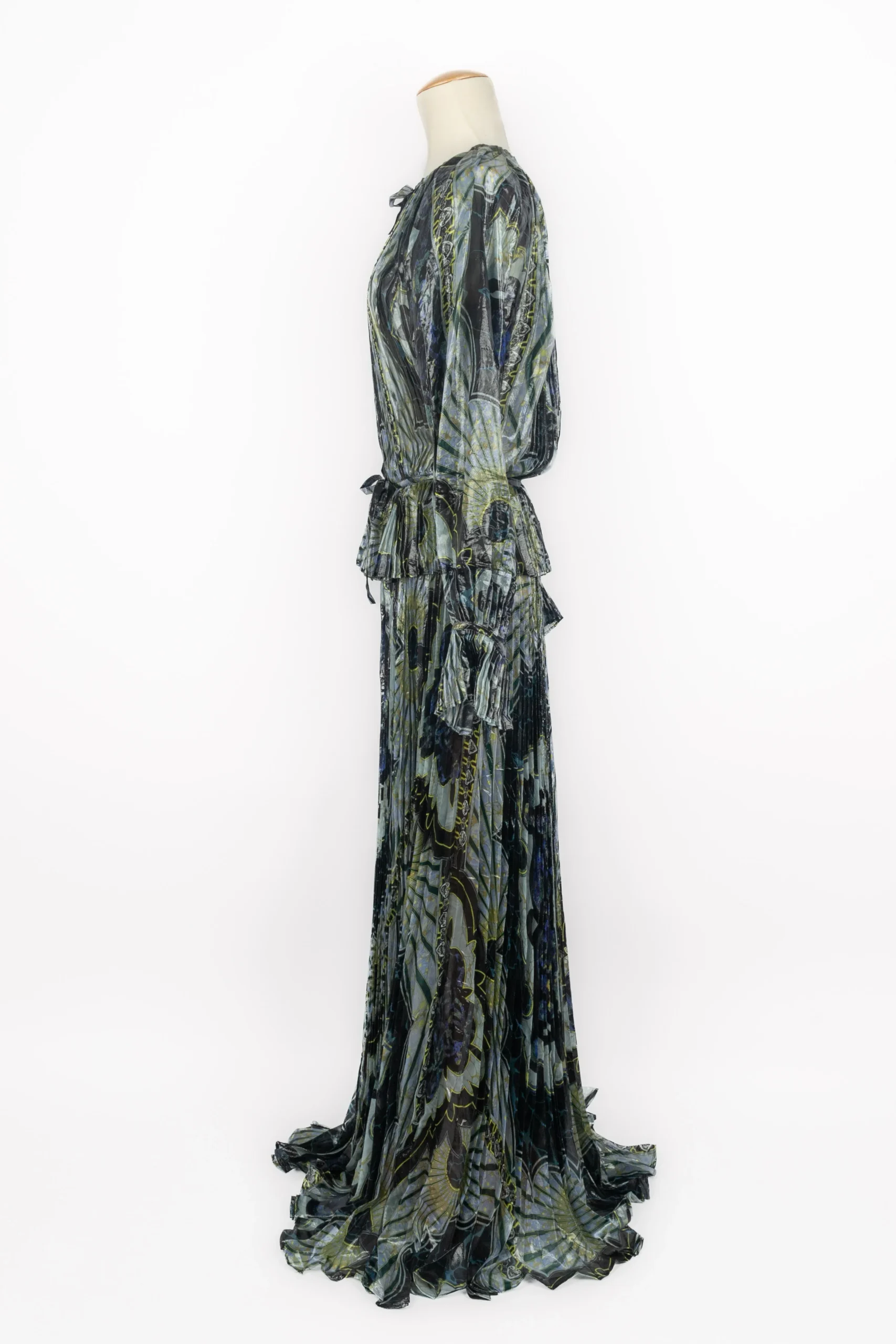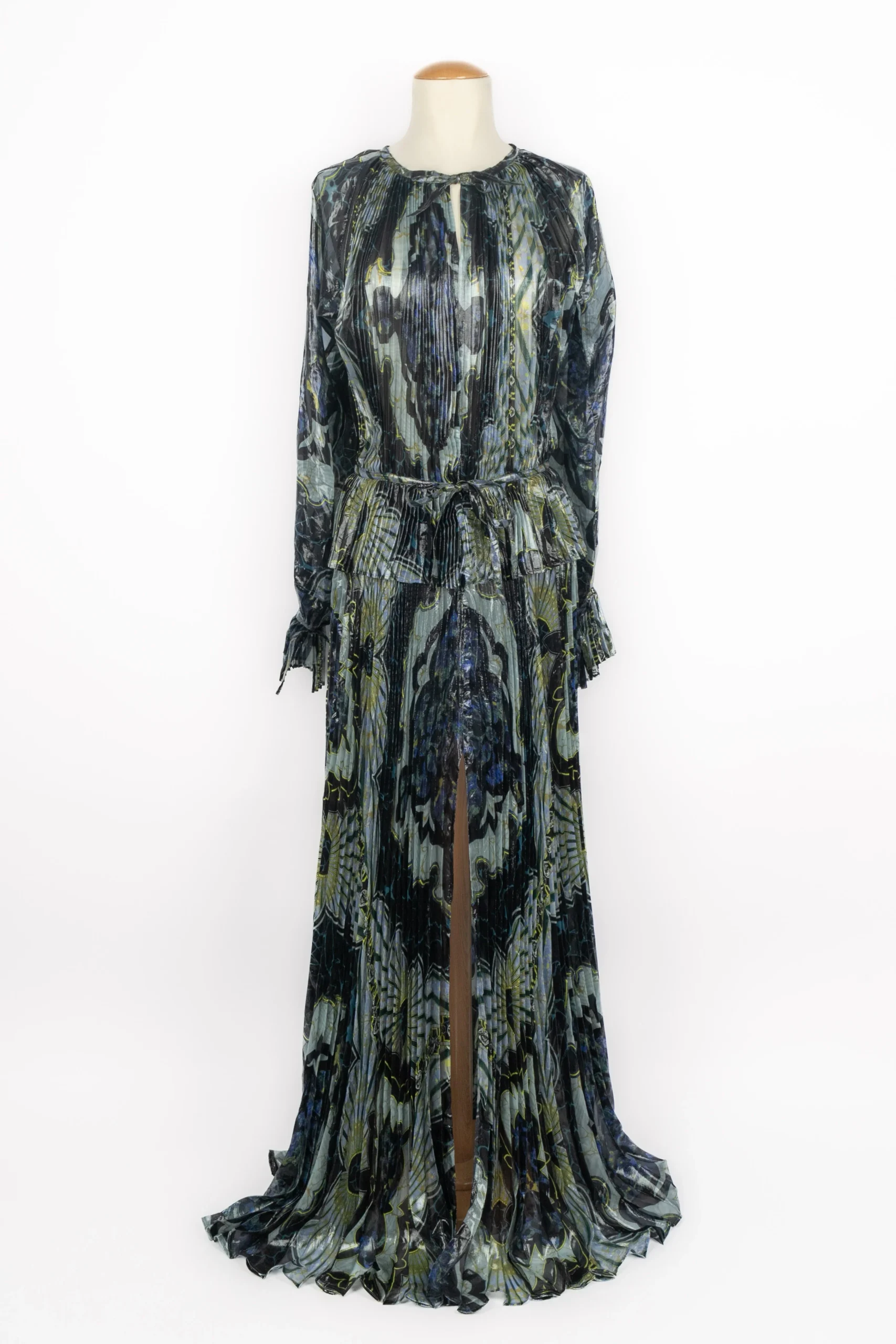 PUCCI – (Made in Italy) Robe longue en soie plissée fendue devant à motifs de fleurs stylisées dans les tons de bleu, jaune et noir rehaussés de fils brillants. Taille 42IT. Condition : Très bon état Dimensions : Taille : 35 cm – Longueur des manches : 65 cm – Longueur : environ 165 cm