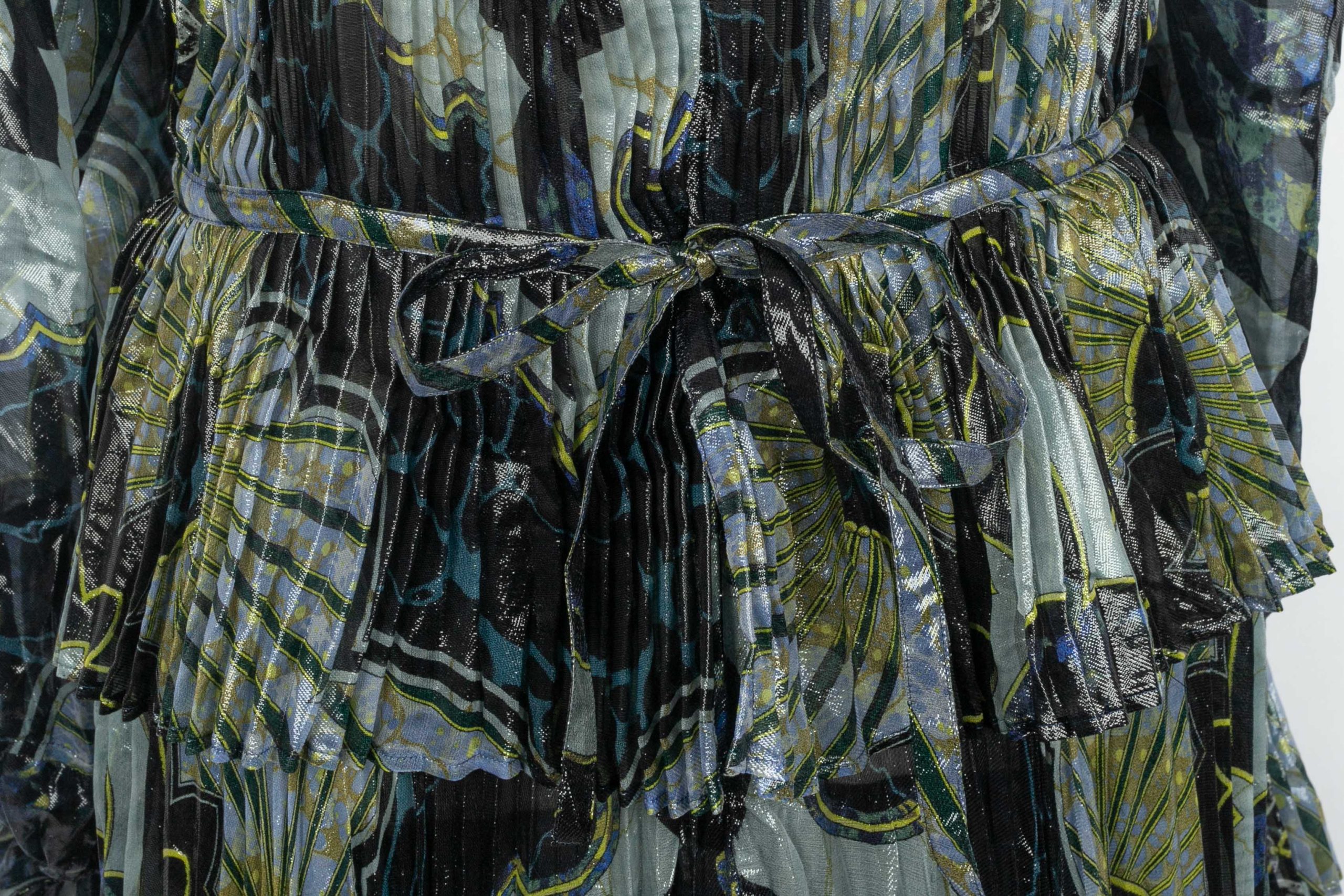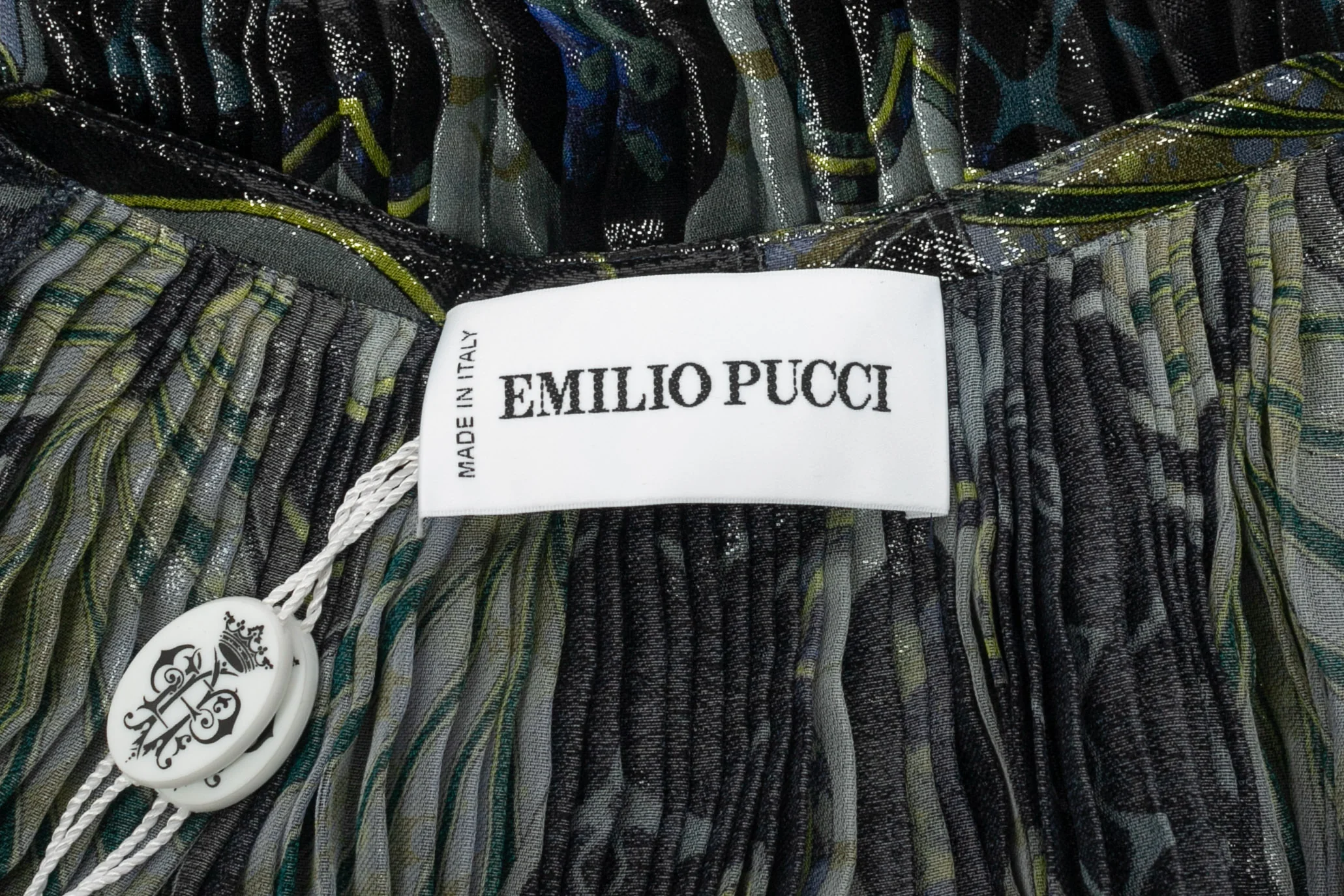 PUCCI – (Made in Italy) Robe longue en soie plissée fendue devant à motifs de fleurs stylisées dans les tons de bleu, jaune et noir rehaussés de fils brillants. Taille 42IT.