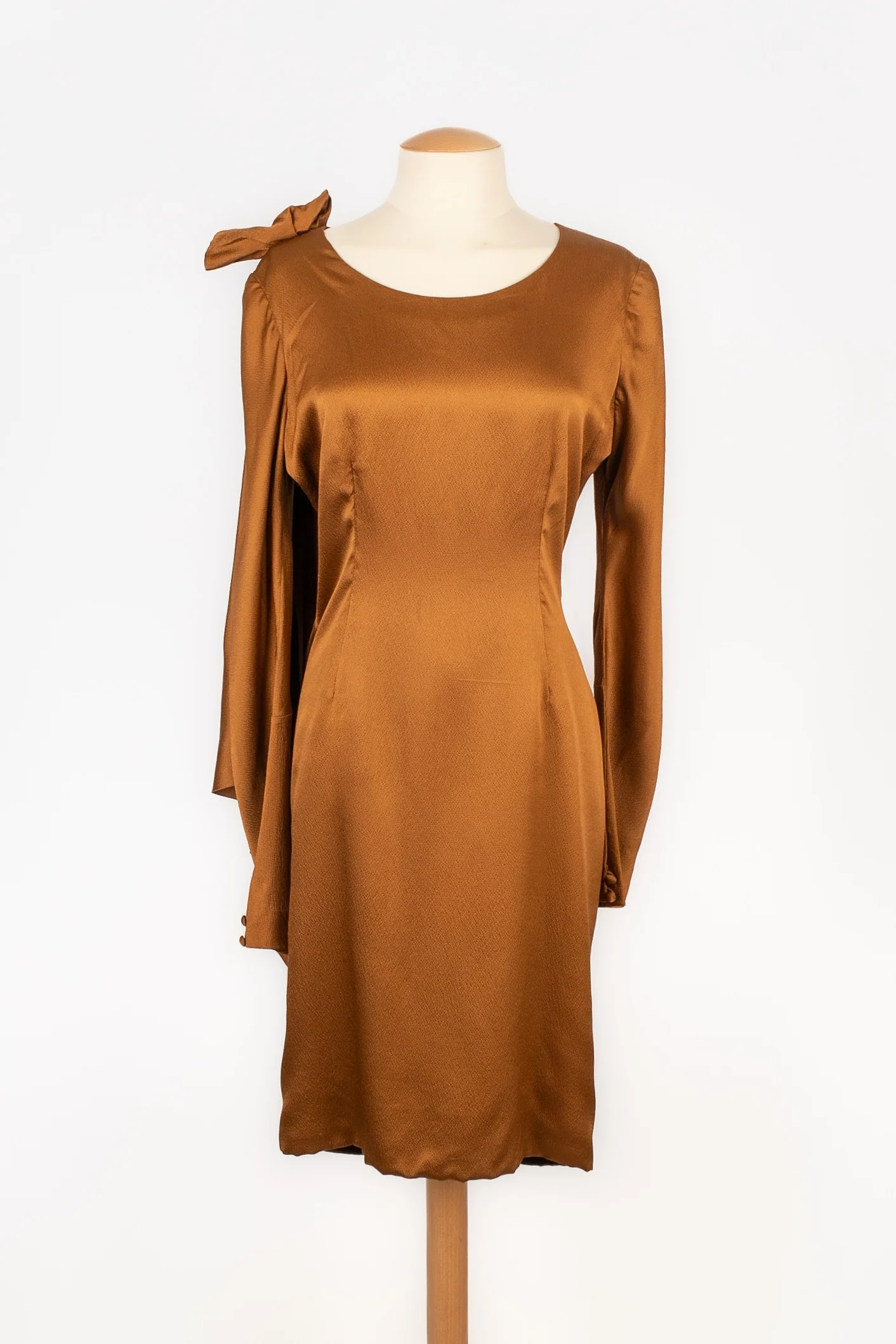 TORRENTE -Robe en soie marron glacé. Etiquettes de taille et de marque absentes, elle convient à un 36FR.
