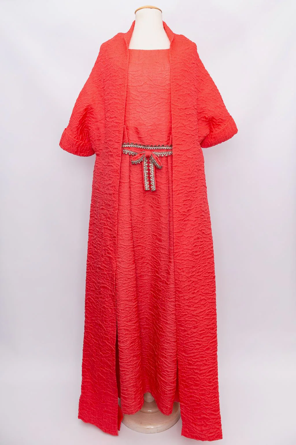 VALENS -Robe et son boléro en organza gaufré dans les tons de rose. Etiquettes de taille et de compositions absentes, elle correspond à une taille 40FR.