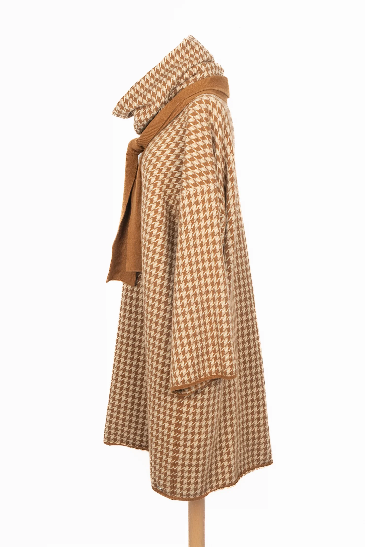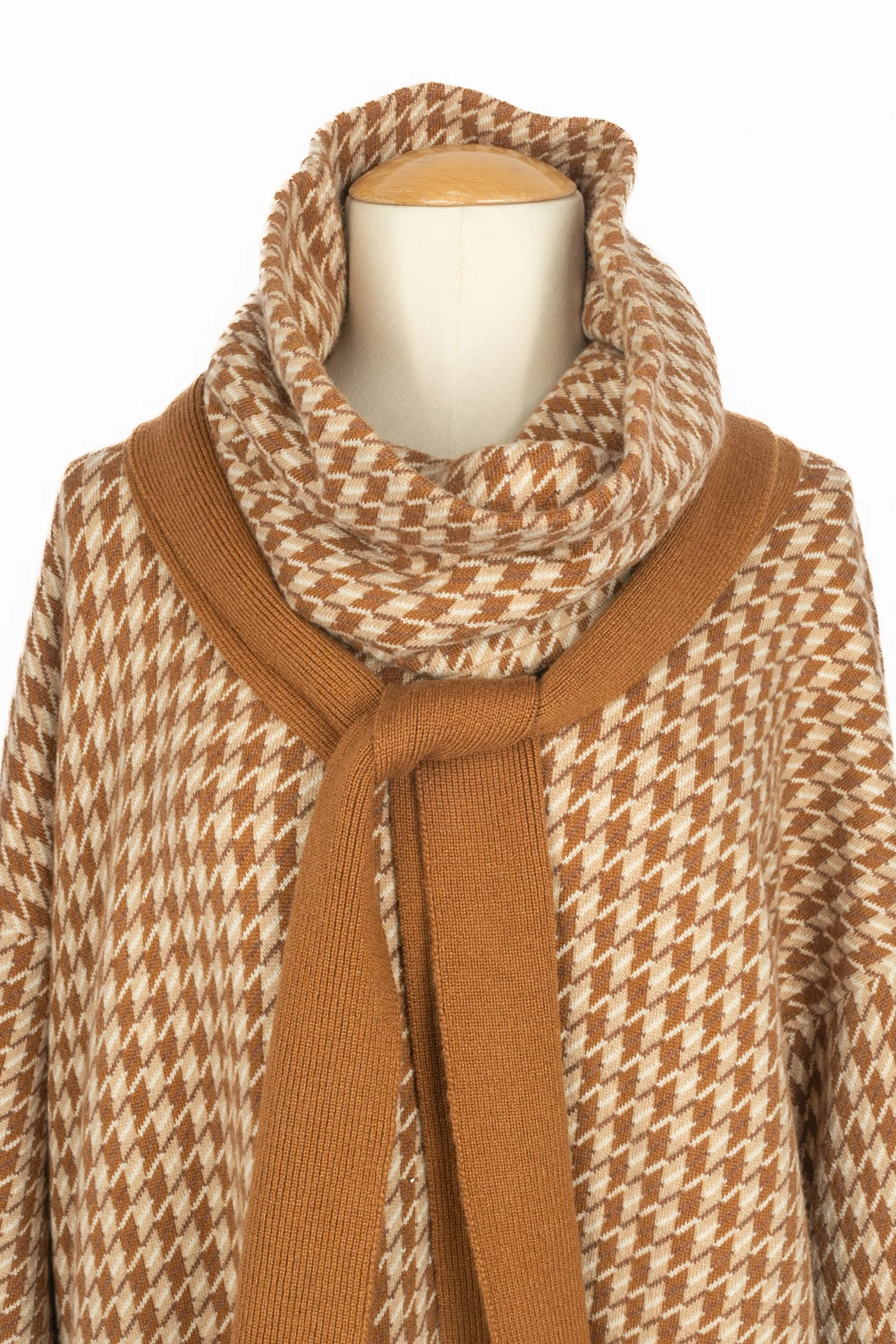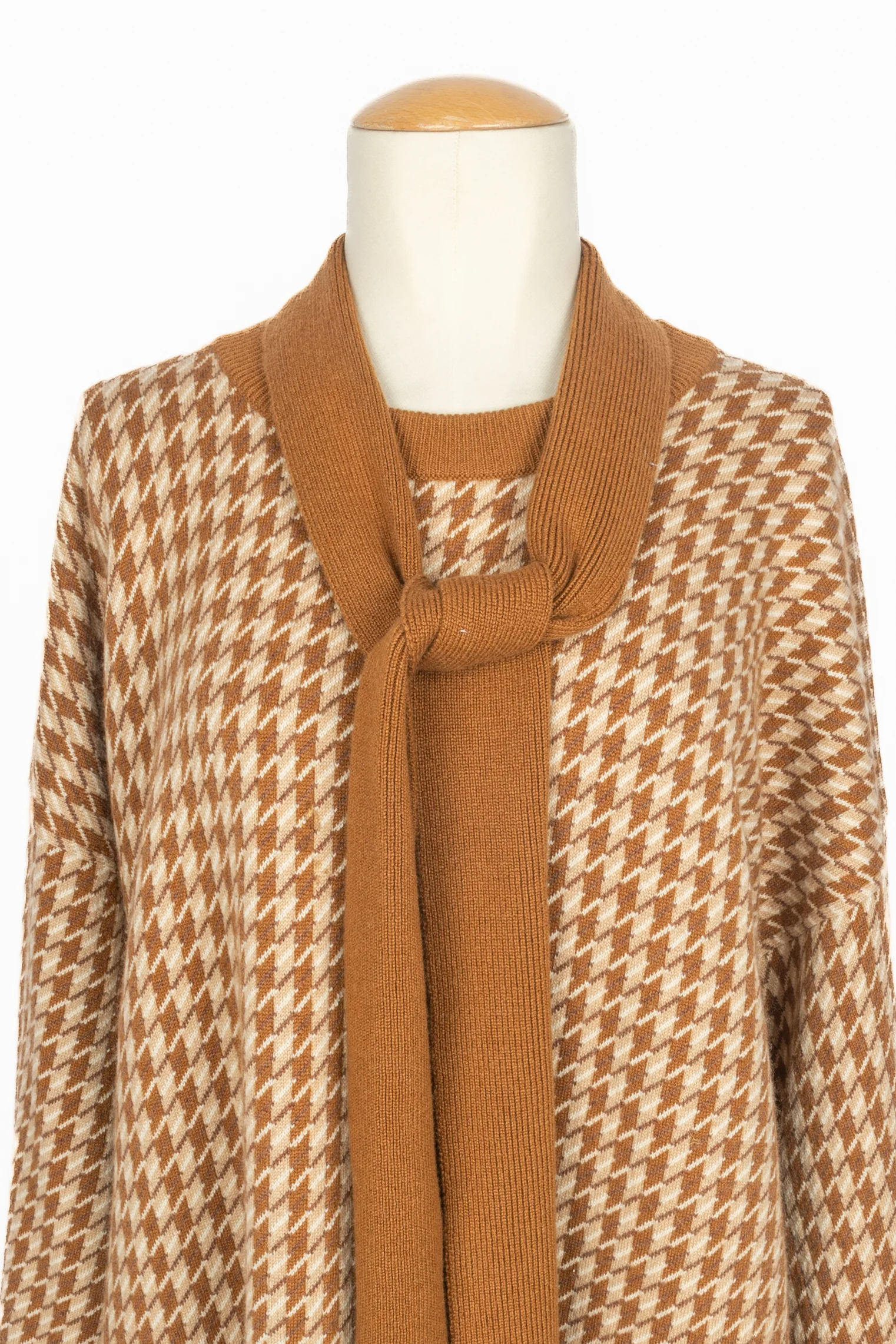 HERMÈS – (Made in United Kingdom) Robe pull en cachemire à motif pied-de-poule dans les tons de beige et de marron. Tour de cou assorti et petite écharpe marron. Taille indiquée 42FR. Collection Pre-Fall 2019 sous la direction artistique de Nadège Vanhee.